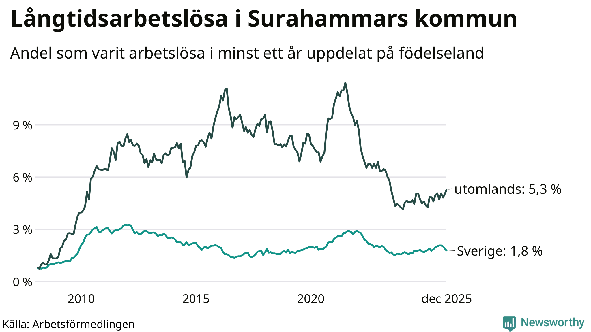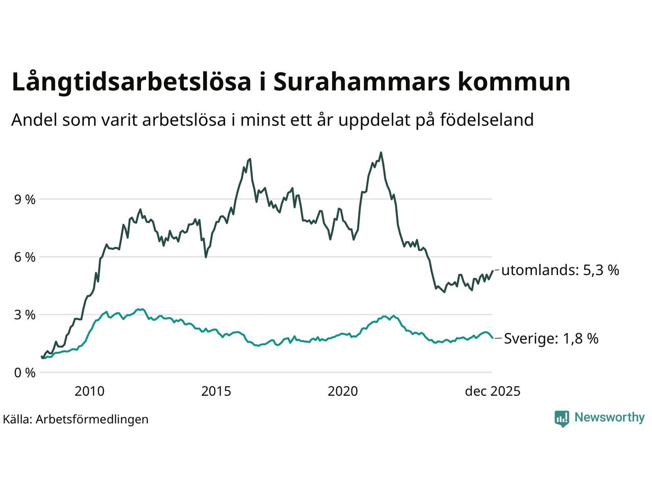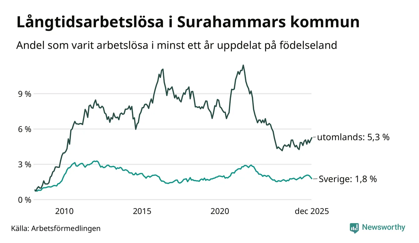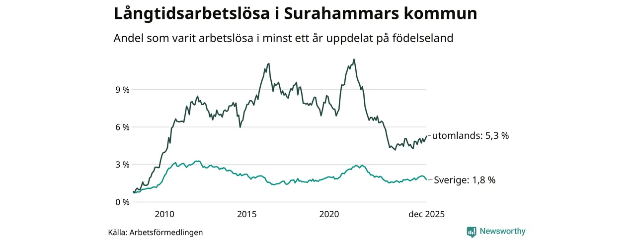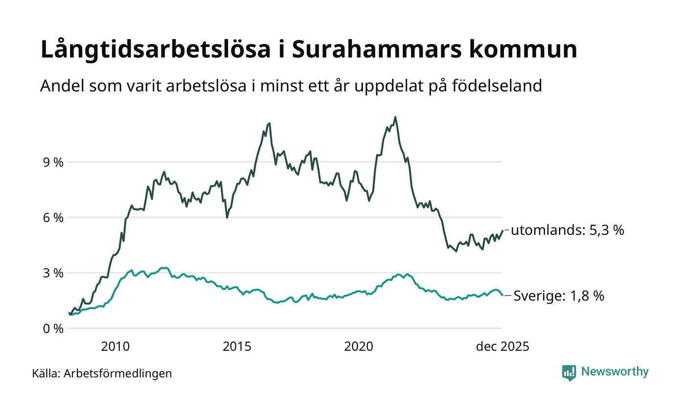 65 av de långtidsarbetslösa i Surahammar är födda i Sverige, medan 45 är födda utomlands. Det innebär att långtidsarbetslösheten bland Sverigefödda är 1,8 procent, medan den är tre gånger så hög – 5,3 procent – bland födda utomlands. Även i riket som helhet är arbetslösheten högre bland utrikesfödda.