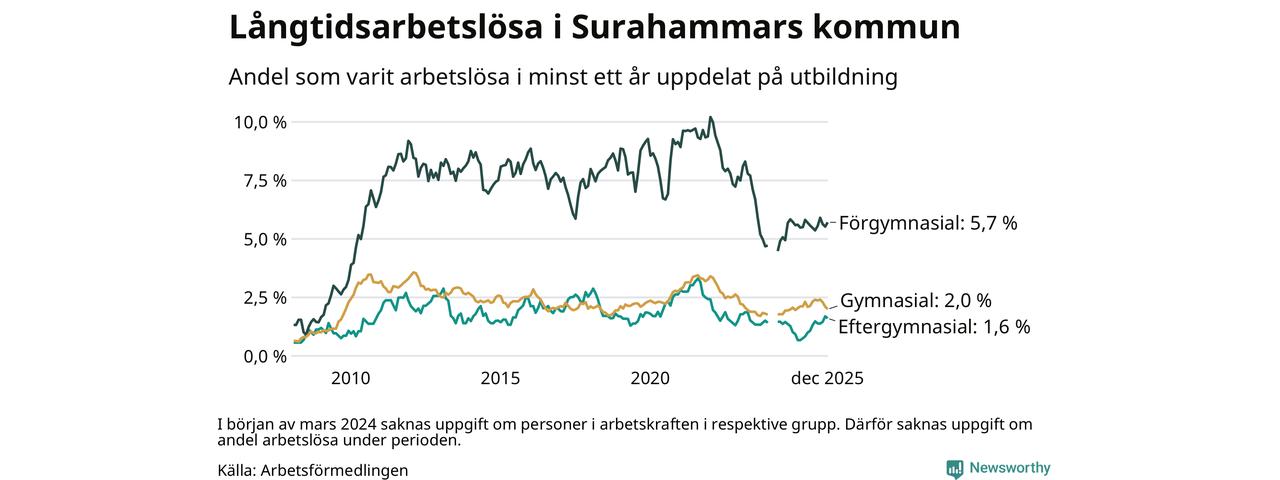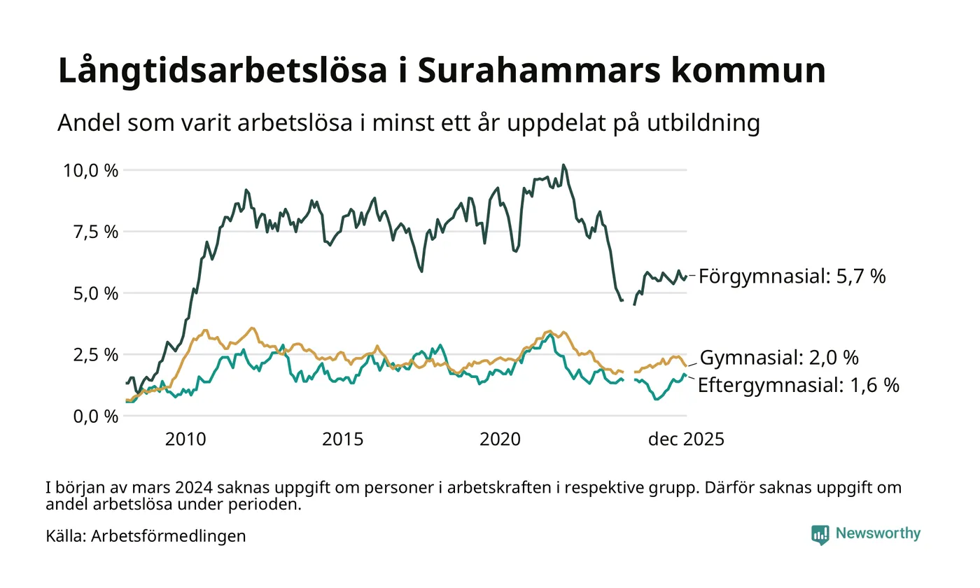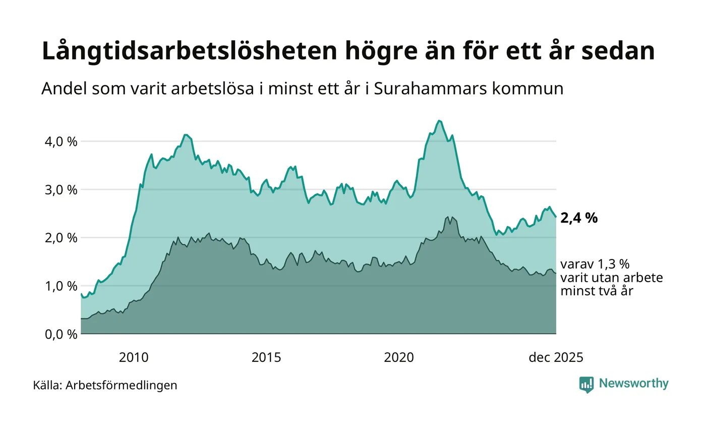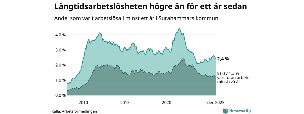 Andelen som varit utan arbete i minst ett år i Surahammar i december var högre än för ett år sedan. Men jämfört med i november har antalet långtidsarbetslösa minskat.