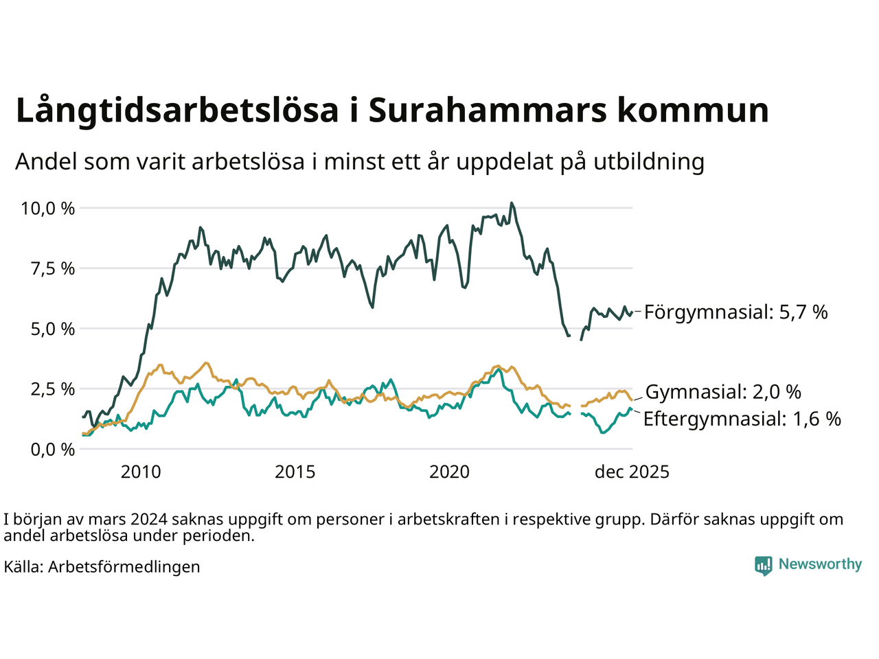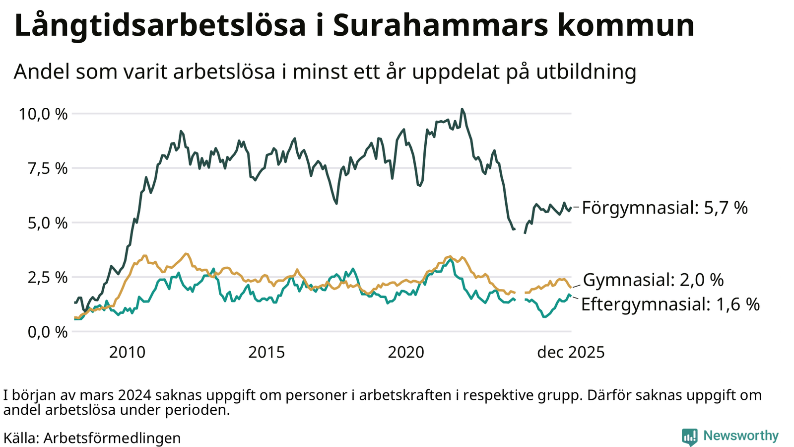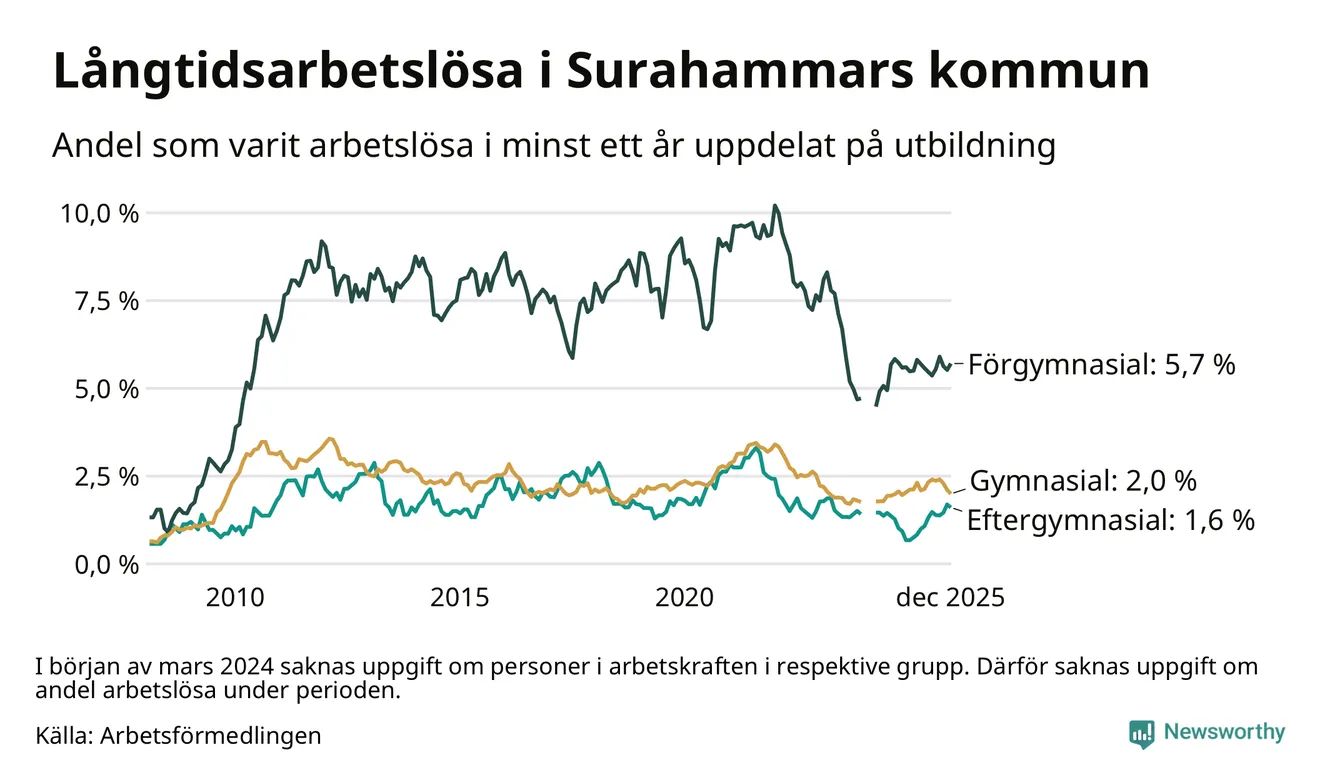 Andelen som varit utan arbete i minst ett år i Surahammar i december var högre än för ett år sedan. Men jämfört med i november har antalet långtidsarbetslösa minskat.