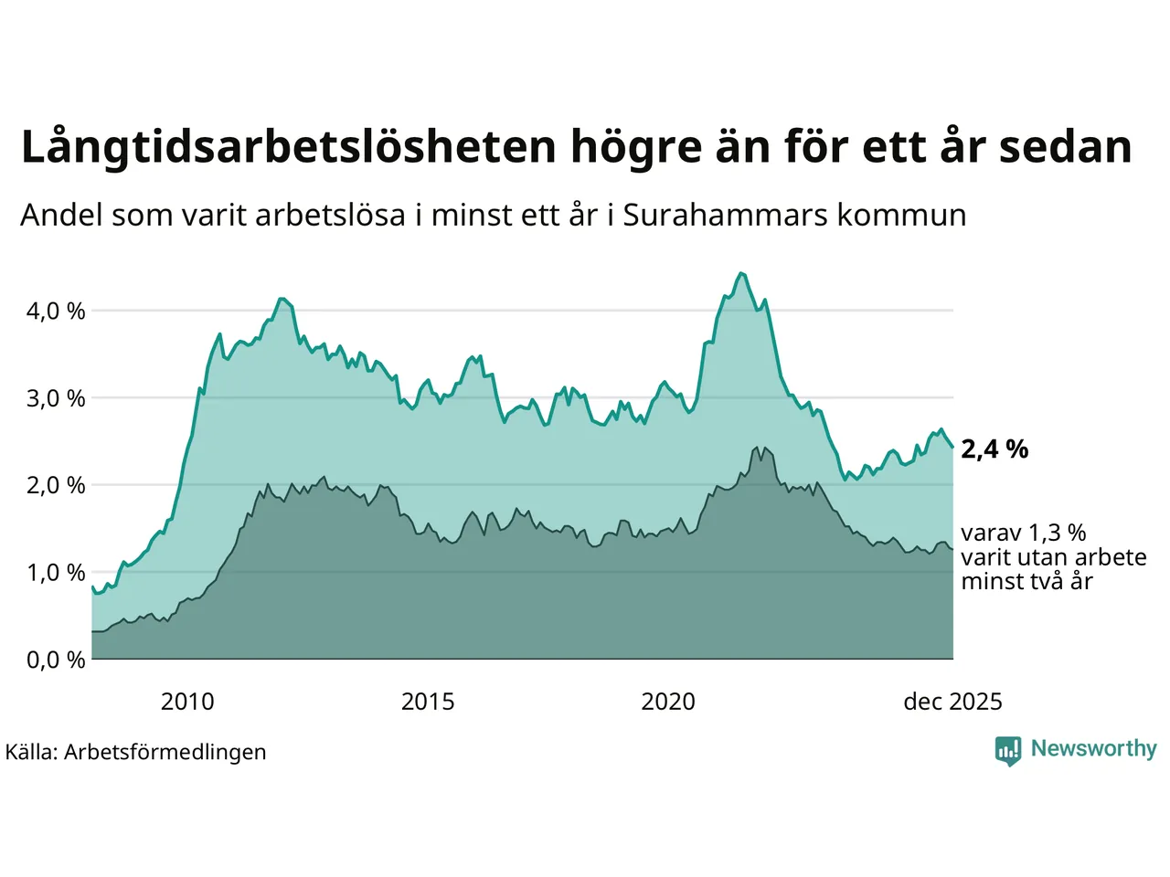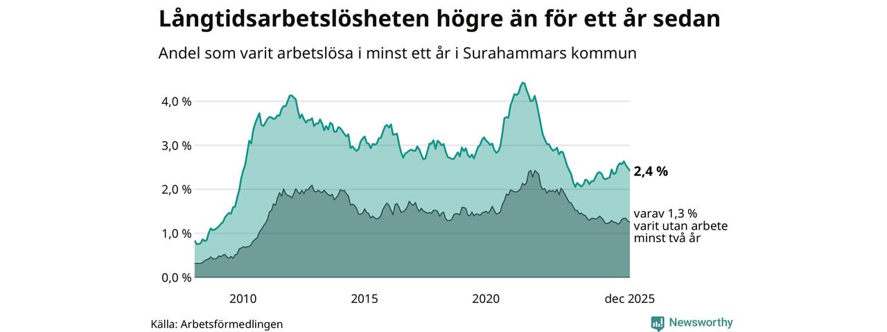I december hade 110 Surahammarsbor varit arbetslösa i minst ett år, vilket är tre färre än månaden innan. 110 personer motsvarar 2,4 procent av arbetskraften i kommunen – andelen långtidsarbetslösa är 0,2 procentenheter högre än samma månad för ett år sedan.