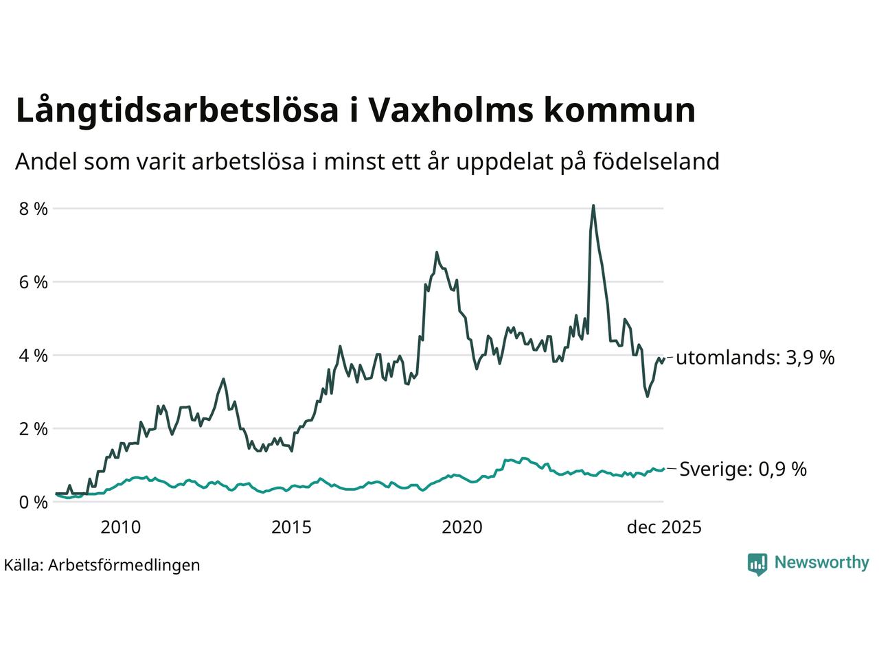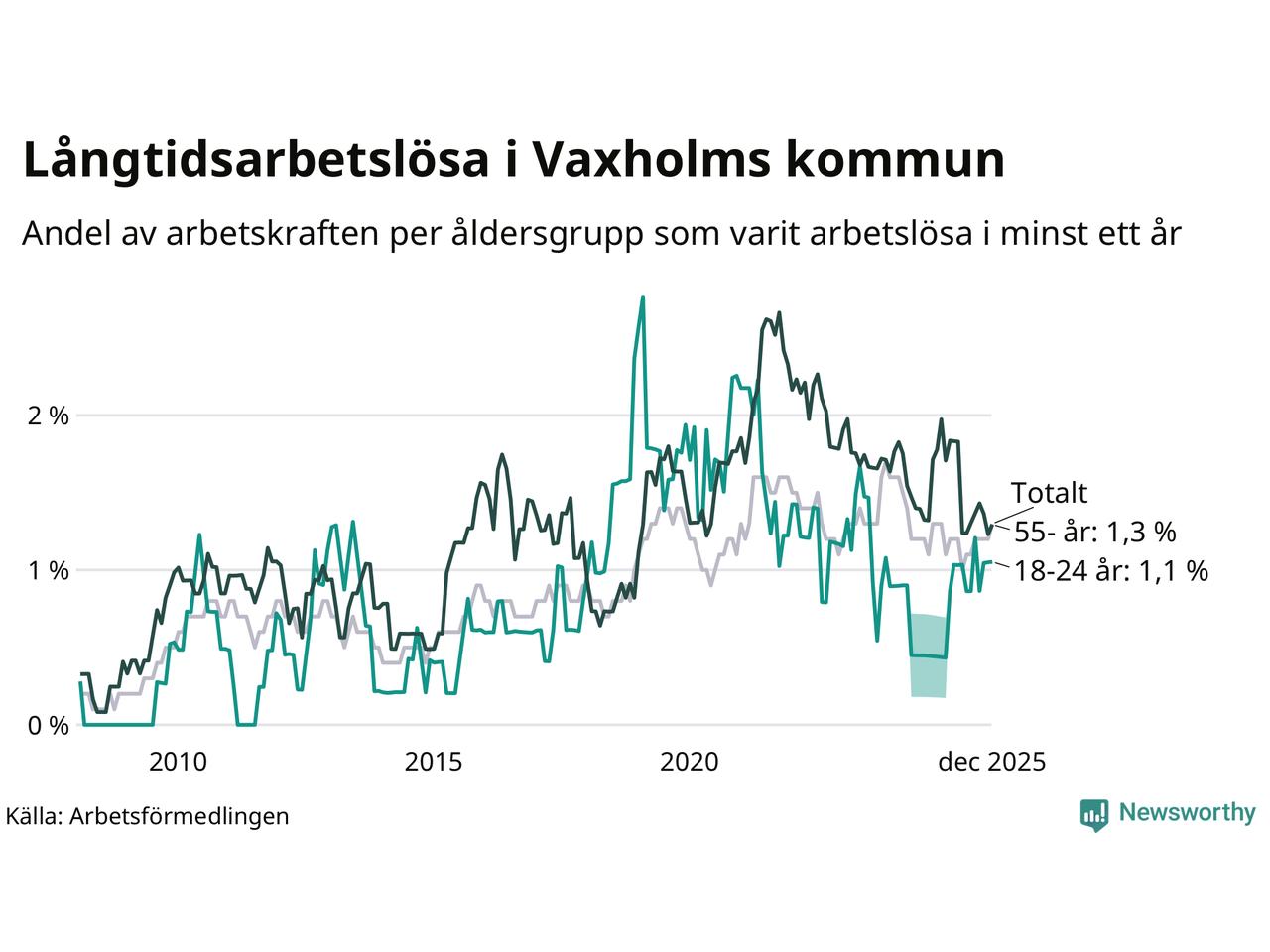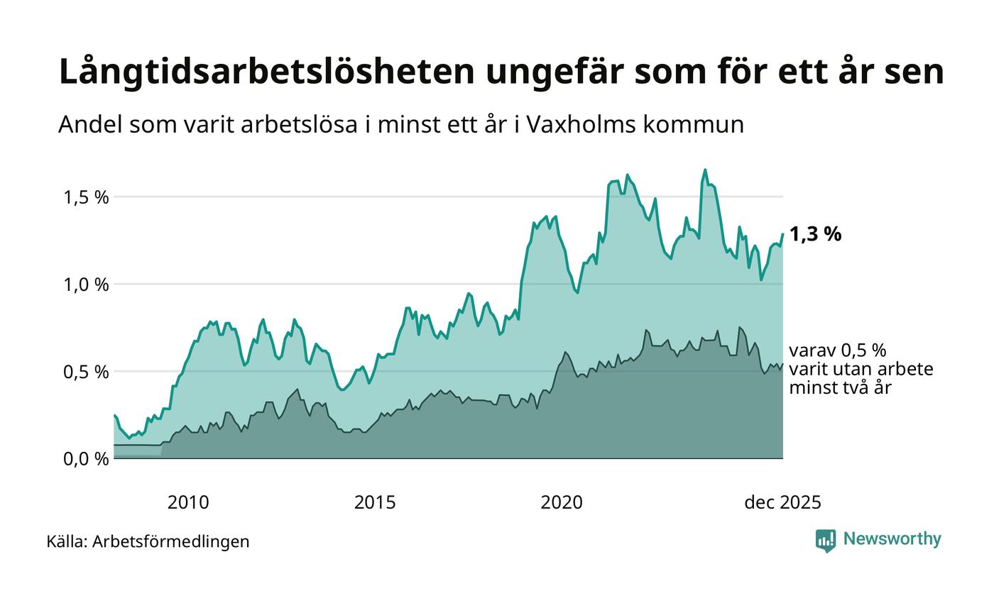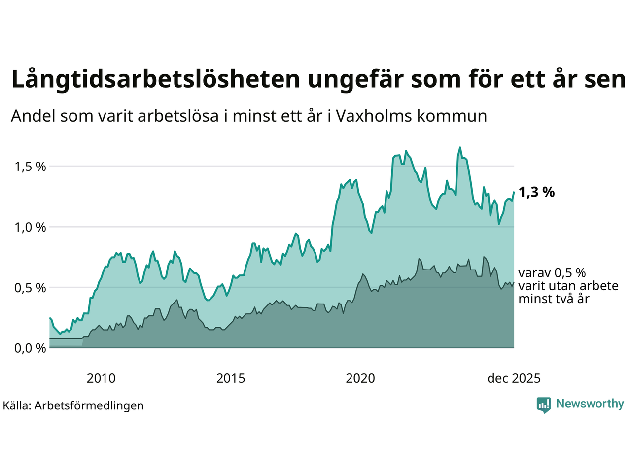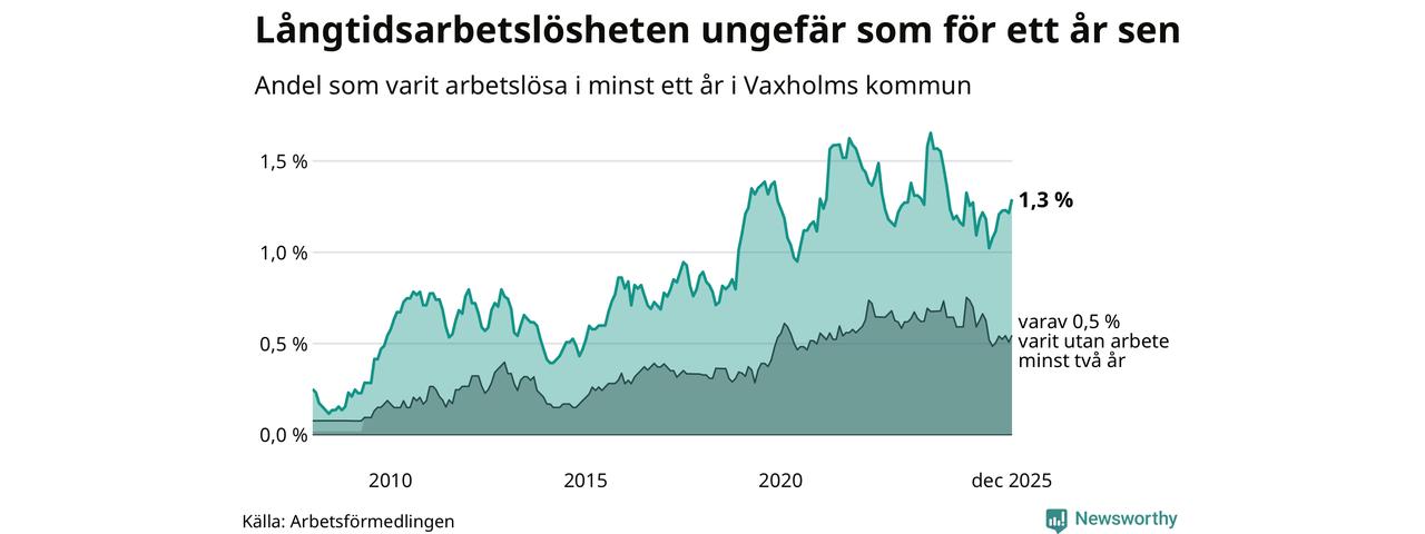 I december hade 71 Vaxholmsbor varit arbetslösa i minst ett år, vilket är fyra fler än månaden innan. 71 personer motsvarar 1,3 procent av arbetskraften i kommunen – andelen långtidsarbetslösa är ungefär på samma nivå som för ett år sedan.