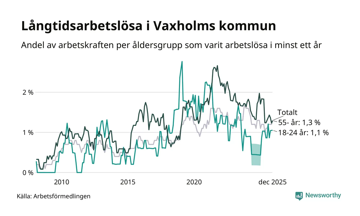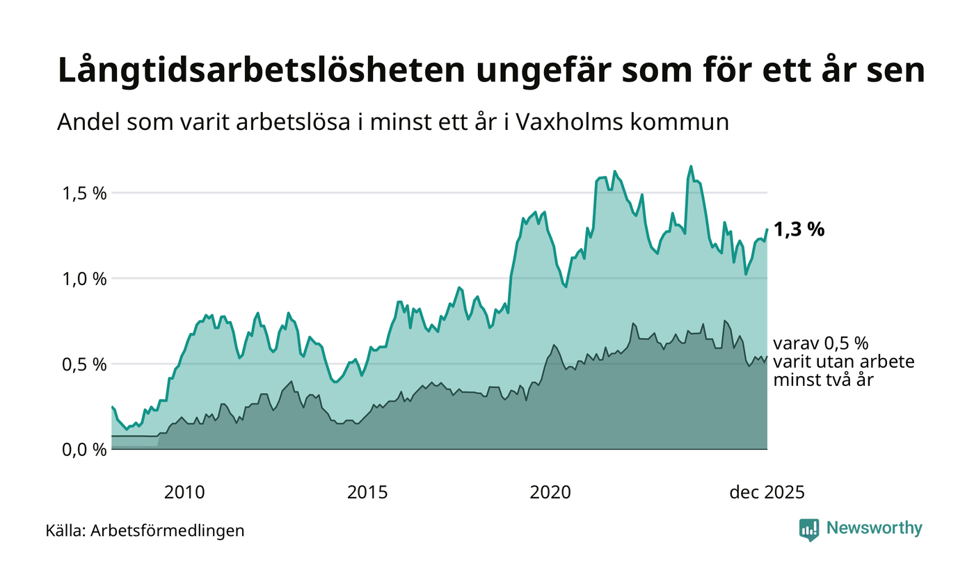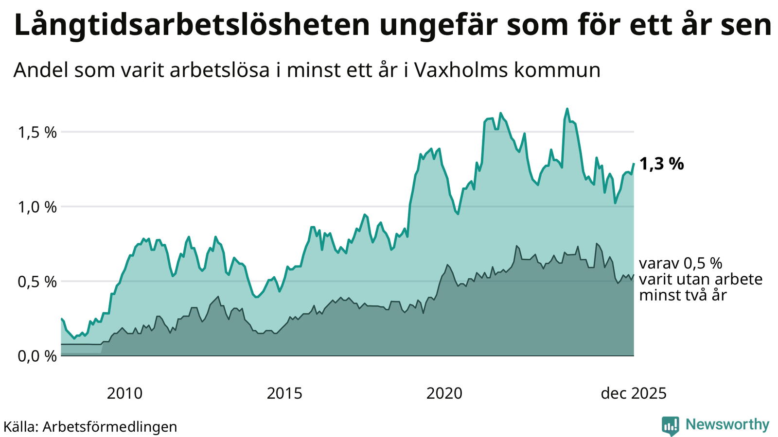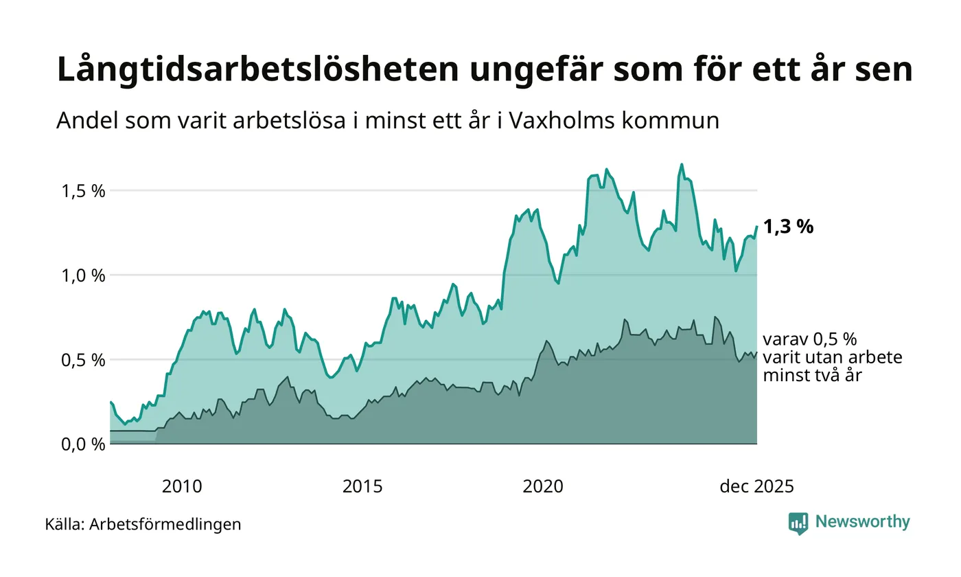 I december hade 71 Vaxholmsbor varit arbetslösa i minst ett år, vilket är fyra fler än månaden innan. 71 personer motsvarar 1,3 procent av arbetskraften i kommunen – andelen långtidsarbetslösa är ungefär på samma nivå som för ett år sedan.