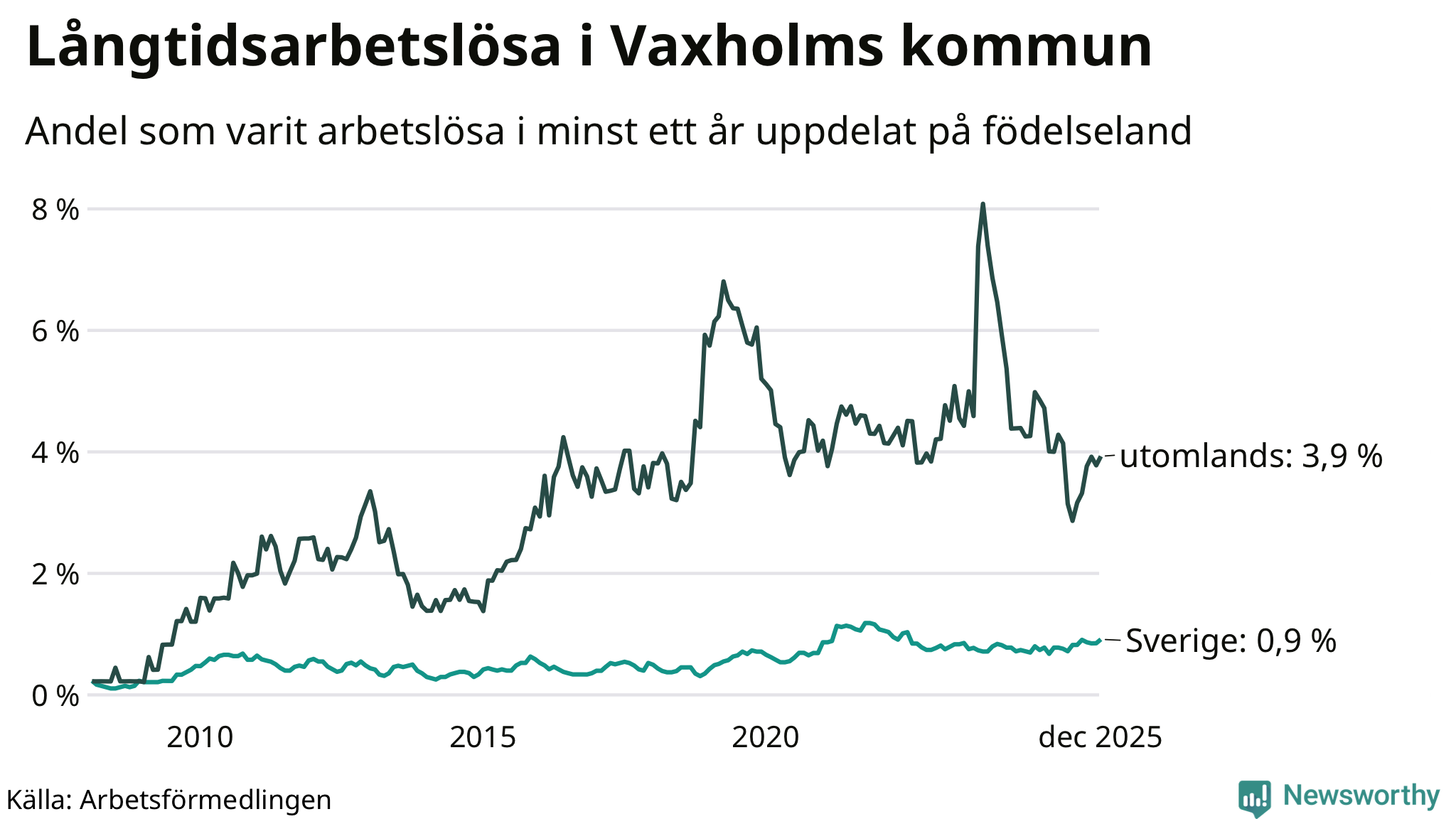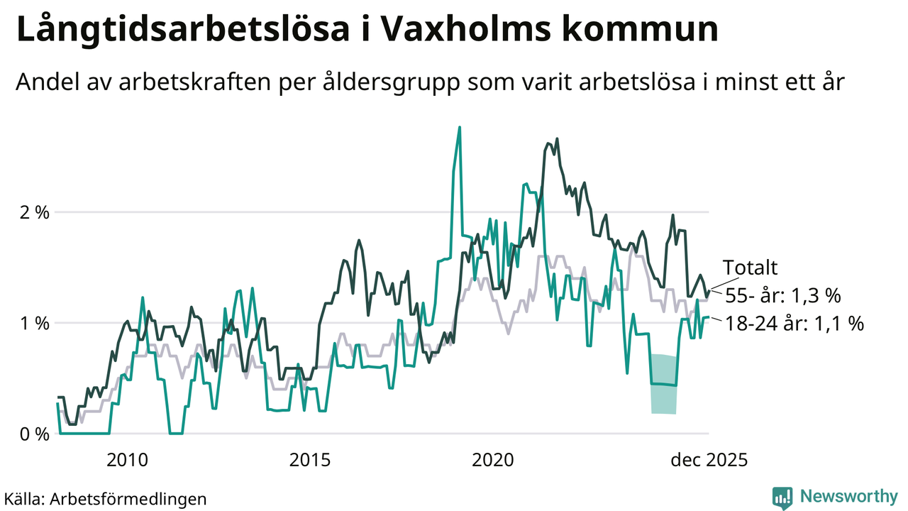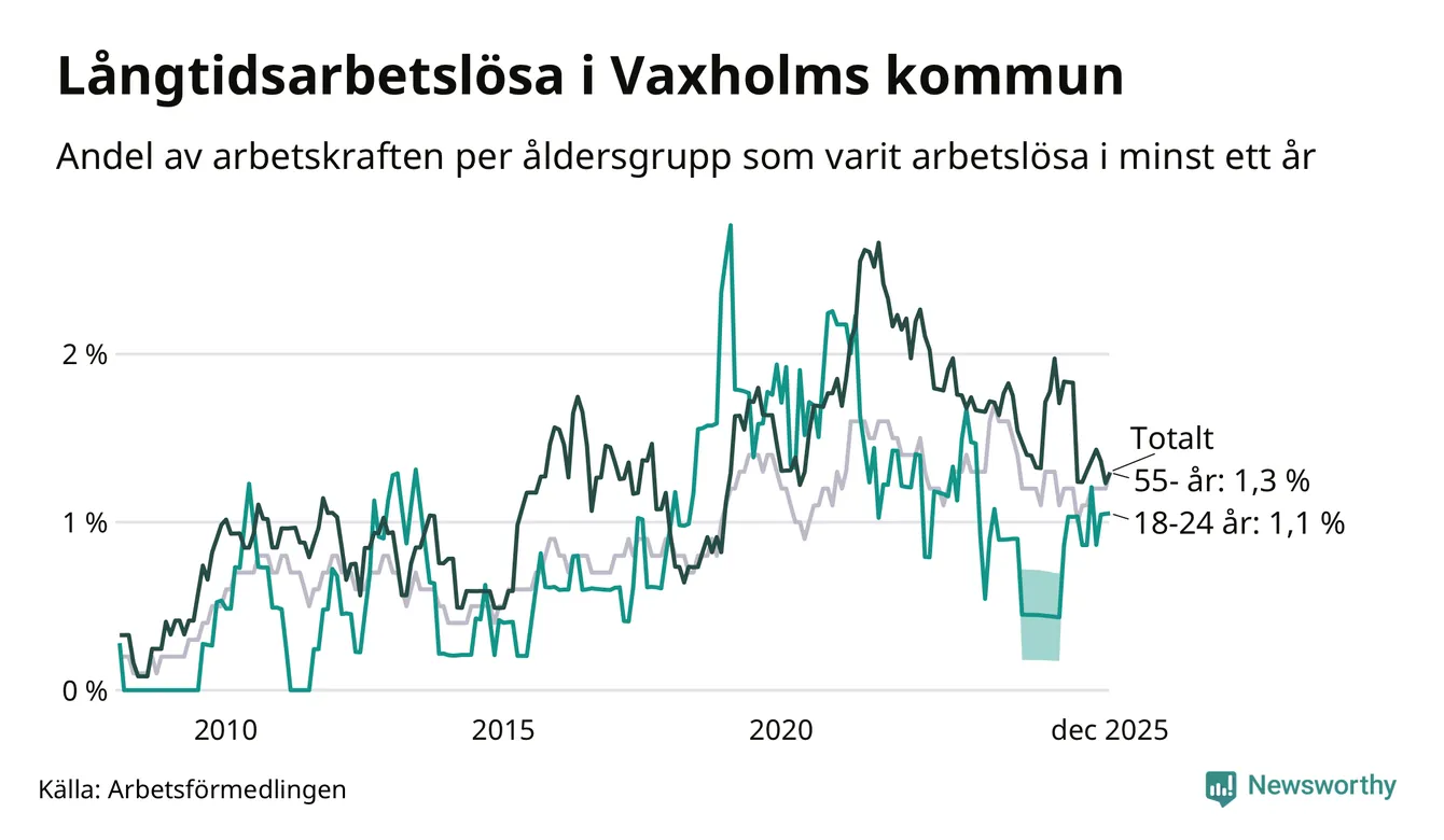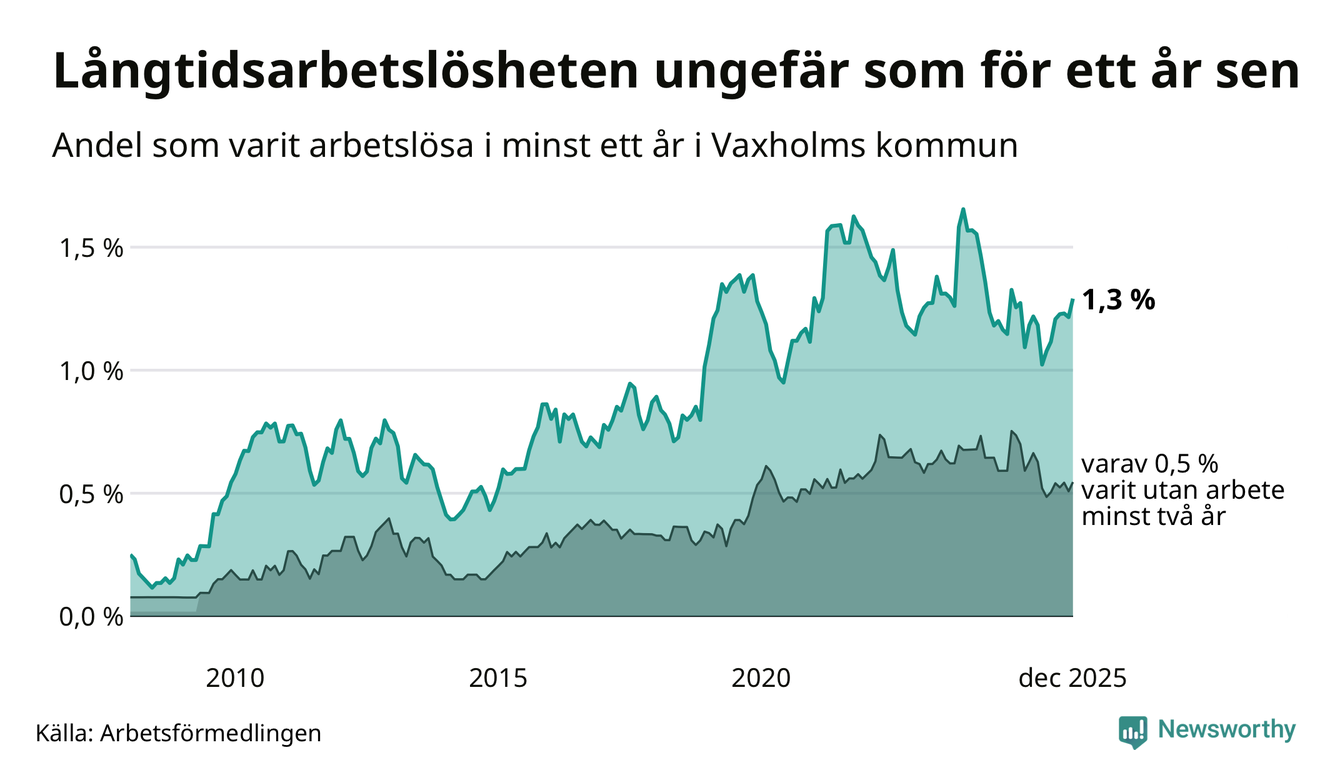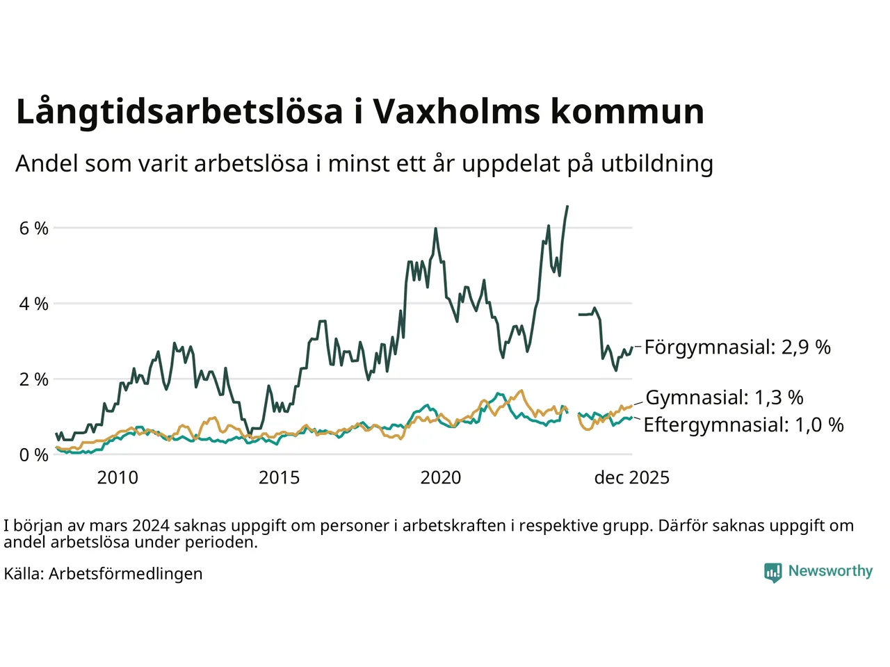 I december hade 71 Vaxholmsbor varit arbetslösa i minst ett år, vilket är fyra fler än månaden innan. 71 personer motsvarar 1,3 procent av arbetskraften i kommunen – andelen långtidsarbetslösa är ungefär på samma nivå som för ett år sedan.