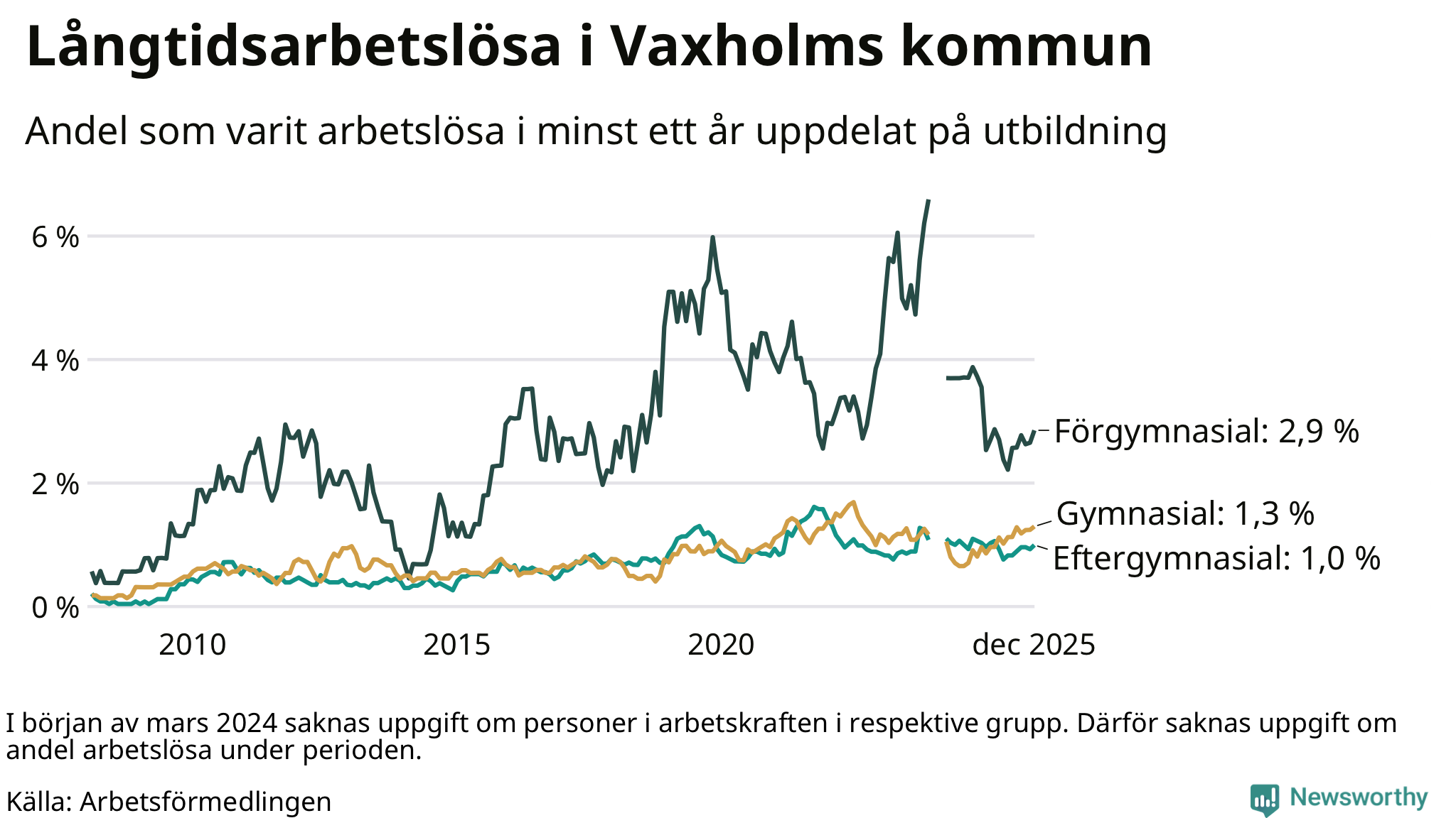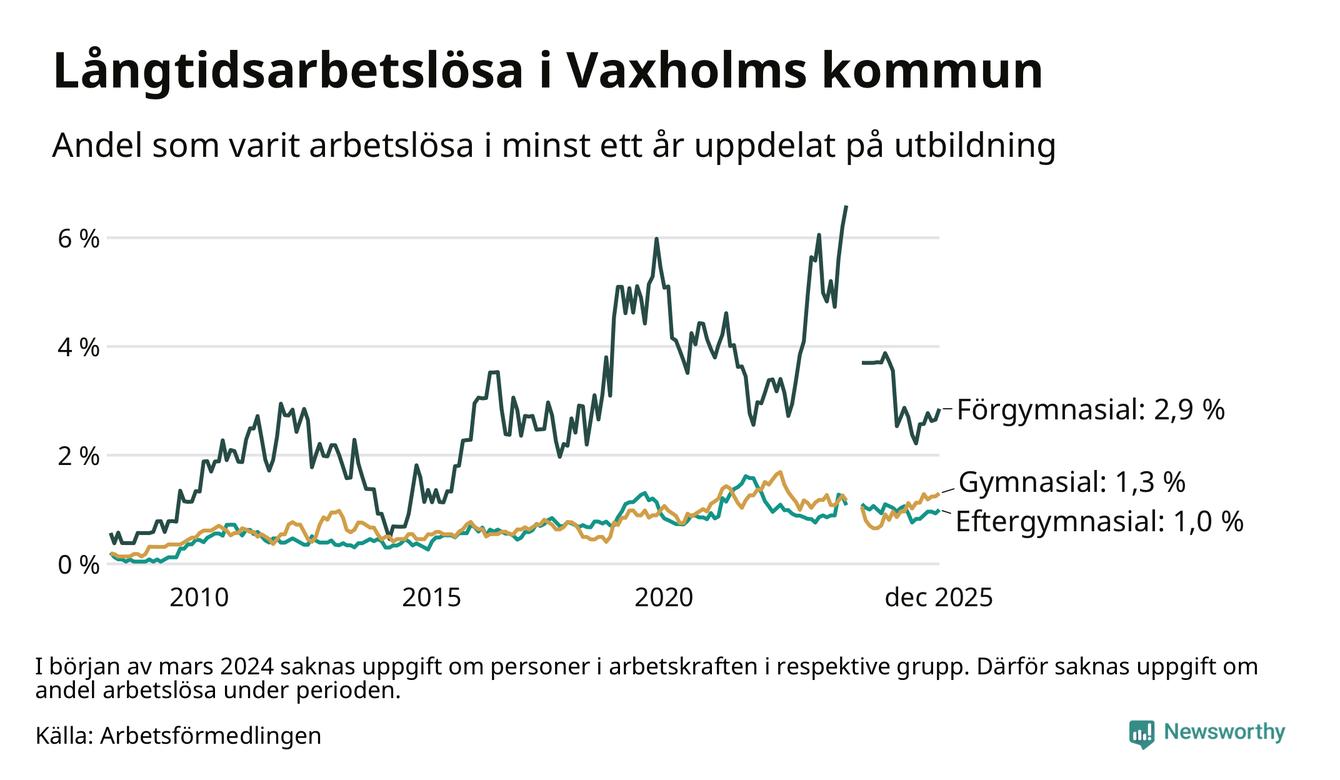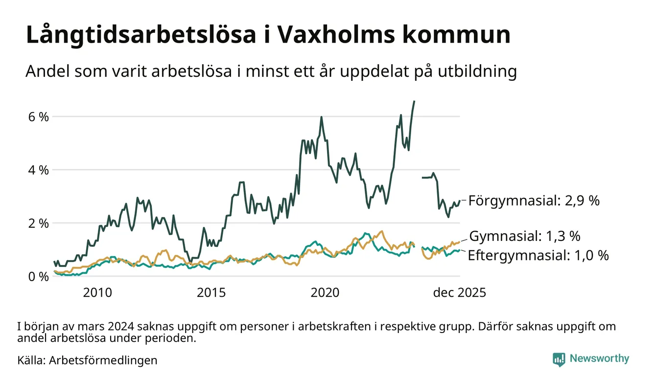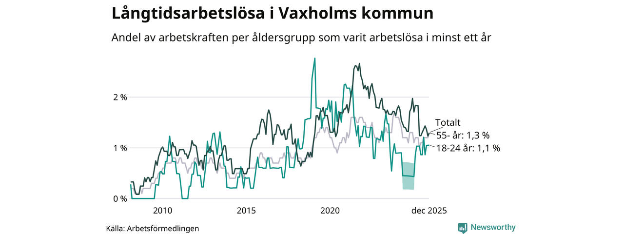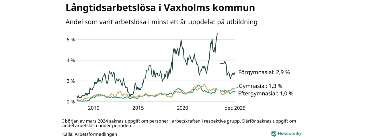 I december hade 71 Vaxholmsbor varit arbetslösa i minst ett år, vilket är fyra fler än månaden innan. 71 personer motsvarar 1,3 procent av arbetskraften i kommunen – andelen långtidsarbetslösa är ungefär på samma nivå som för ett år sedan.