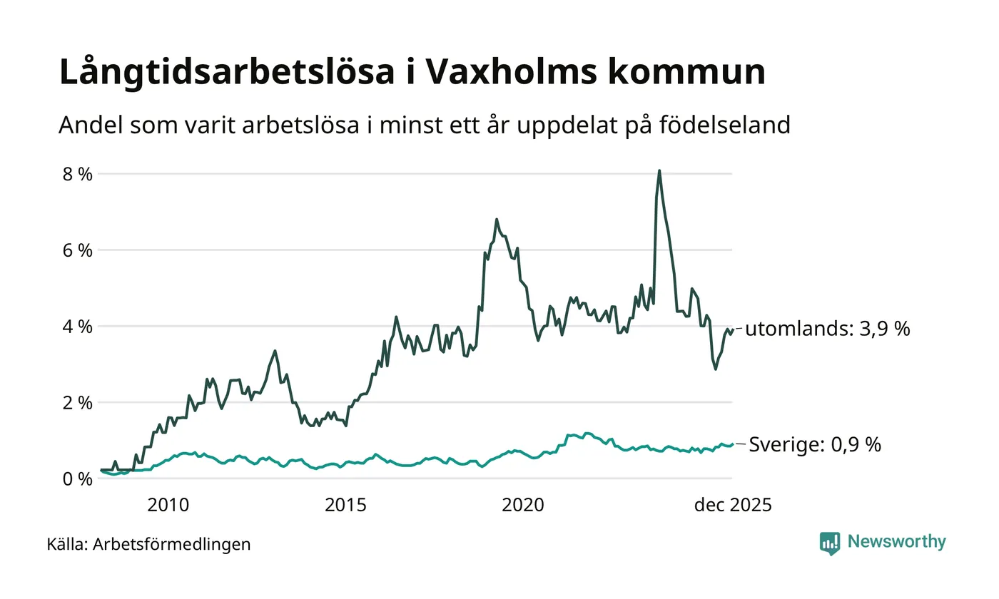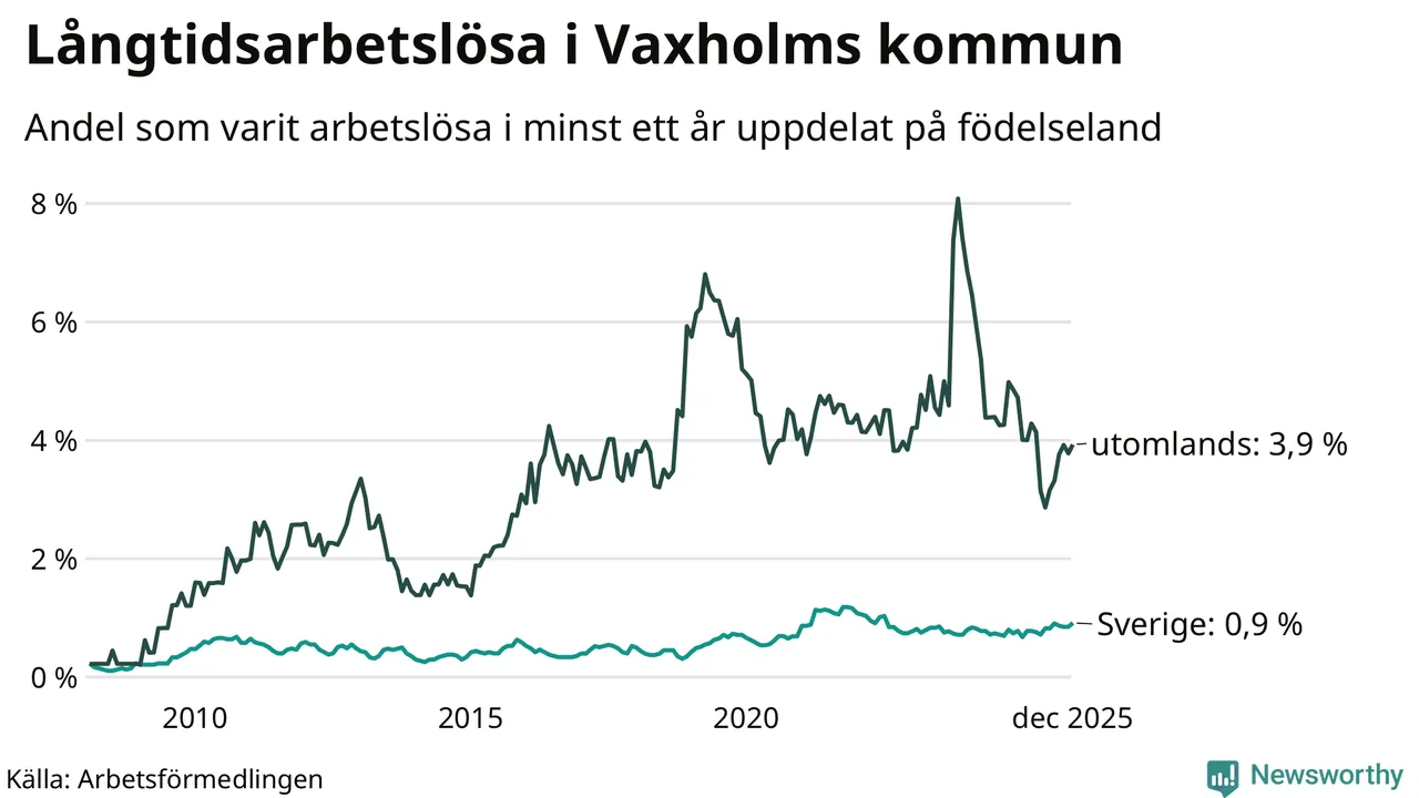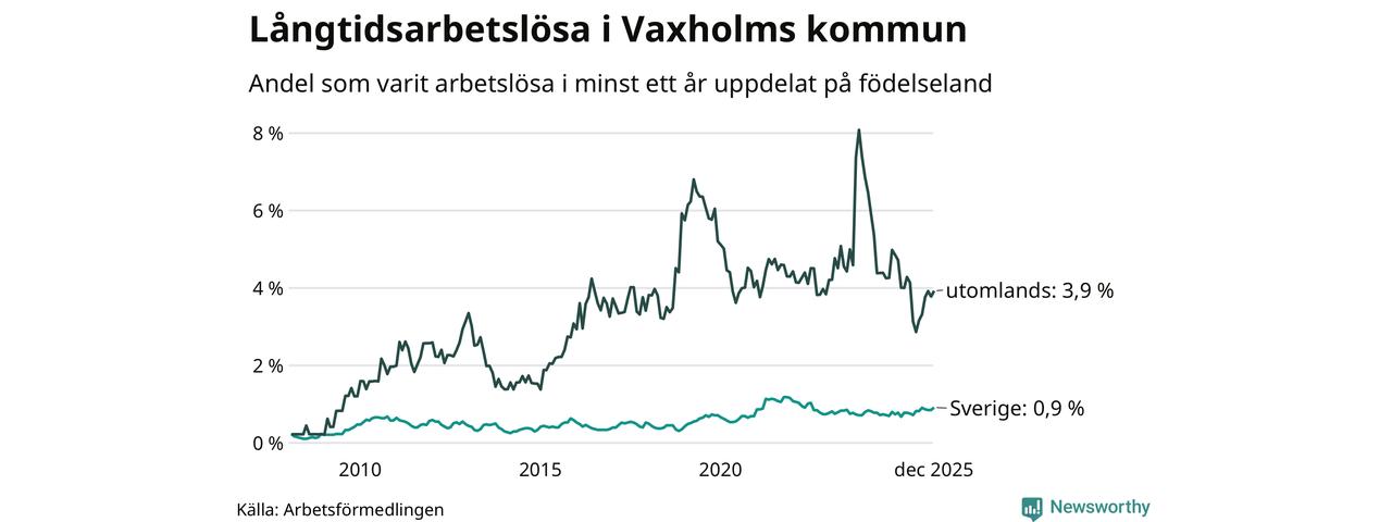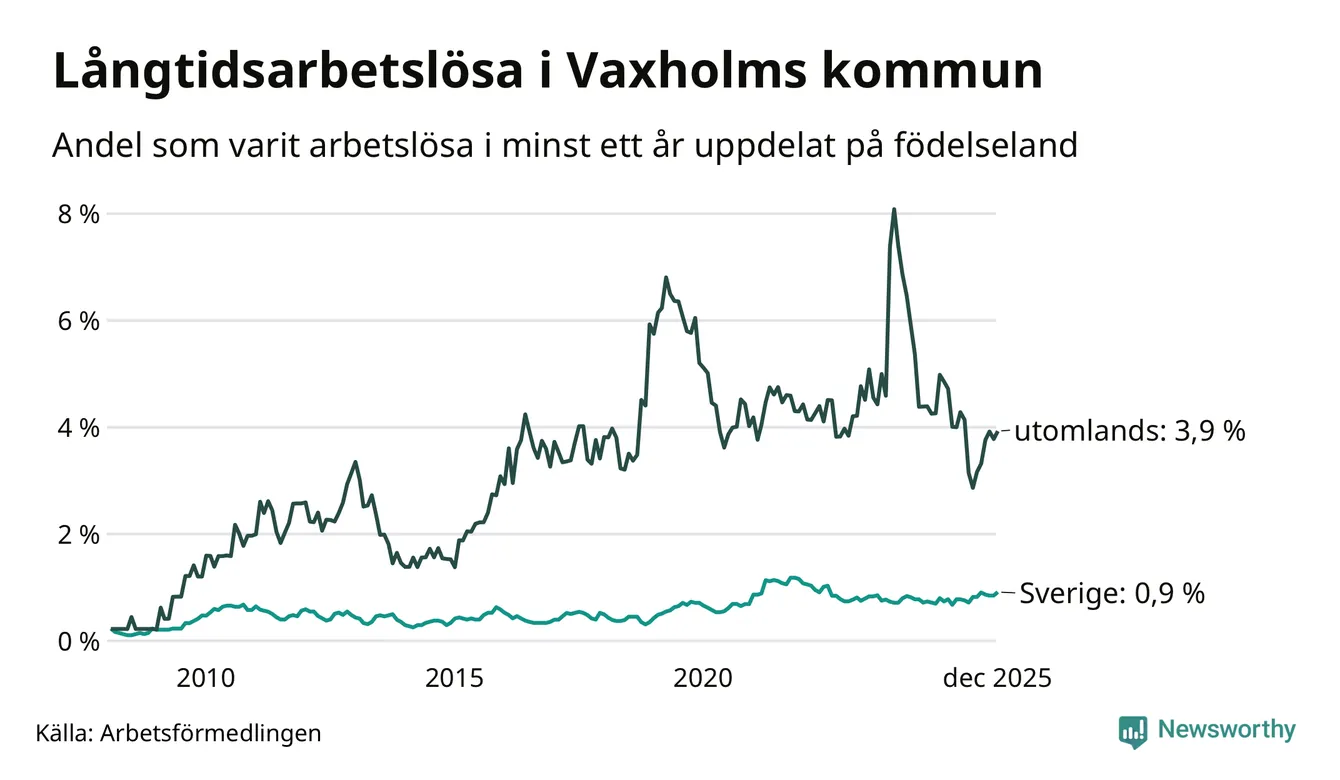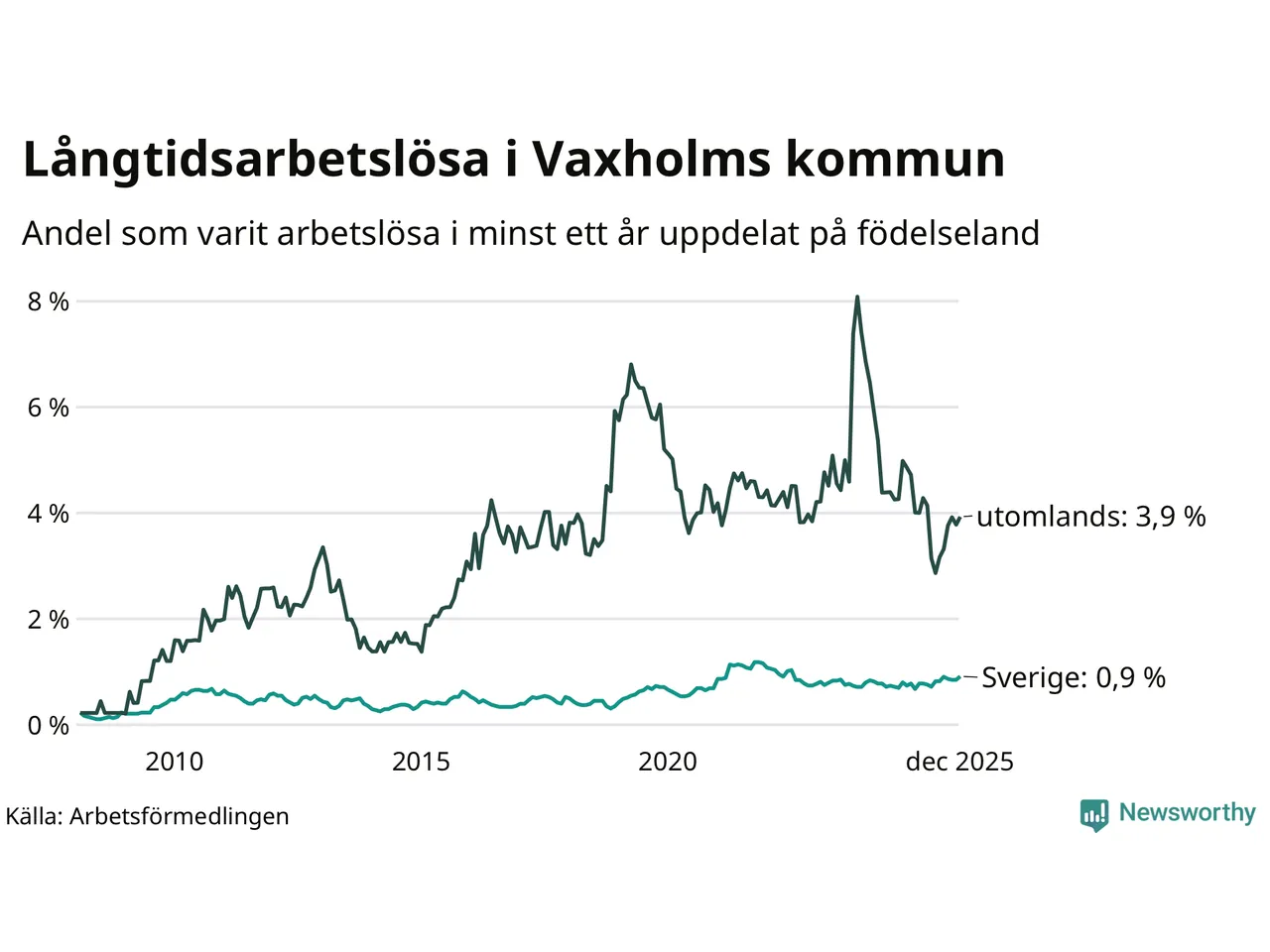 44 av de långtidsarbetslösa i Vaxholm är födda i Sverige, medan 27 är födda utomlands. Det innebär att långtidsarbetslösheten bland Sverigefödda är 0,9 procent, medan den är fyra gånger så hög – 3,9 procent – bland födda utomlands. Även i riket som helhet är arbetslösheten högre bland utrikesfödda.