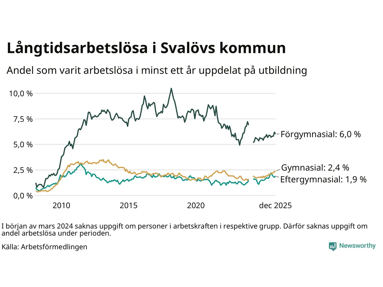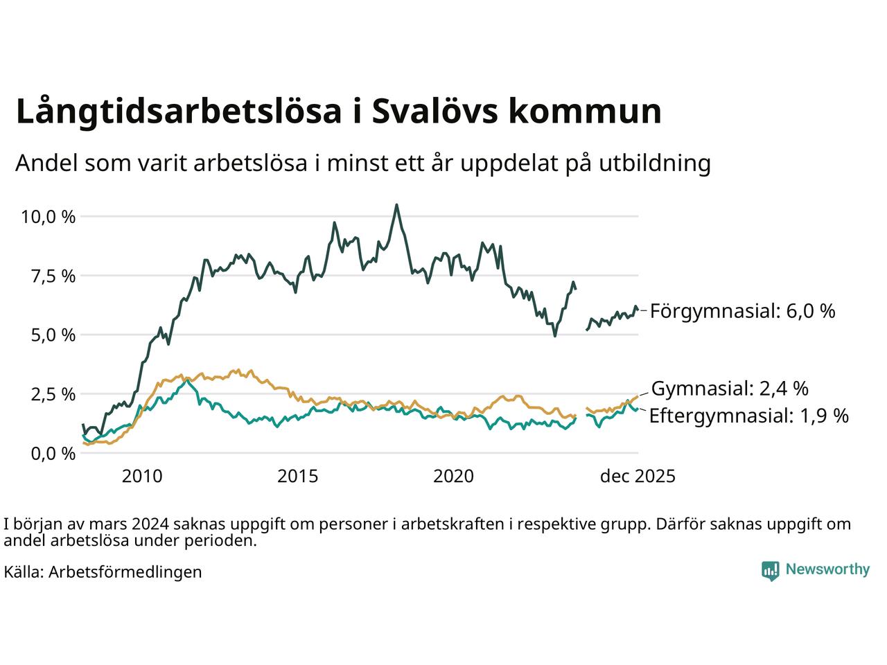 Graf över andel långtidsarbetslösa i Svalöv uppdelat på utbildningsnivå