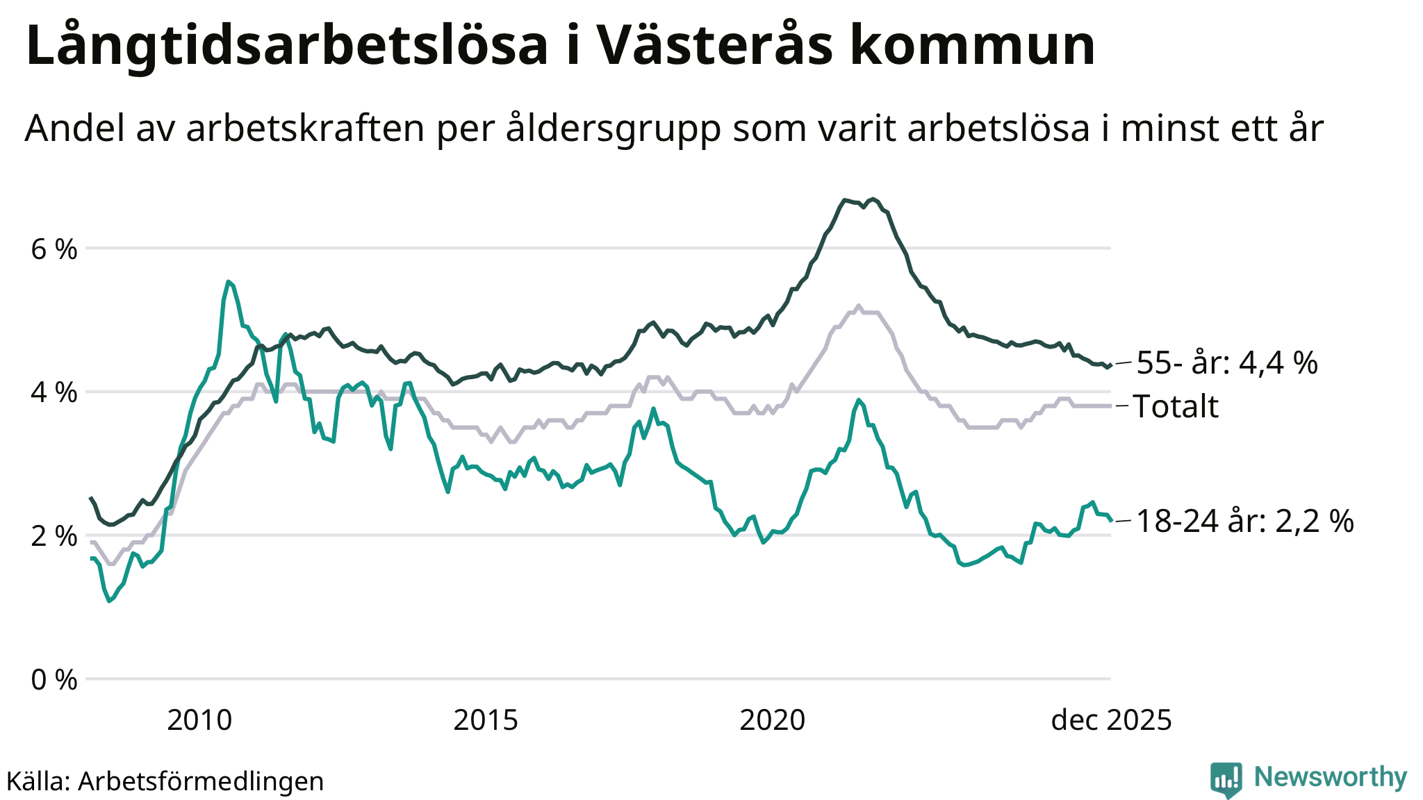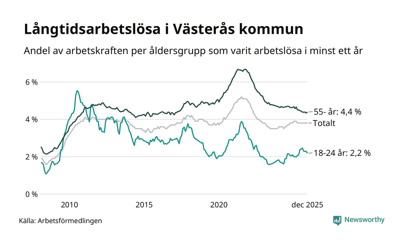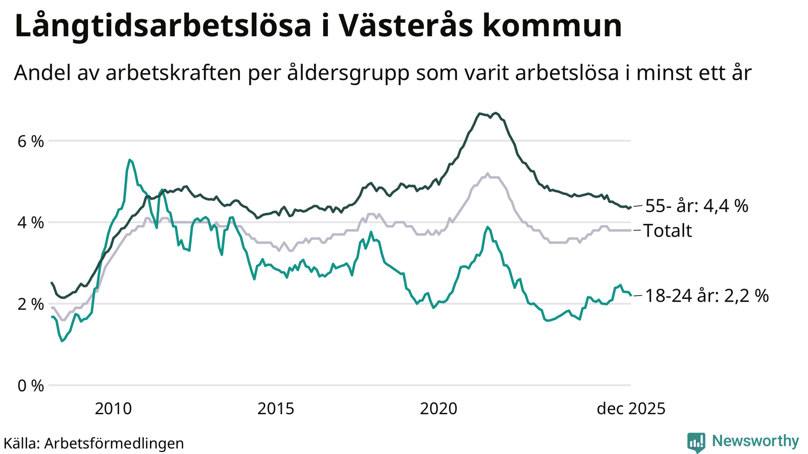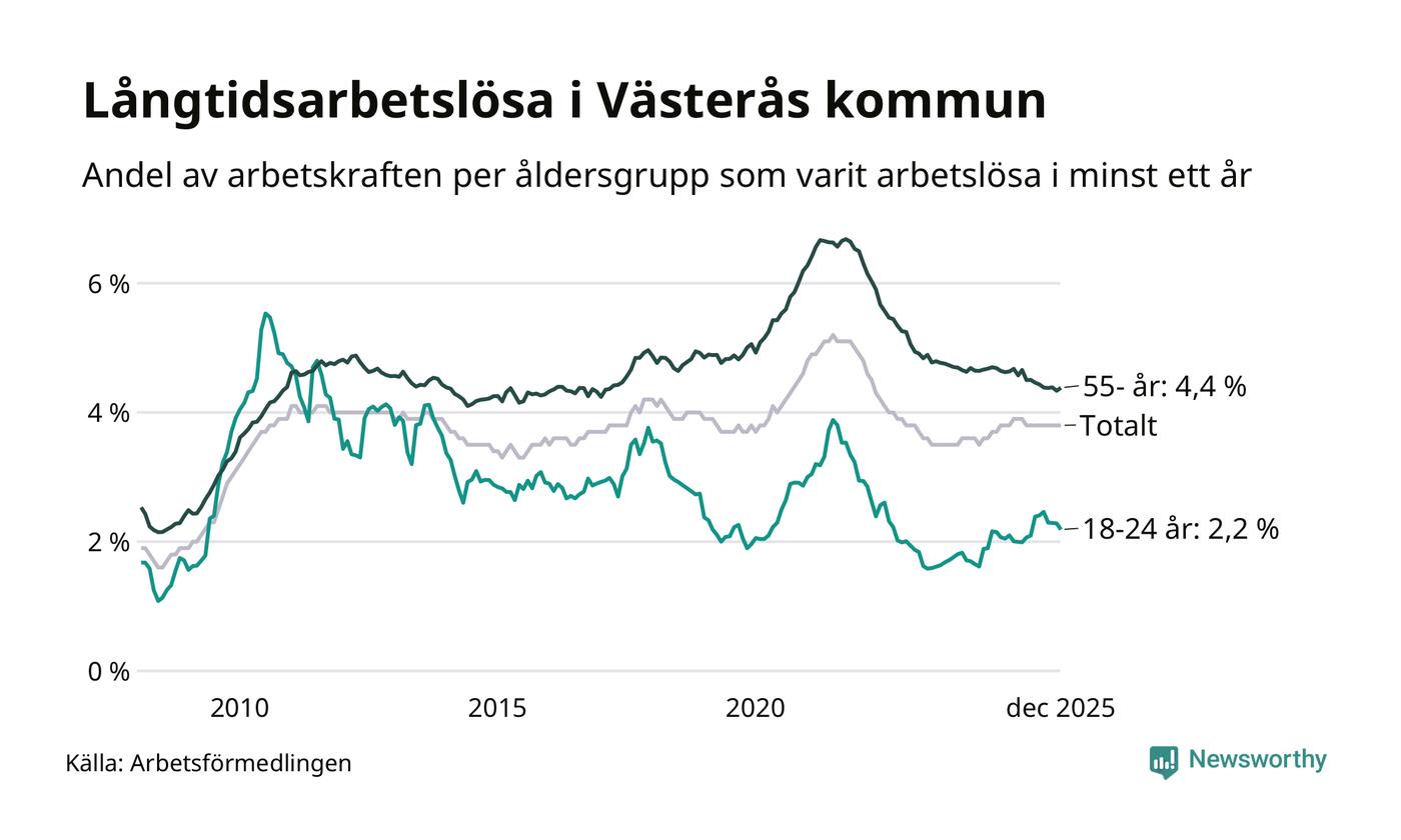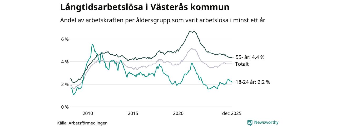 Av de 3 130 personerna som varit arbetslösa i mer än ett år i Västerås kommun är 754 personer mellan 55 och 651 år och 180 är mellan 18 och 24 år. För den äldre gruppen är andelen arbetslösa 4,4 procent medan den i den yngre gruppen är 2,2 procent. Även i riket som helhet är långtidsarbetslösheten högre i gruppen äldre.