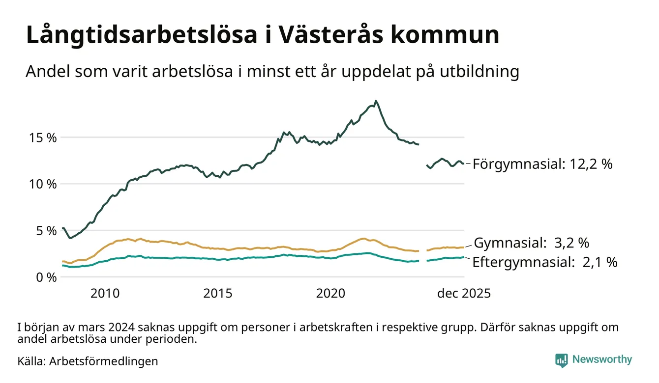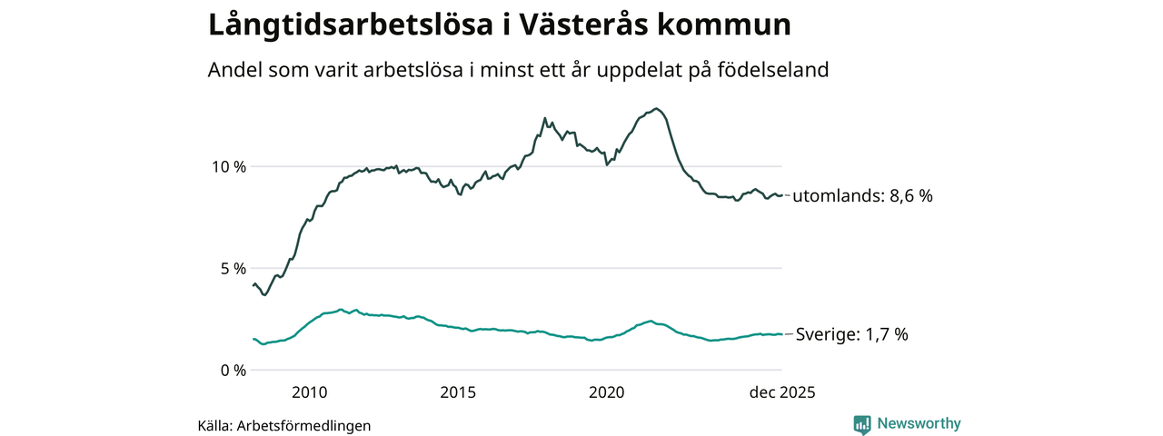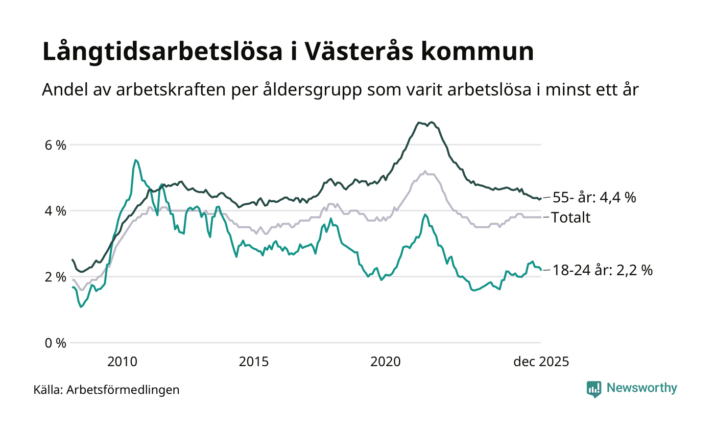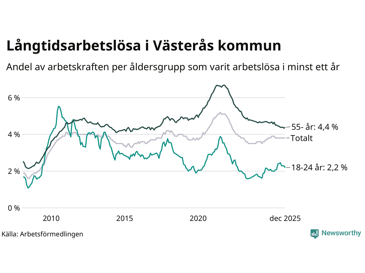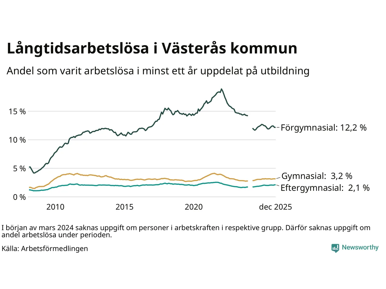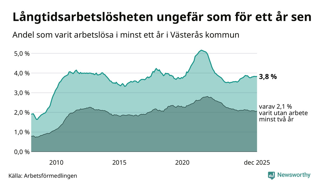 I december hade 3 130 Västeråsbor varit arbetslösa i minst ett år, vilket är åtta fler än månaden innan. 3 130 personer motsvarar 3,8 procent av arbetskraften i kommunen – andelen långtidsarbetslösa är ungefär på samma nivå som för ett år sedan.