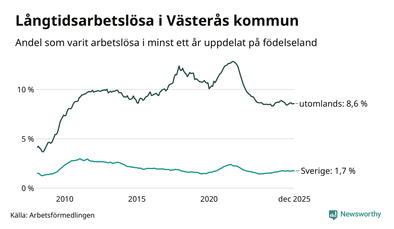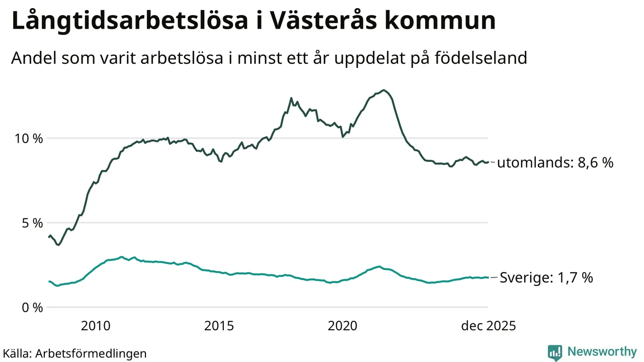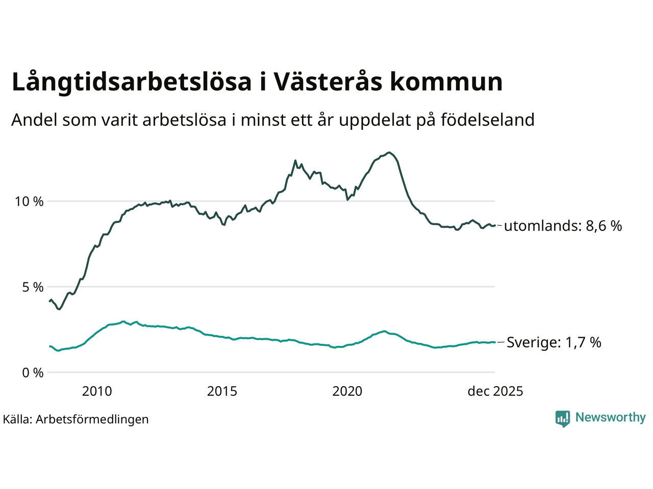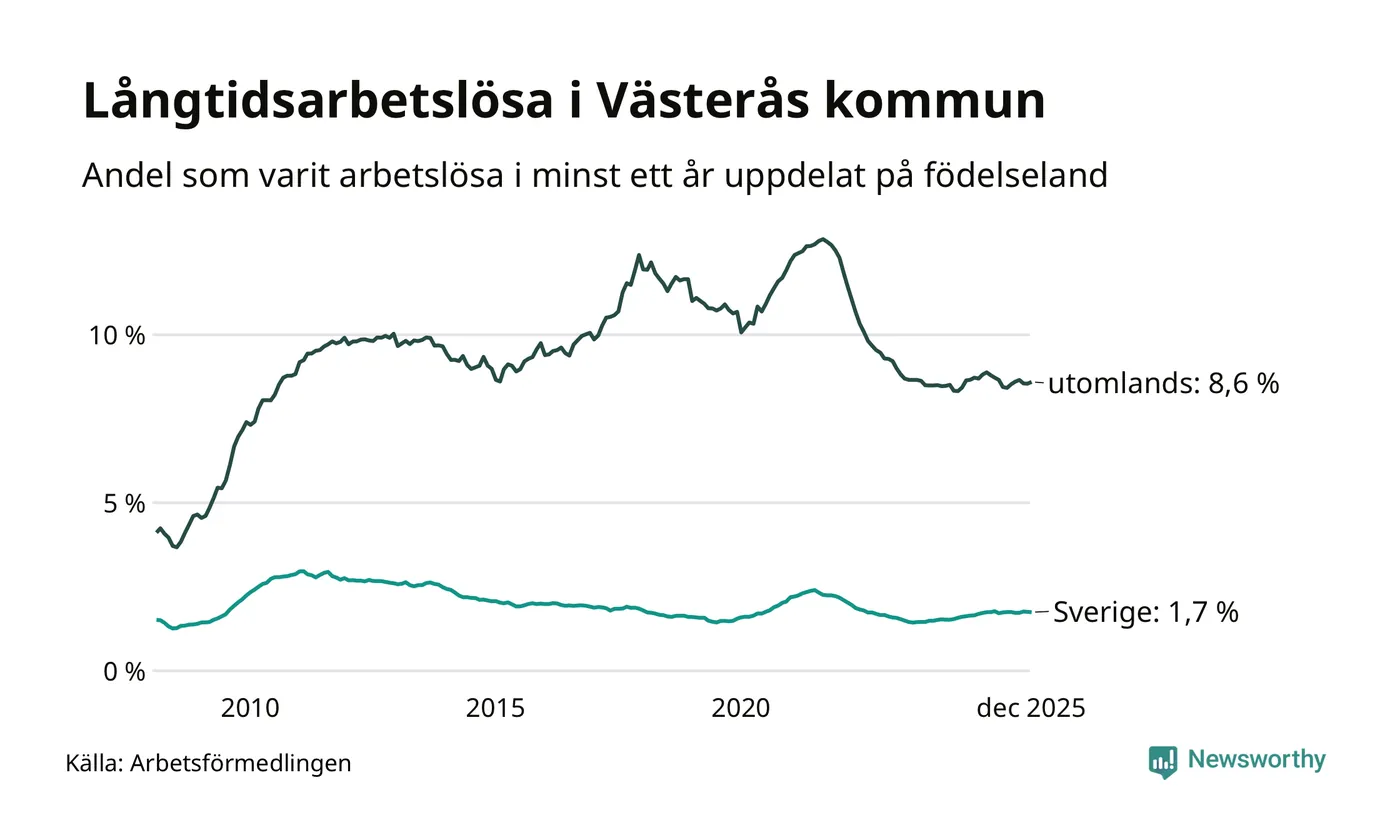 992 av de långtidsarbetslösa i Västerås är födda i Sverige, medan 2 138 är födda utomlands. Det innebär att långtidsarbetslösheten bland Sverigefödda är 1,7 procent, medan den är fem gånger så hög – 8,6 procent – bland födda utomlands. Även i riket som helhet är arbetslösheten högre bland utrikesfödda.