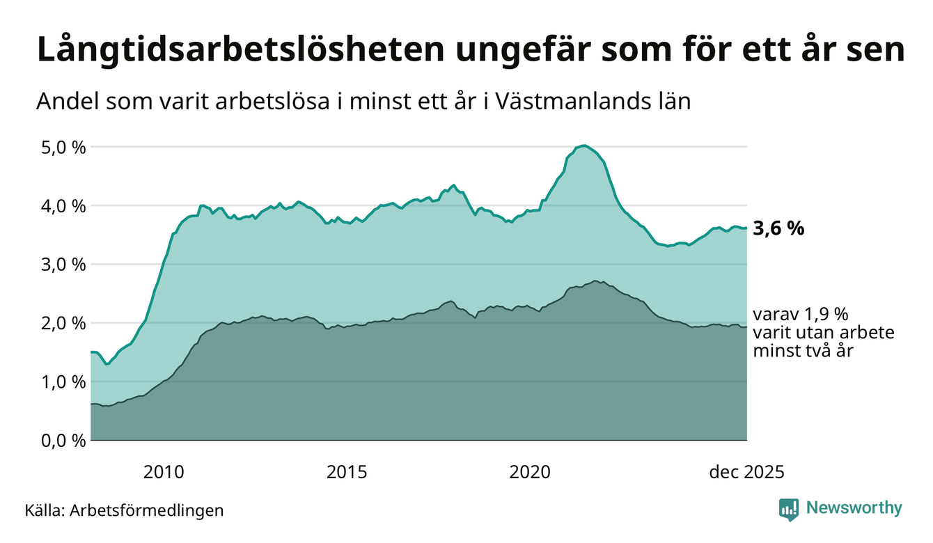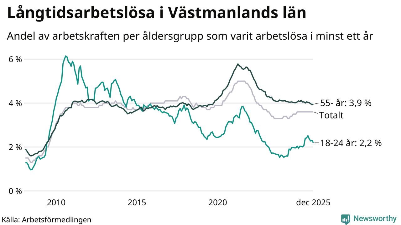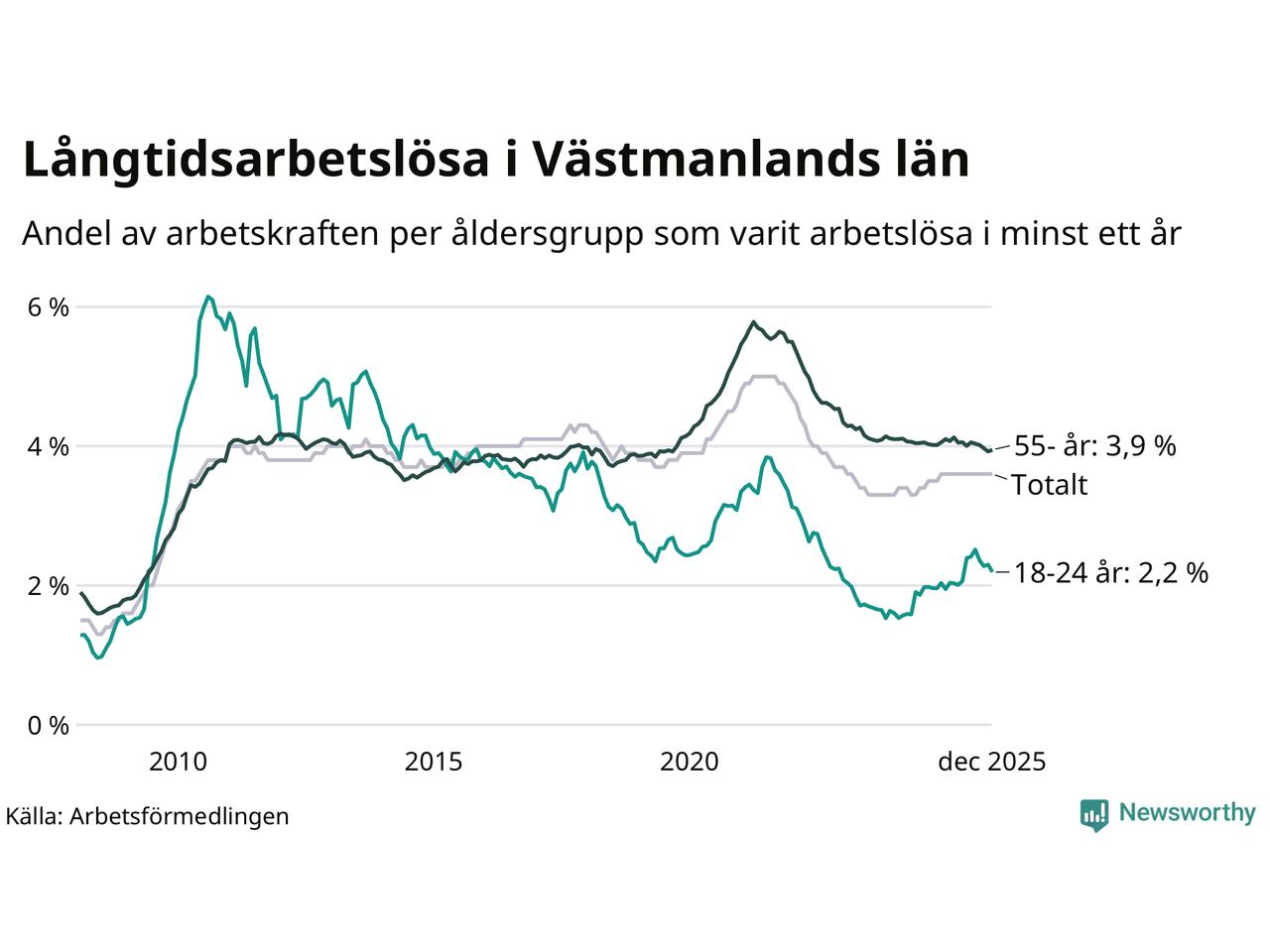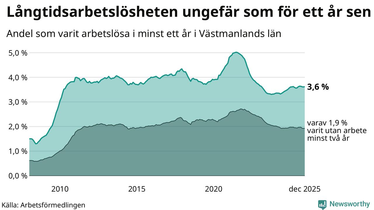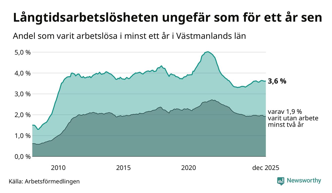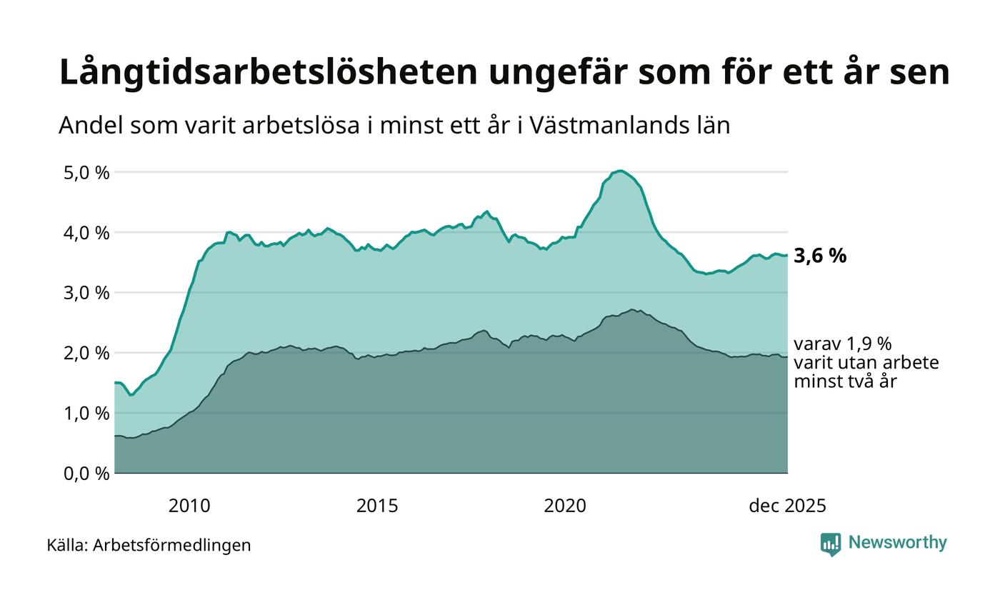 I december hade 4 962 Västmanlandsbor varit arbetslösa i minst ett år, vilket är 13 fler än månaden innan. 4 962 personer motsvarar 3,6 procent av arbetskraften i länet – andelen långtidsarbetslösa är ungefär på samma nivå som för ett år sedan.