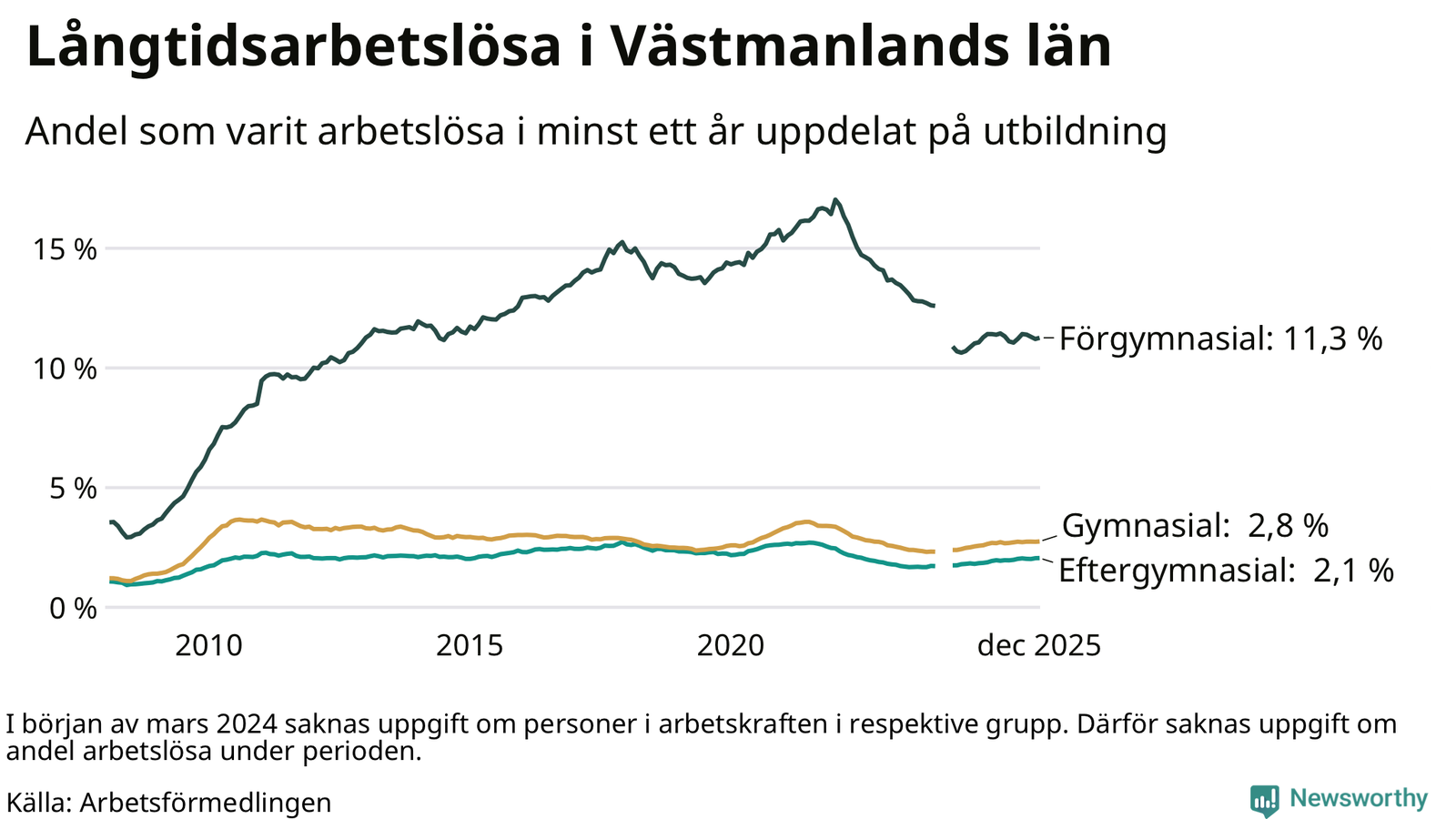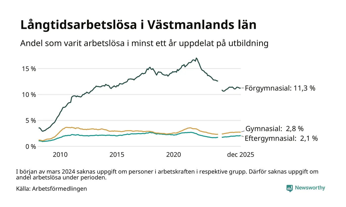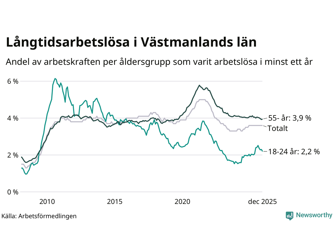 Antalet som står allra längst från arbetsmarknaden – som varit utan arbete utan i minst två år – har minskat jämfört med samma månad för ett år sedan: från 2 700 till 2 647, eller 1,9 procent av arbetskraften i december 2025.