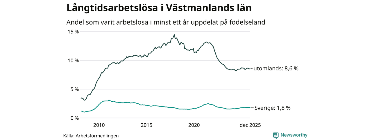 1 810 av de långtidsarbetslösa i Västmanland är födda i Sverige och mellan 3 153 och 3 156 är födda utomlands. Det innebär att långtidsarbetslösheten bland Sverigefödda är 1,8 procent, medan den ligger på 8,6 procent för utlandsfödda.