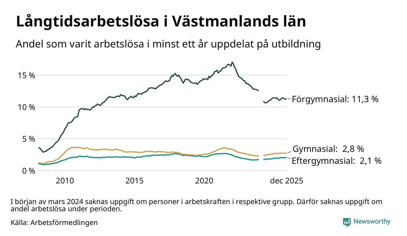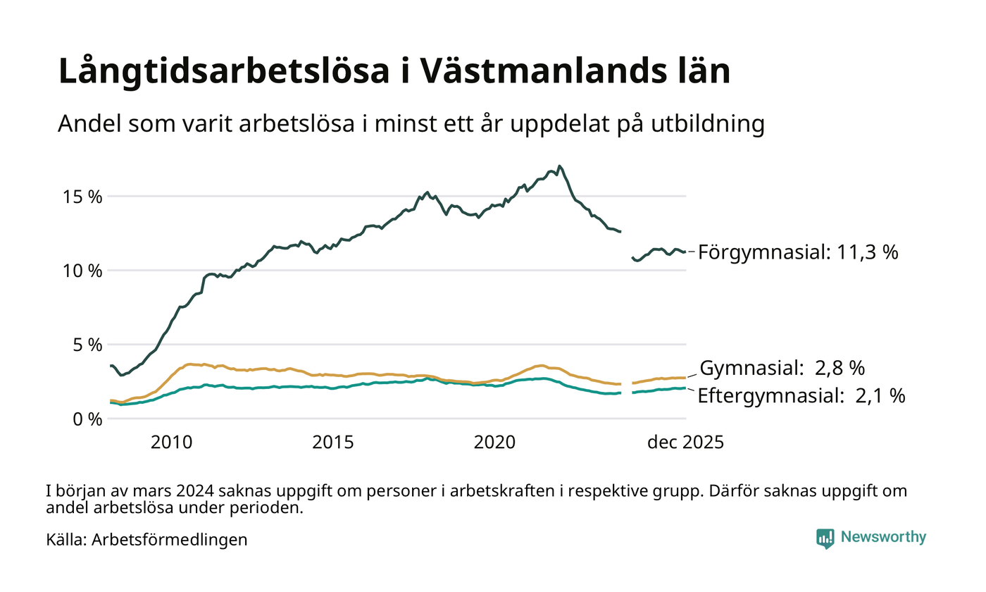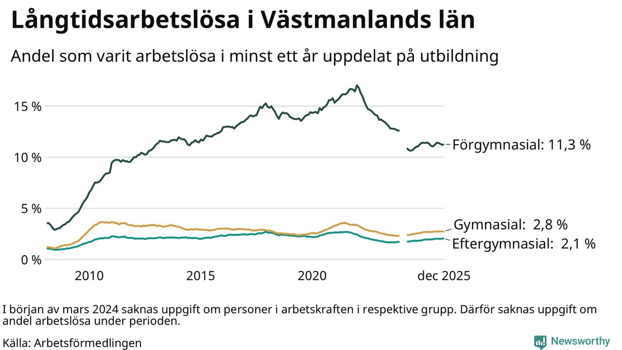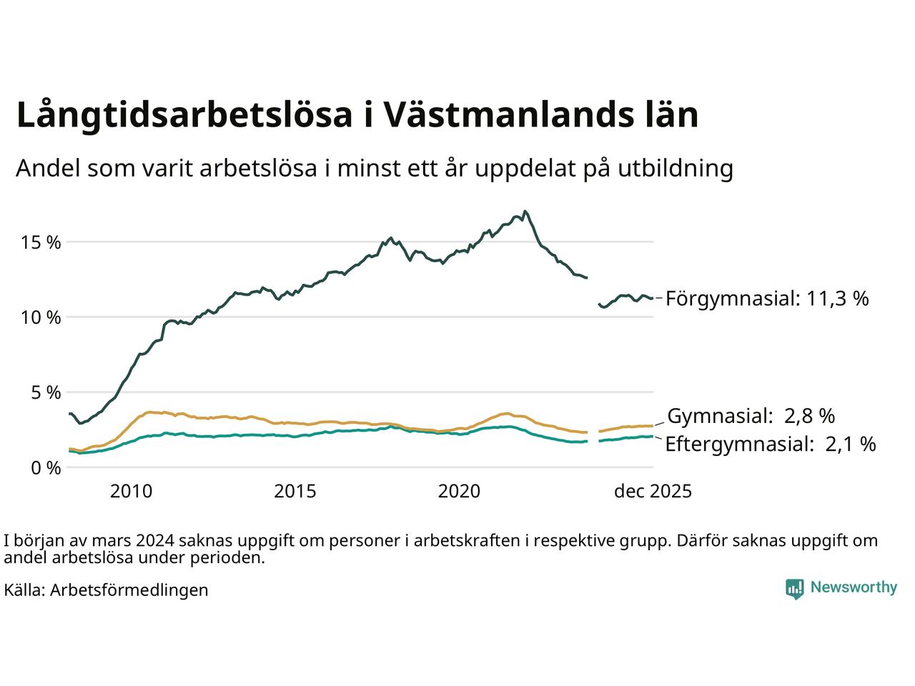 Graf över andel långtidsarbetslösa i Västmanland uppdelat på utbildningsnivå