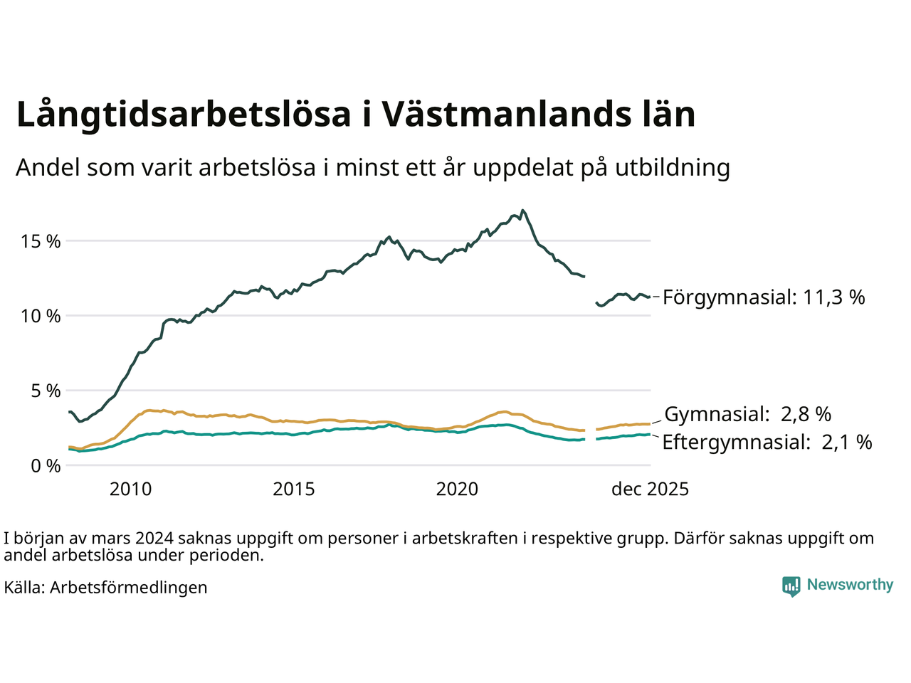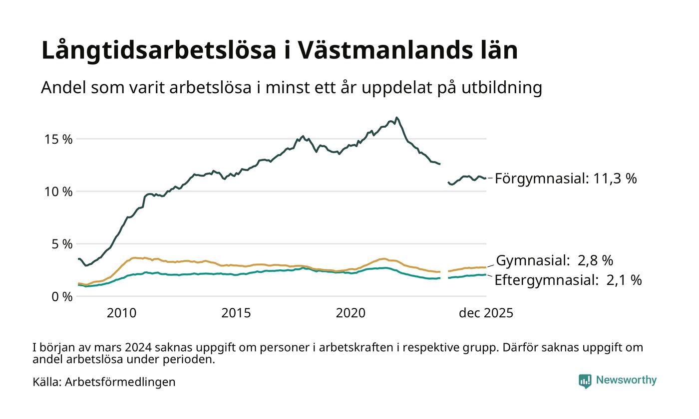 Även när det gäller utbildningsnivå är skillnaderna stora. 2 080 av de som varit arbetslösa i minst ett år har inte någon gymnasieutbildning, vilket motsvarar en långtidsarbetslöhet på 11,3 procent i den gruppen. Det kan jämföras med 2,8 procent bland dem som gått ut gymnasiet och 2,1 procent bland dem som studerat vidare efter gymnasiet.