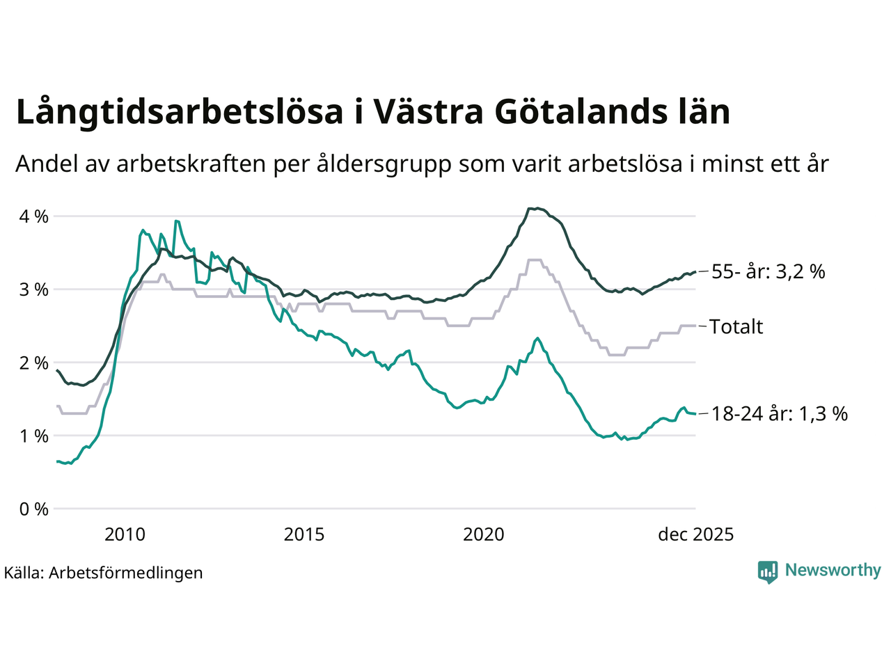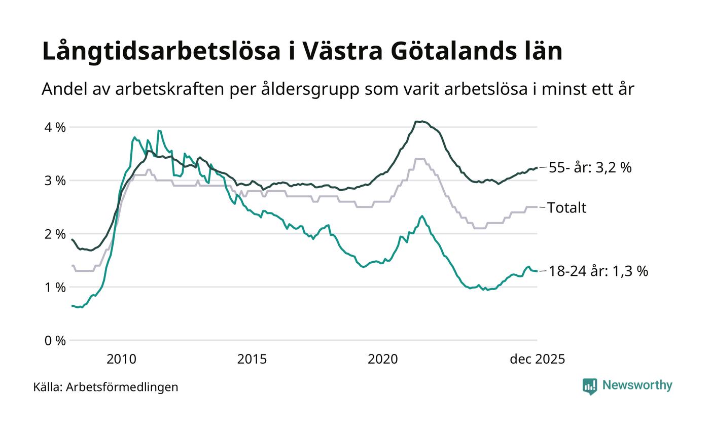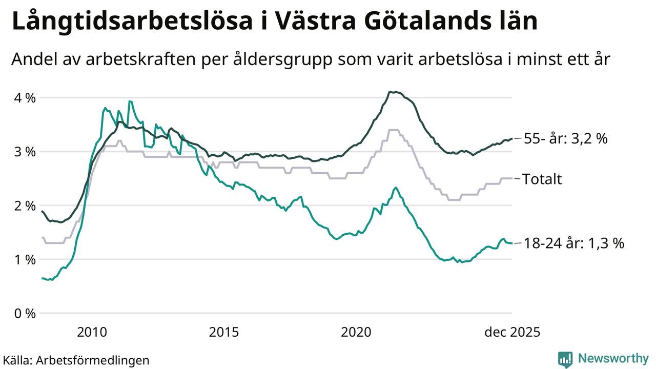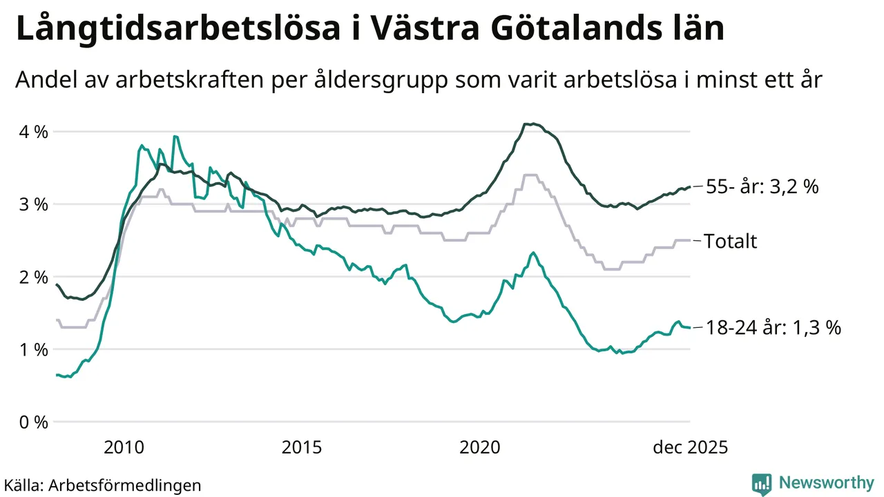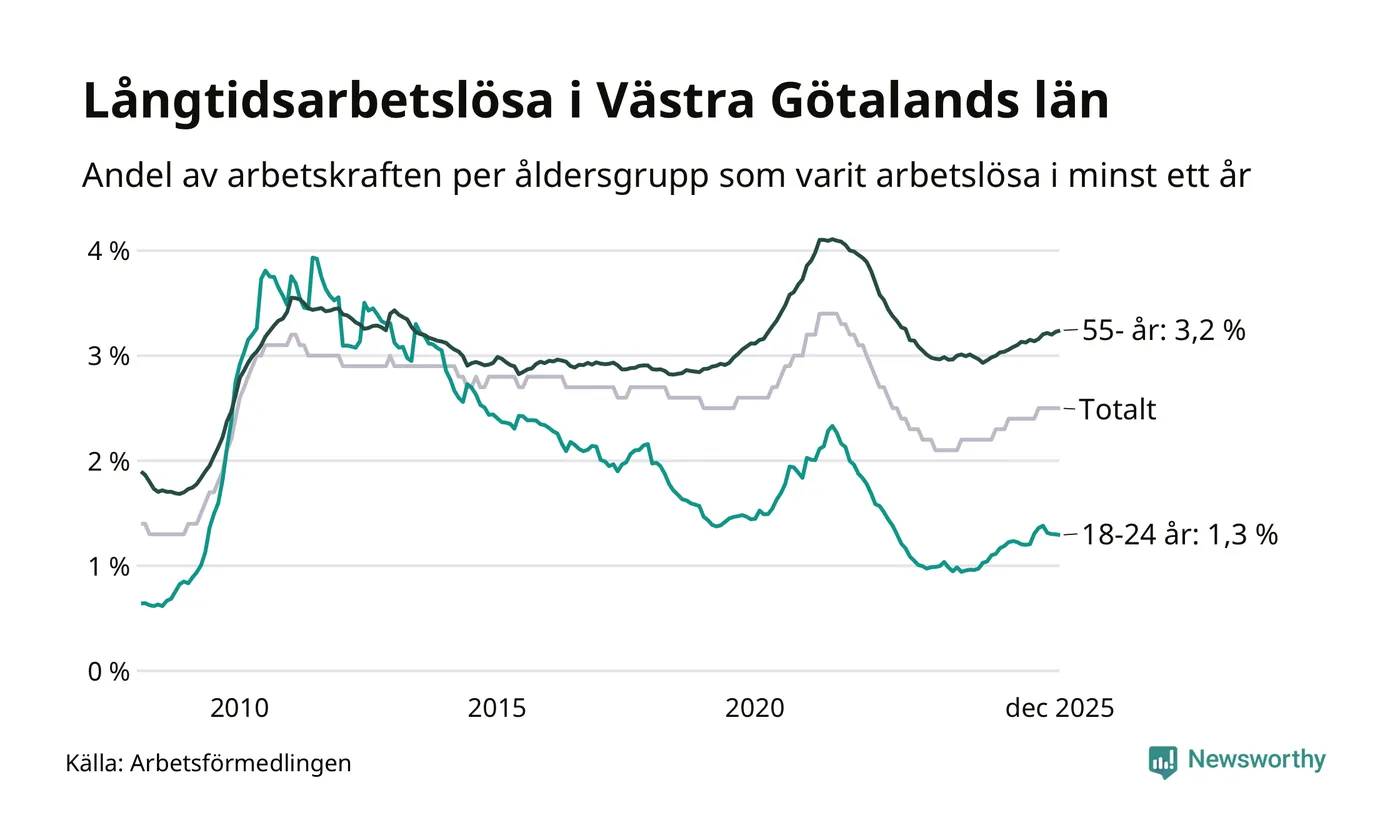 Av de 22 562 personerna som varit arbetslösa i mer än ett år i Västra Götalands län är mellan 6 046 och 6 046 personer mellan 55 och 651 år och mellan 1 197 och 1 197 är mellan 18 och 24 år. För den äldre gruppen är andelen arbetslösa 3,2 procent medan den i den yngre gruppen är 1,3 procent. Även i riket som helhet är långtidsarbetslösheten högre i gruppen äldre.