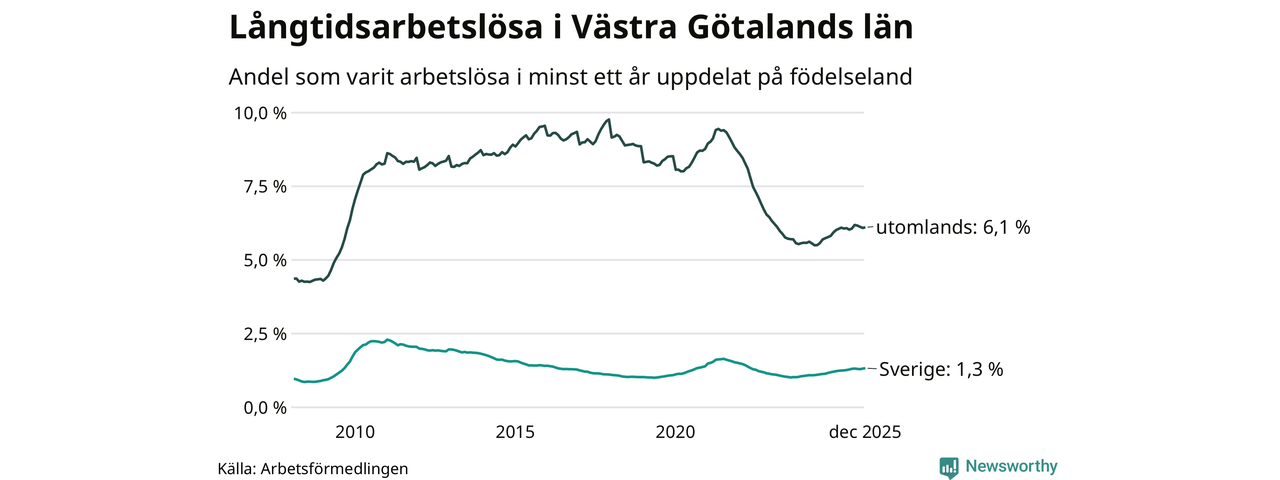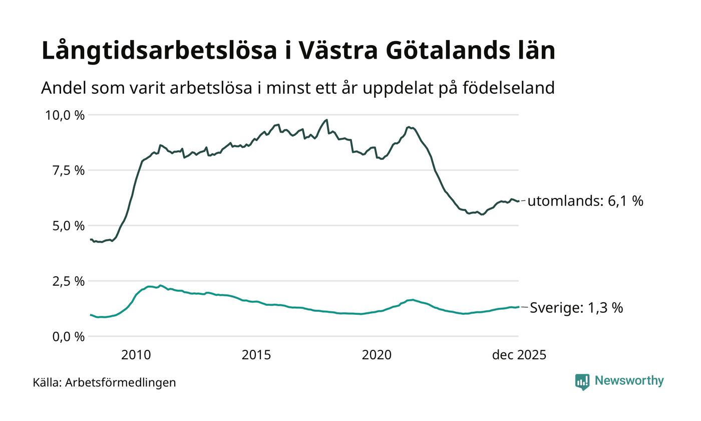 8 994 av de långtidsarbetslösa i Västra Götaland är födda i Sverige och mellan 13 569 och 13 572 är födda utomlands. Det innebär att långtidsarbetslösheten bland Sverigefödda är 1,3 procent, medan den ligger på 6,1 procent för utlandsfödda.