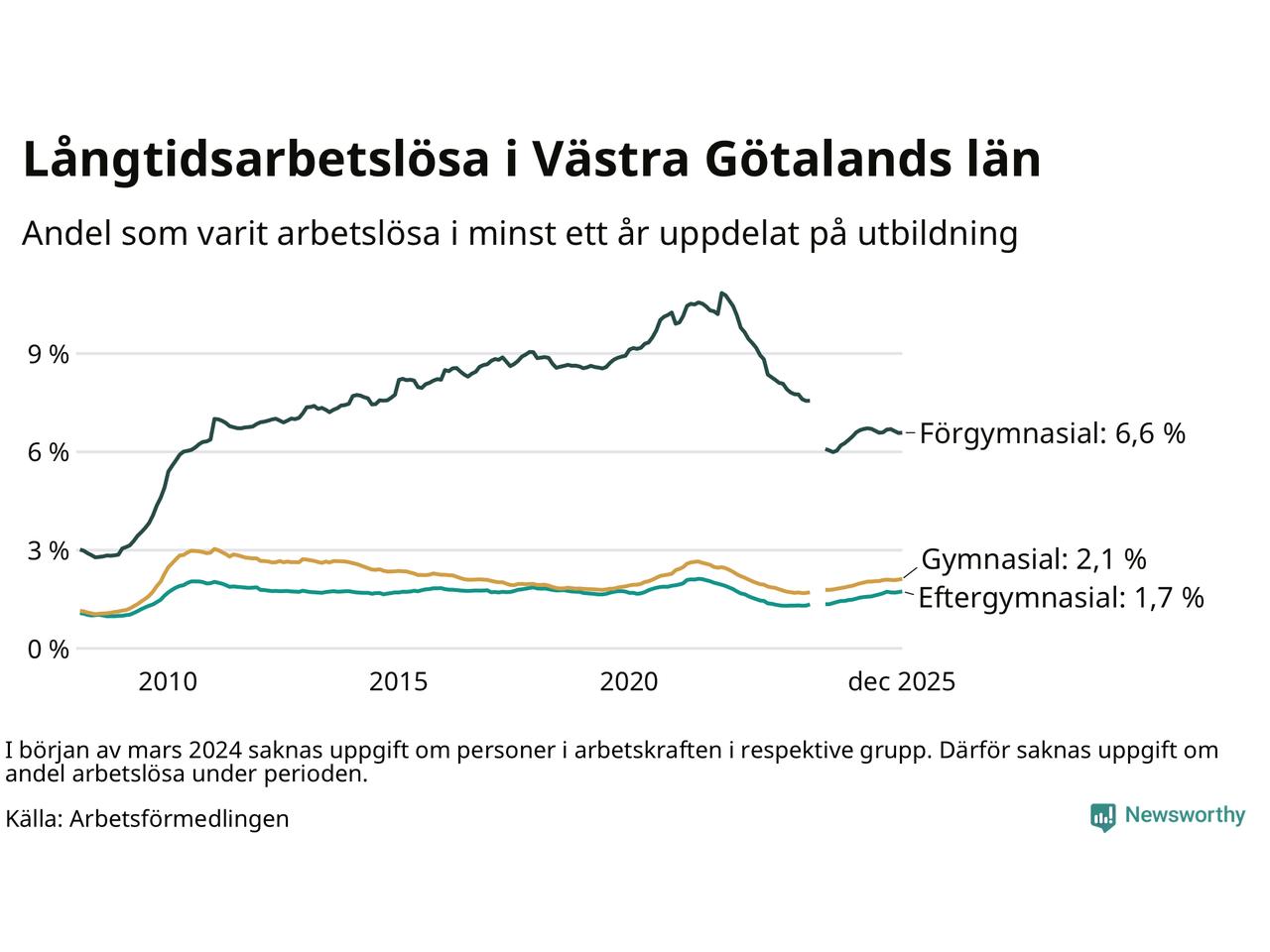 I december hade 22 562 Västra Götalandsbor varit arbetslösa i minst ett år, vilket är 180 fler än månaden innan. 22 562 personer motsvarar 2,5 procent av arbetskraften i länet – andelen långtidsarbetslösa är ungefär på samma nivå som för ett år sedan.