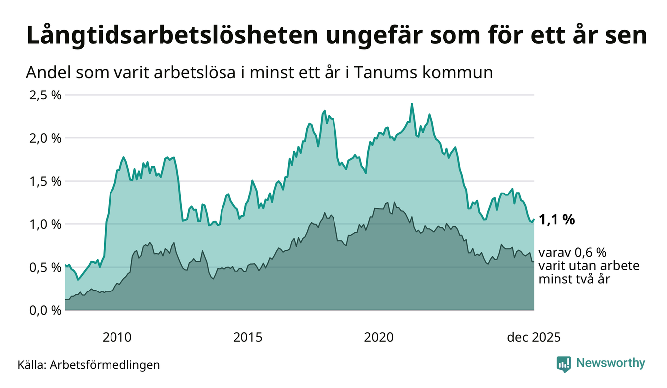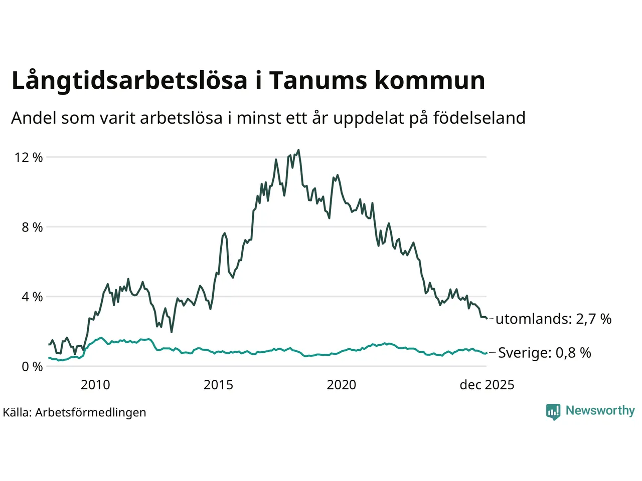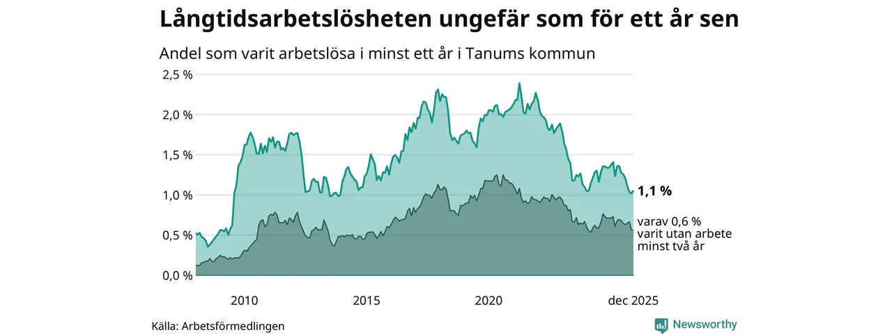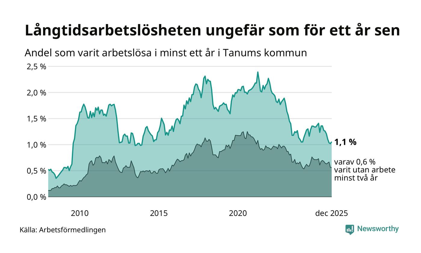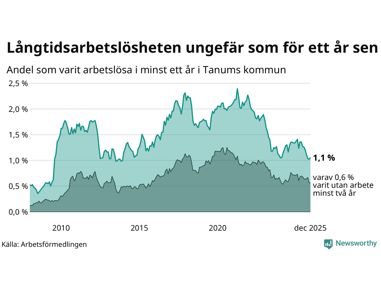 I december hade 60 Tanumsbor varit arbetslösa i minst ett år, vilket är två fler än månaden innan. Det är den första månaden sedan maj 2025 som antalet arbetslösa ökar. 60 personer motsvarar 1,1 procent av arbetskraften i kommunen – andelen långtidsarbetslösa är ungefär på samma nivå som för ett år sedan. Tanum tillhör de kommuner som har lägst andel långtidsarbetslösa i hela landet just nu.
