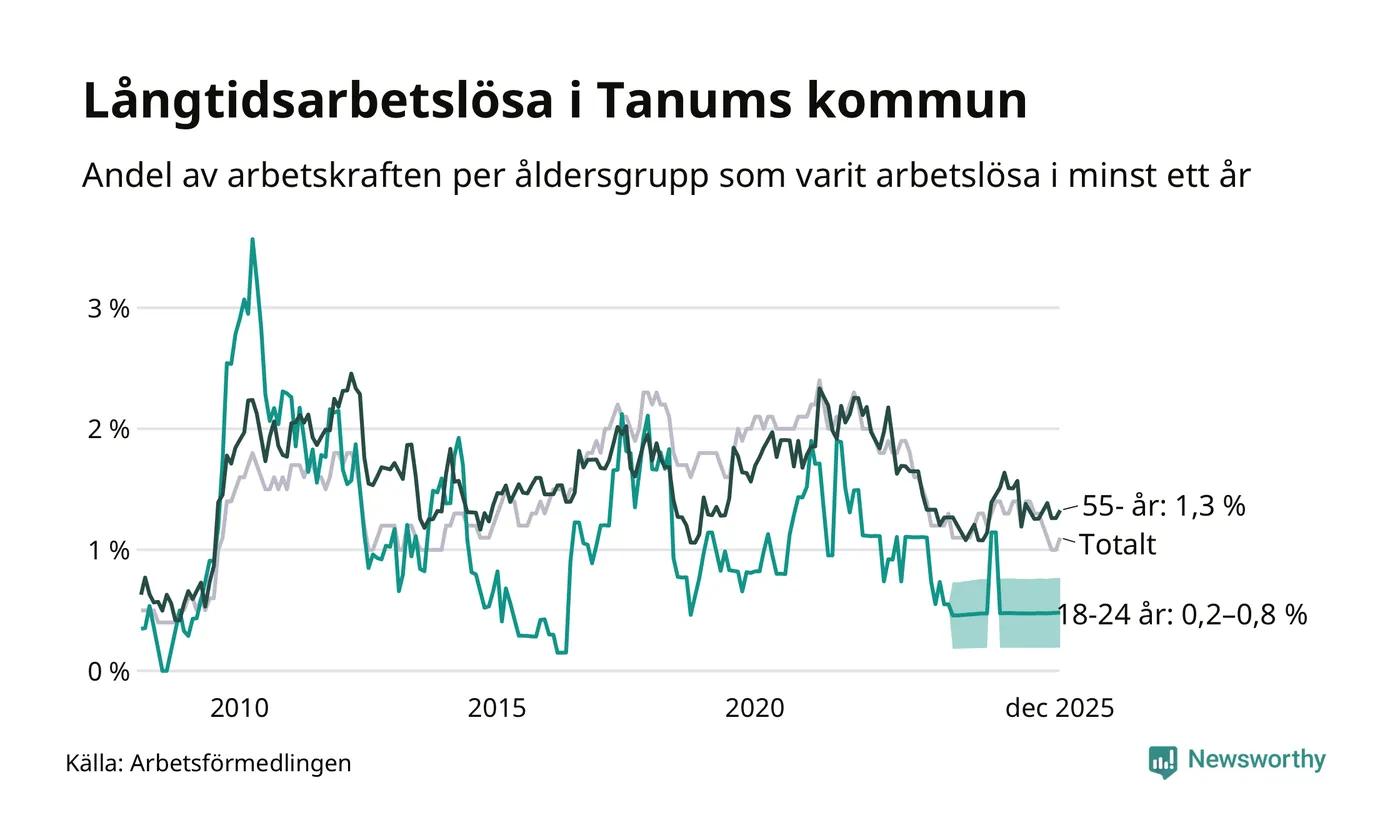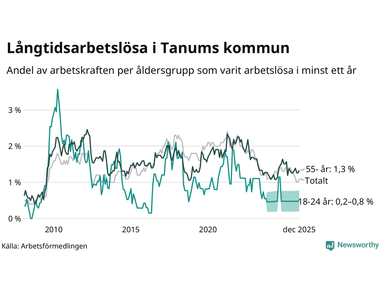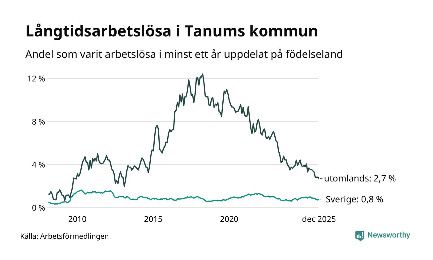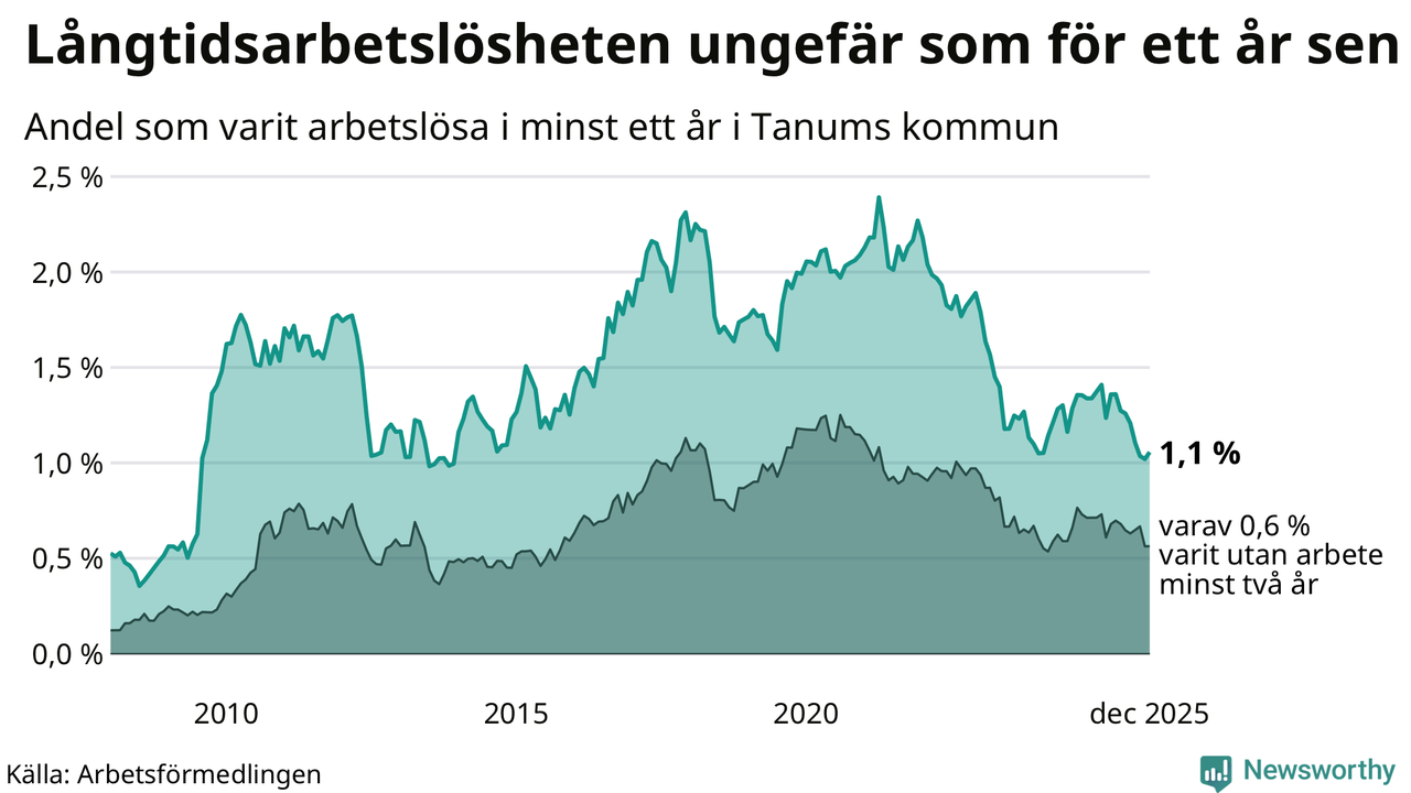 I december hade 60 Tanumsbor varit arbetslösa i minst ett år, vilket är två fler än månaden innan. Det är den första månaden sedan maj 2025 som antalet arbetslösa ökar. 60 personer motsvarar 1,1 procent av arbetskraften i kommunen – andelen långtidsarbetslösa är ungefär på samma nivå som för ett år sedan. Tanum tillhör de kommuner som har lägst andel långtidsarbetslösa i hela landet just nu.