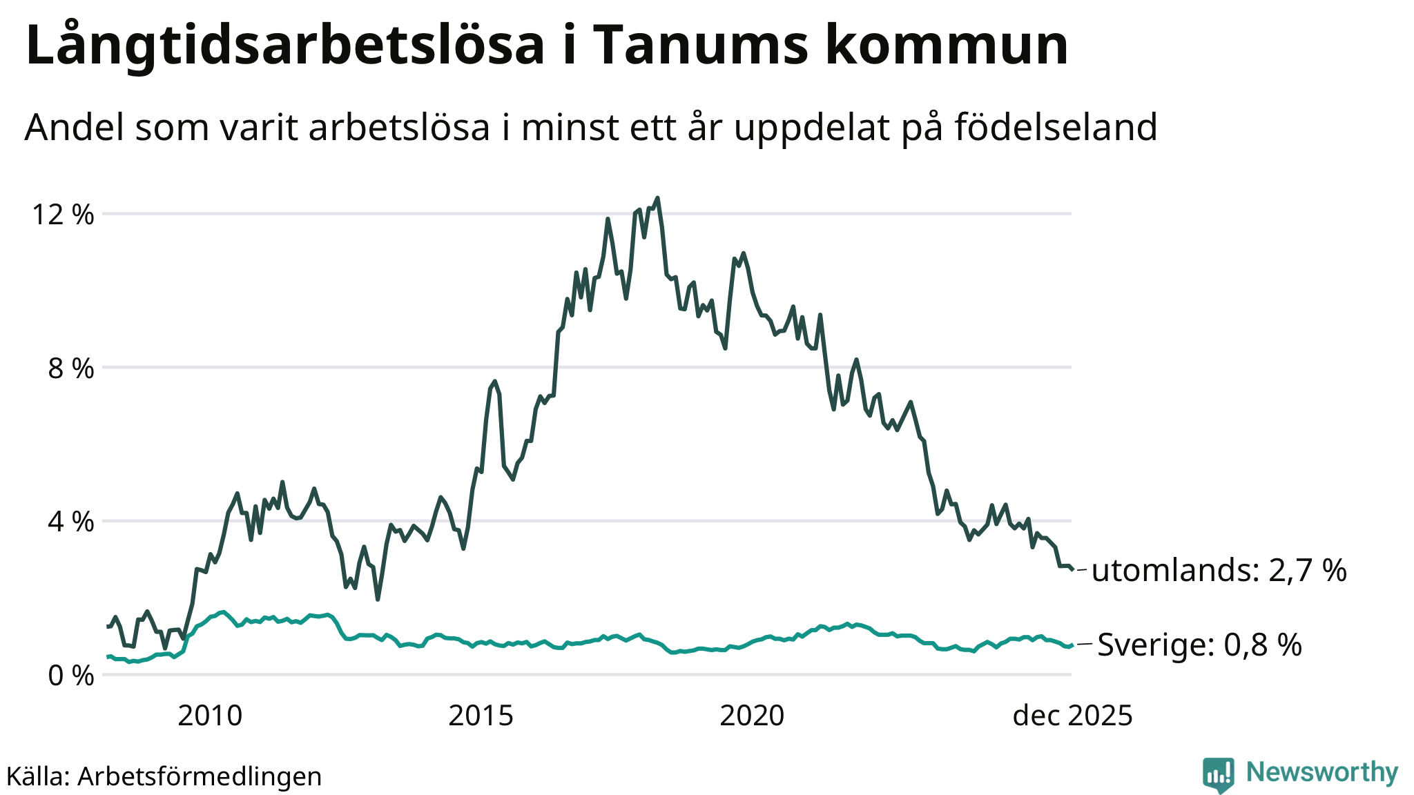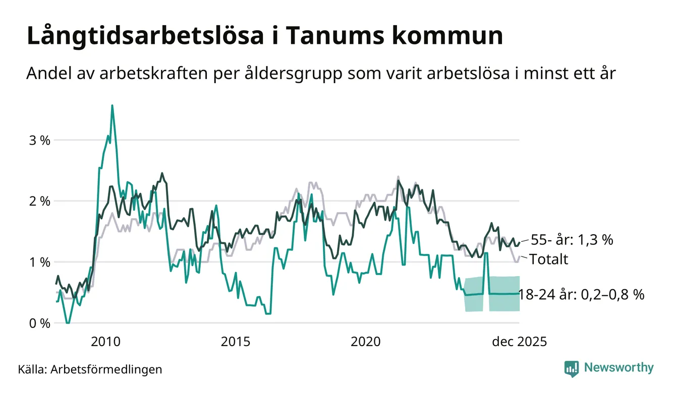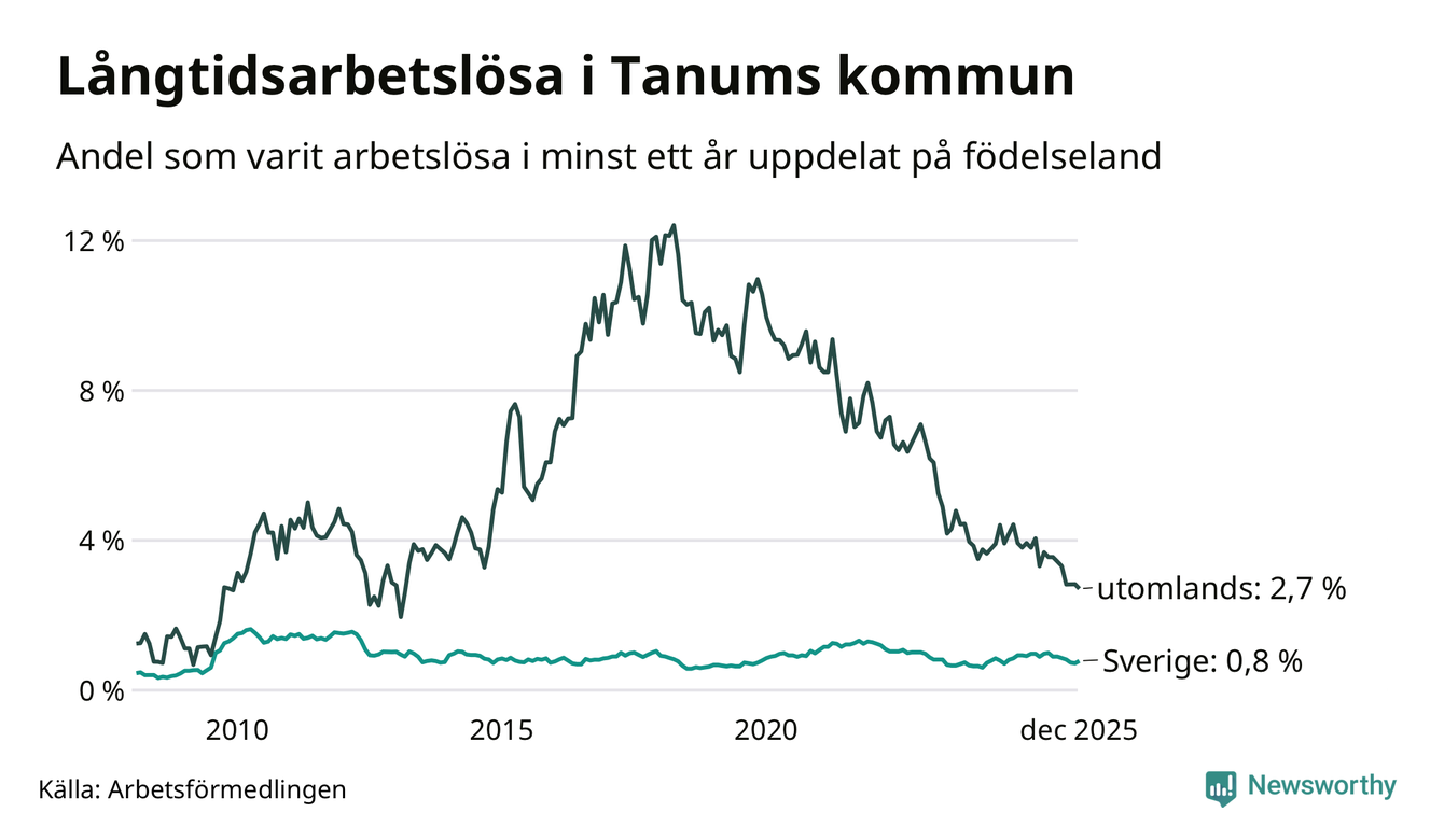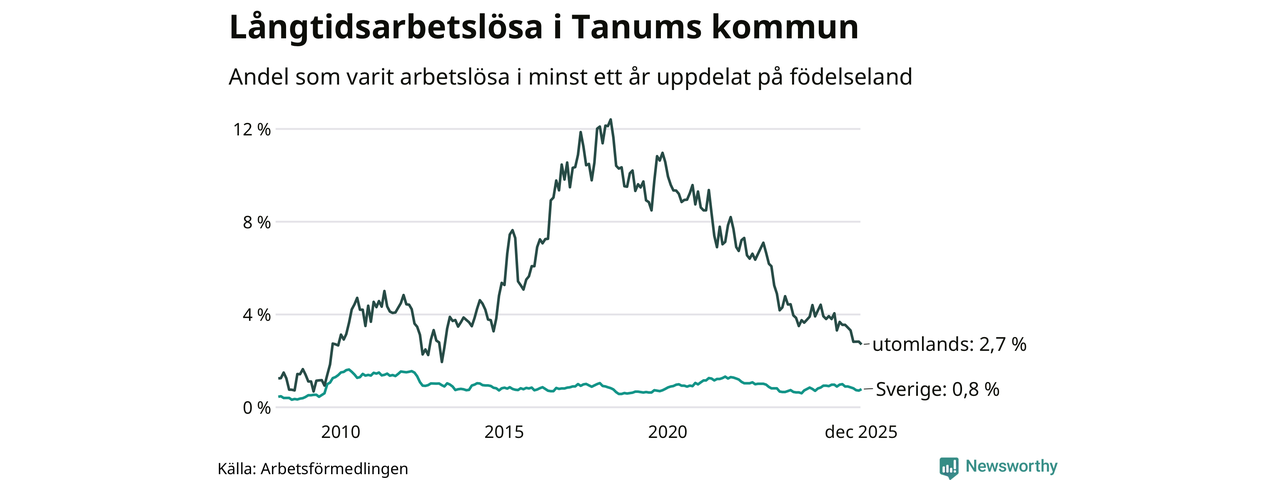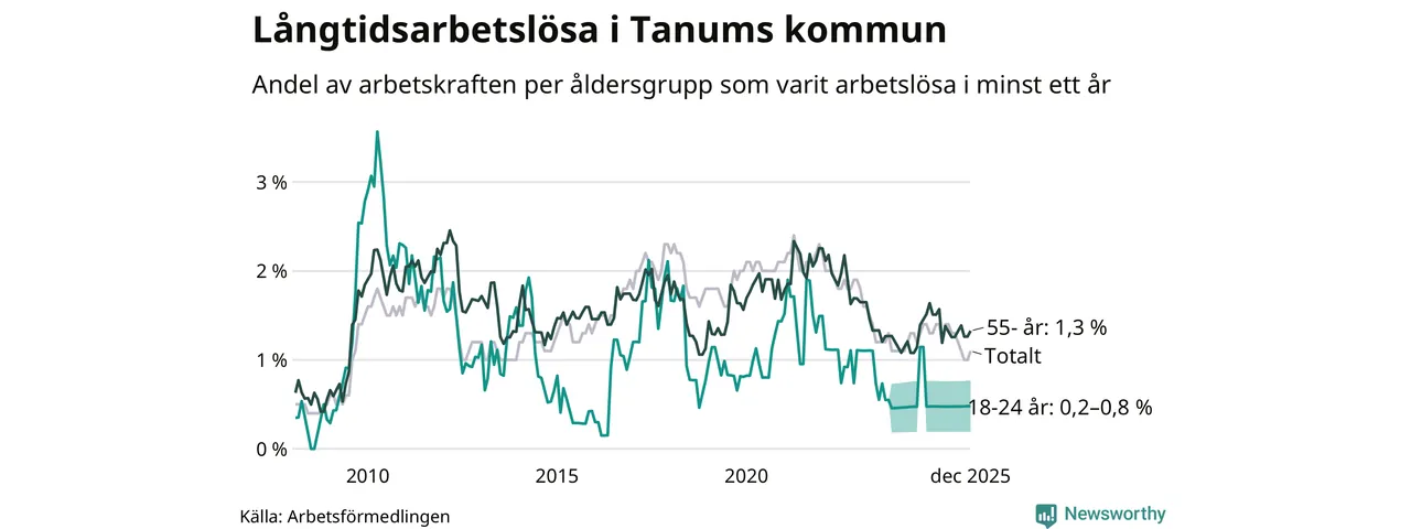 I december hade 60 Tanumsbor varit arbetslösa i minst ett år, vilket är två fler än månaden innan. Det är den första månaden sedan maj 2025 som antalet arbetslösa ökar. 60 personer motsvarar 1,1 procent av arbetskraften i kommunen – andelen långtidsarbetslösa är ungefär på samma nivå som för ett år sedan. Tanum tillhör de kommuner som har lägst andel långtidsarbetslösa i hela landet just nu.