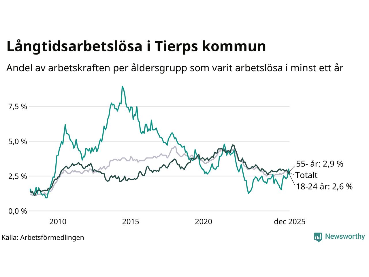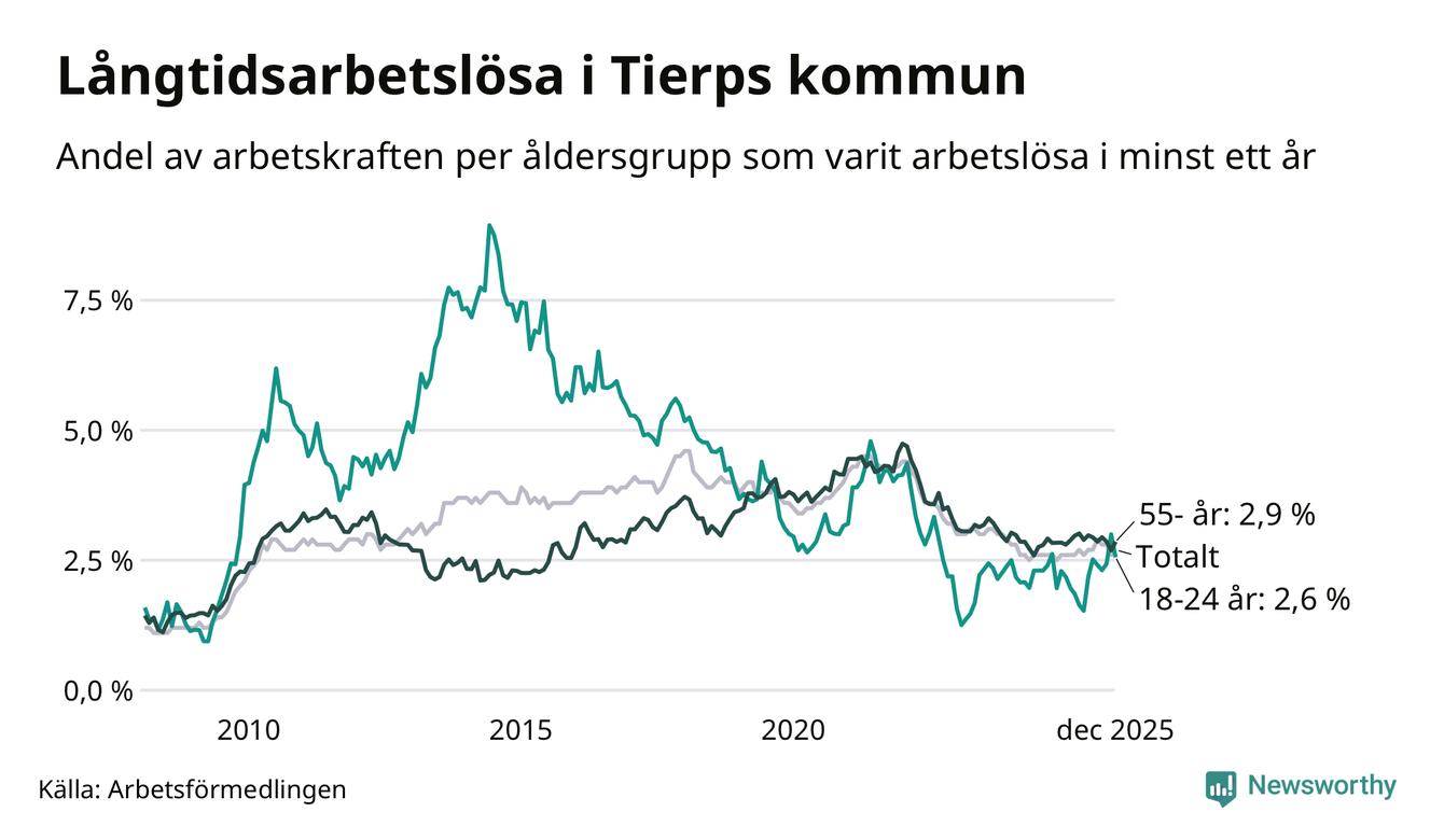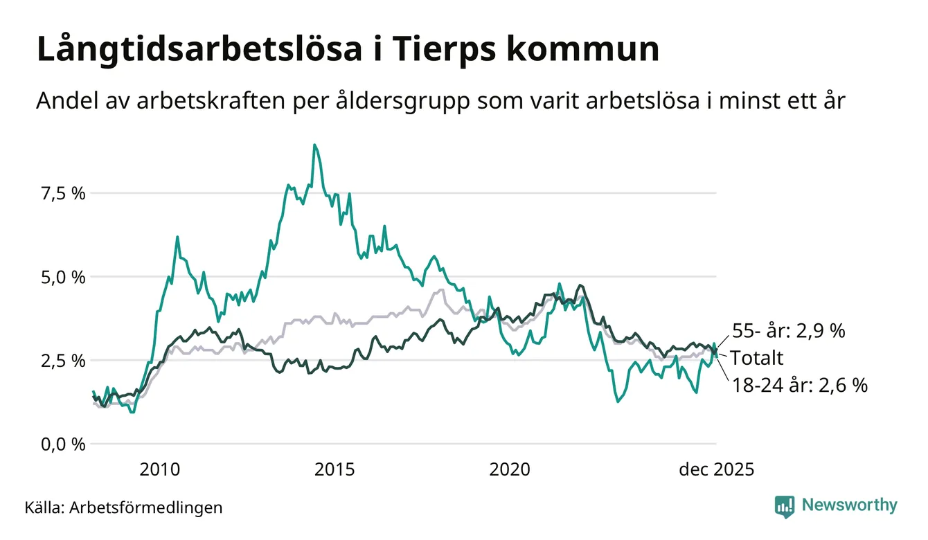 Av de 265 personerna som varit arbetslösa i mer än ett år i Tierps kommun är 68 personer mellan 55 och 651 år och 23 är mellan 18 och 24 år. För den äldre gruppen är andelen arbetslösa 2,9 procent medan den i den yngre gruppen är 2,6 procent. Även i riket som helhet är långtidsarbetslösheten högre i gruppen äldre.