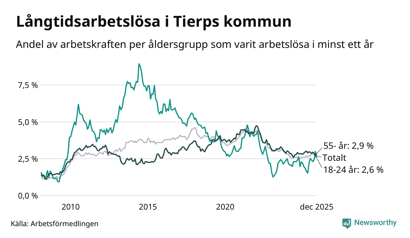 Graf: Andel arbetslösa uppdelat i åldersgrupper i Tierp