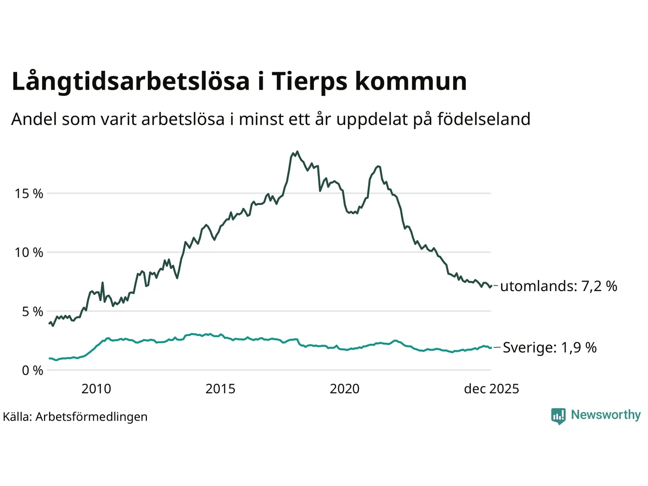 158 av de långtidsarbetslösa i Tierp är födda i Sverige, medan 107 är födda utomlands. Det innebär att långtidsarbetslösheten bland Sverigefödda är 1,9 procent, medan den är fyra gånger så hög – 7,2 procent – bland födda utomlands. Även i riket som helhet är arbetslösheten högre bland utrikesfödda.
