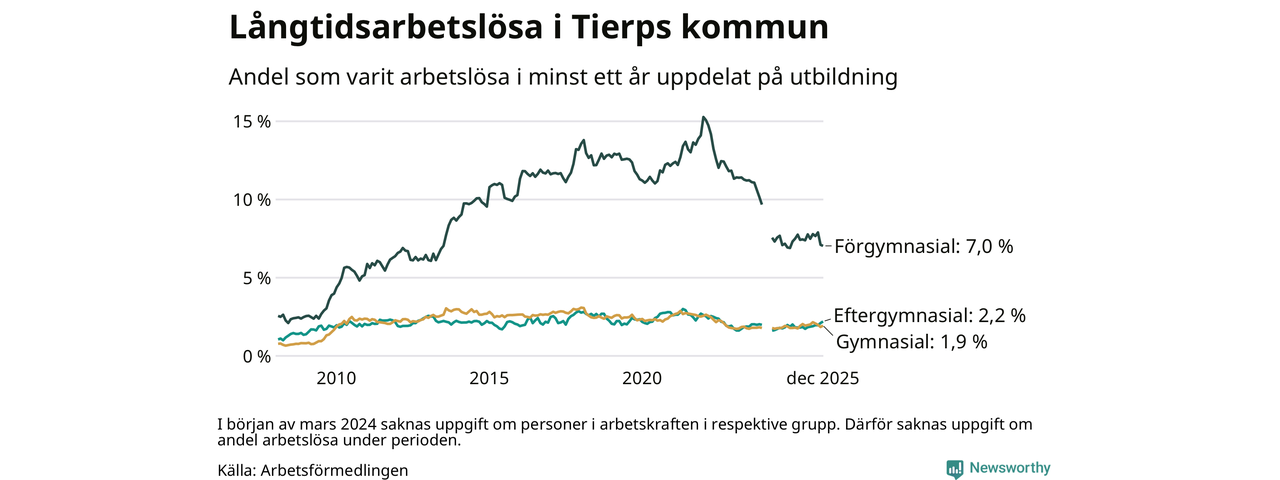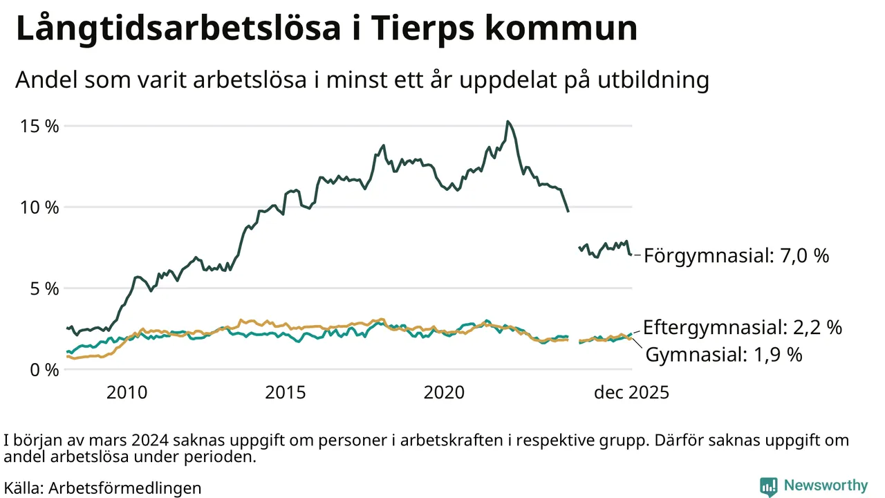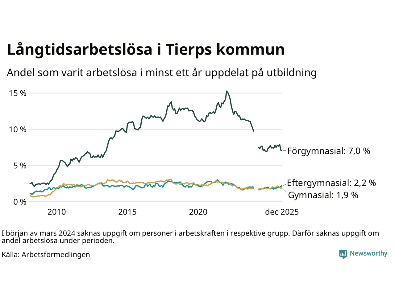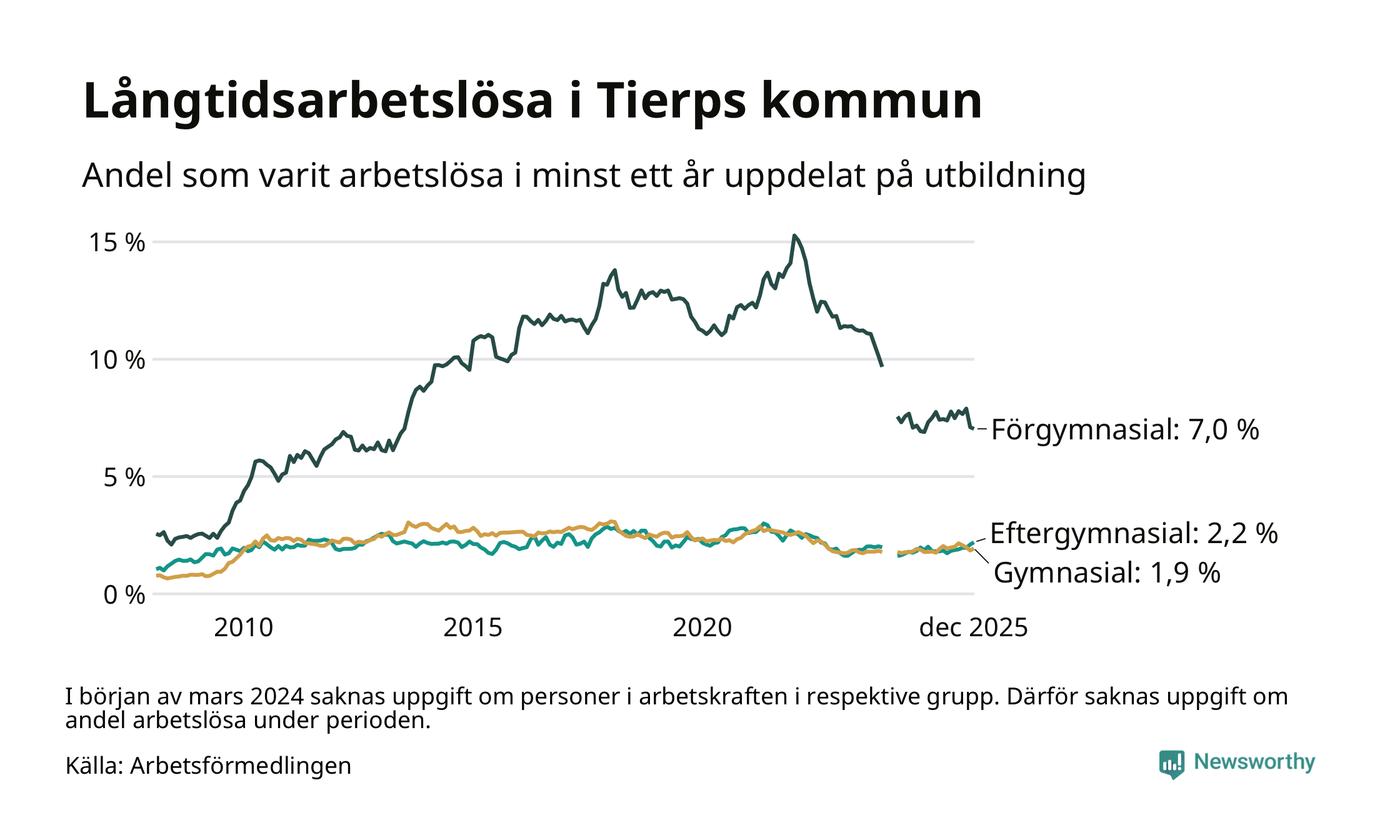 Graf: Andel arbetslösa i Tierp som varit utan arbete i minst 12 månader
