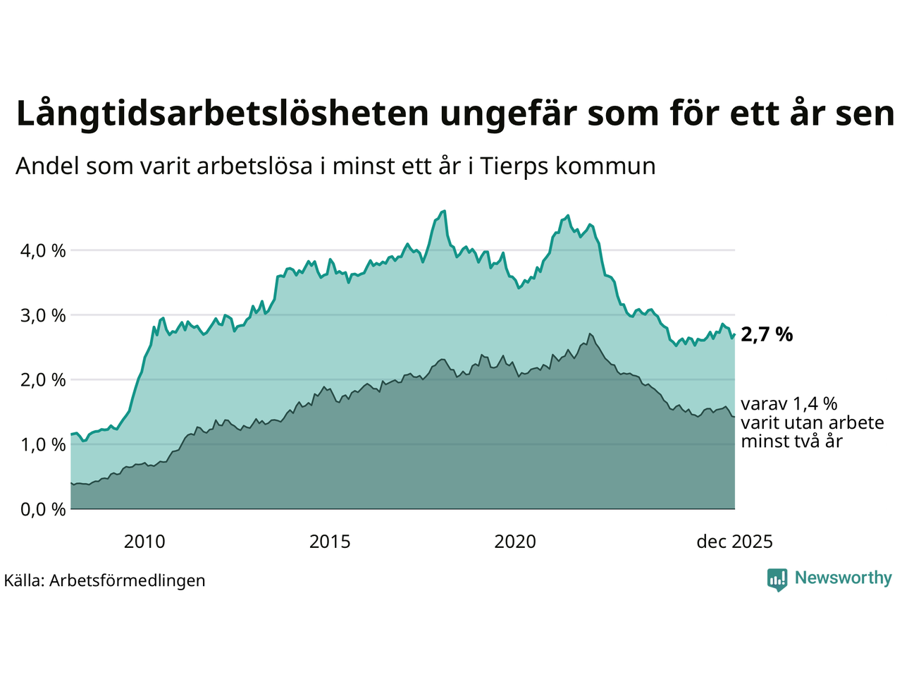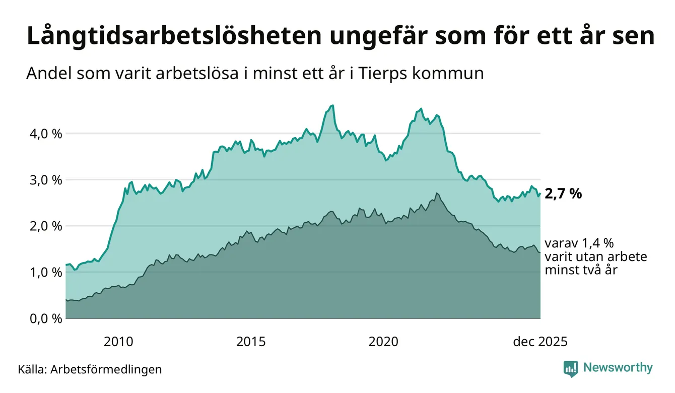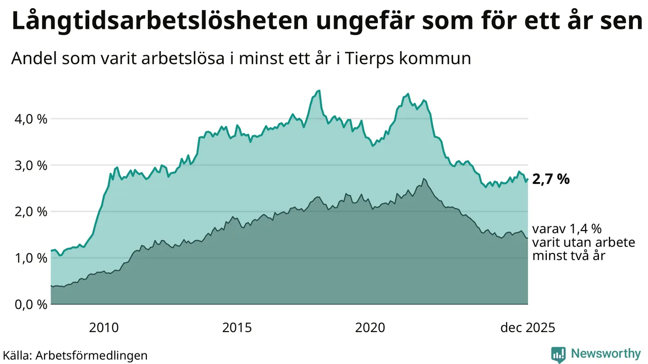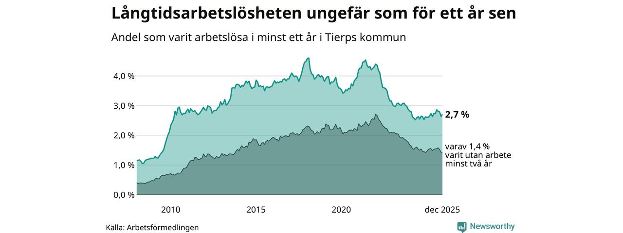 Andelen som varit utan arbete i minst ett år i Tierp var ungefär lika stor i december jämfört med samma månad för ett år sedan. Det visar Arbetsfömedlingens senaste månadsstatistik.