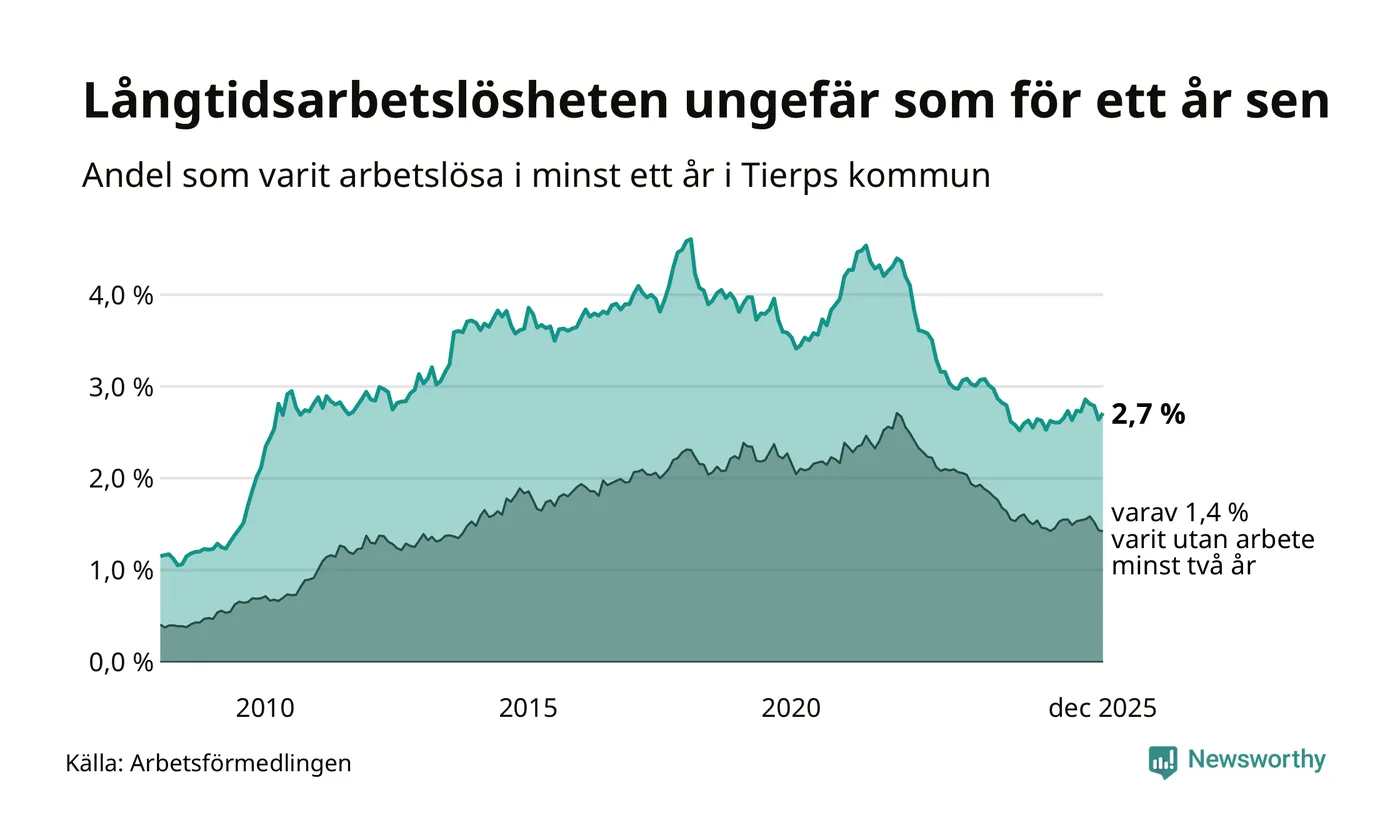 I december hade 265 Tierpsbor varit arbetslösa i minst ett år, vilket är sju fler än månaden innan. 265 personer motsvarar 2,7 procent av arbetskraften i kommunen – andelen långtidsarbetslösa är ungefär på samma nivå som för ett år sedan.