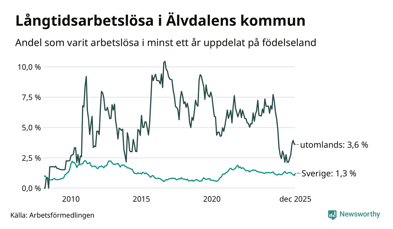 Graf: Andel arbetslösa uppdelat på födelseland i Älvdalen
