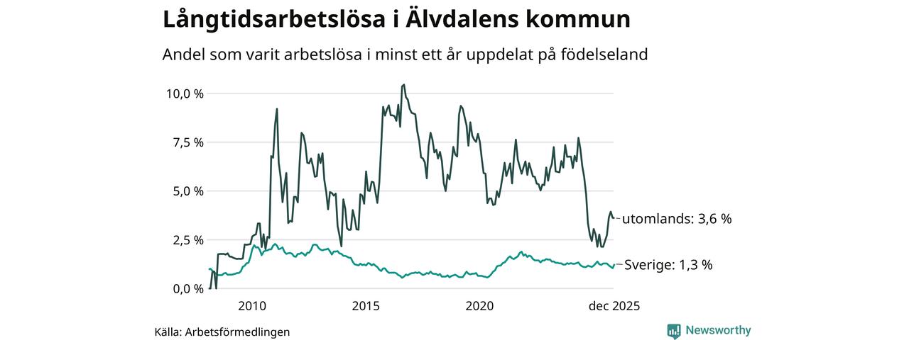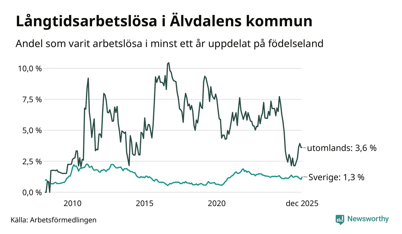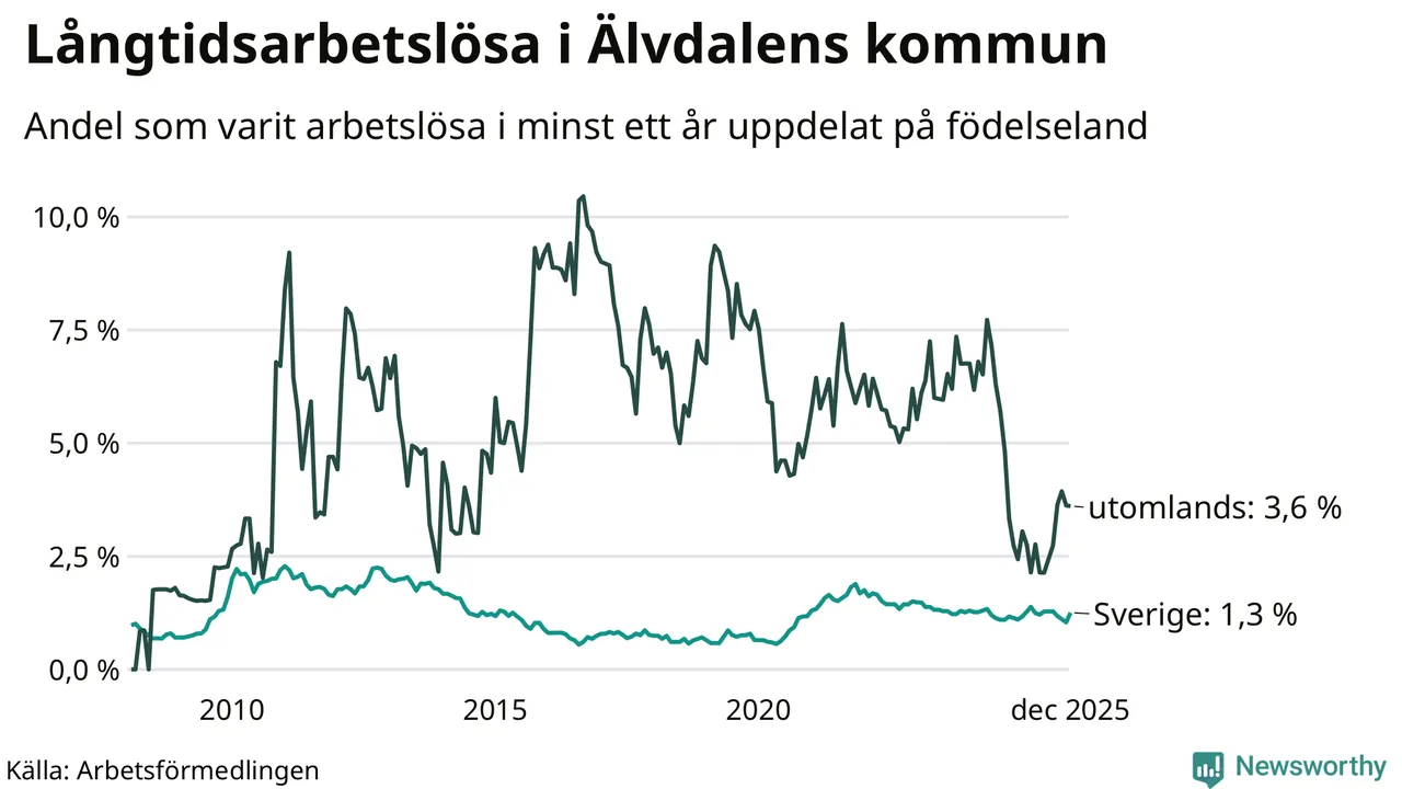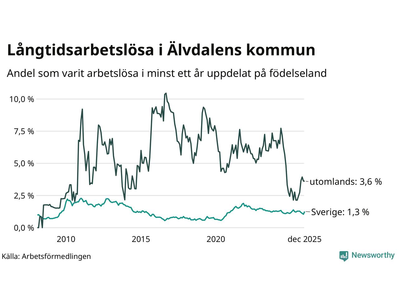 36 av de långtidsarbetslösa i Älvdalen är födda i Sverige, medan tolv är födda utomlands. Det innebär att långtidsarbetslösheten bland Sverigefödda är 1,3 procent, medan den är tre gånger så hög – 3,6 procent – bland födda utomlands. Även i riket som helhet är arbetslösheten högre bland utrikesfödda.