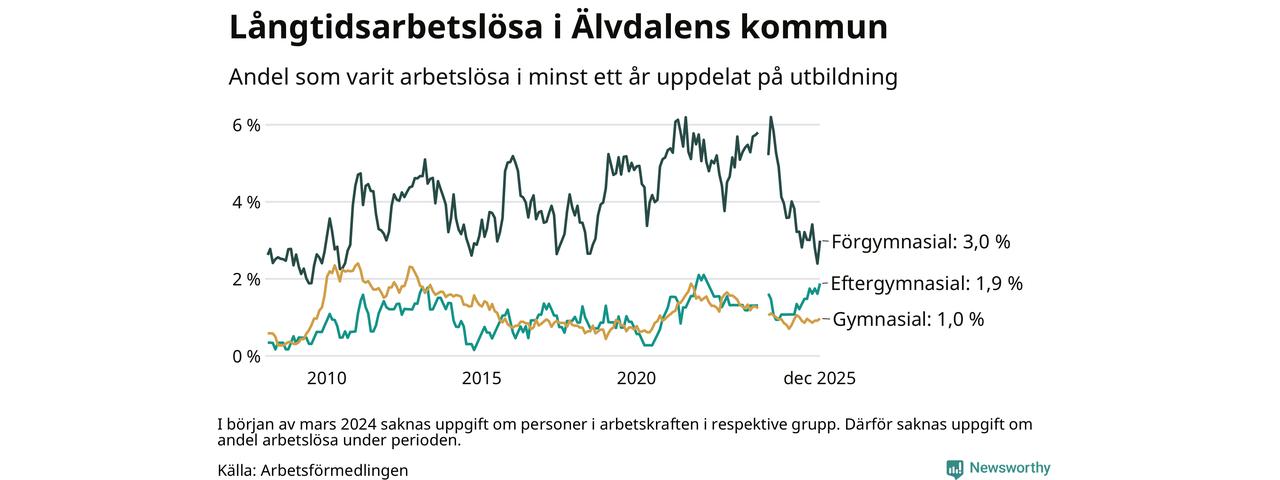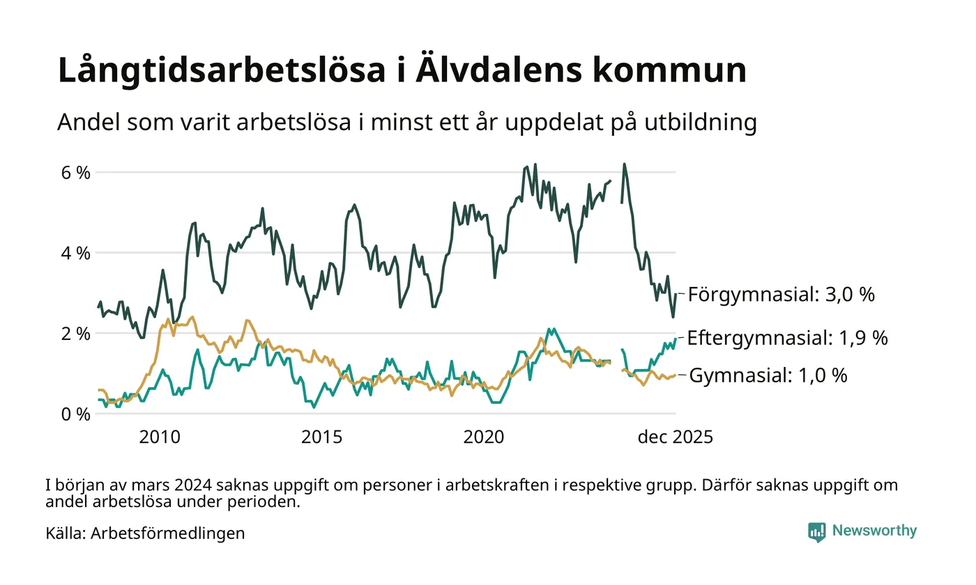Graf: Andel arbetslösa i Älvdalen som varit utan arbete i minst 12 månader
