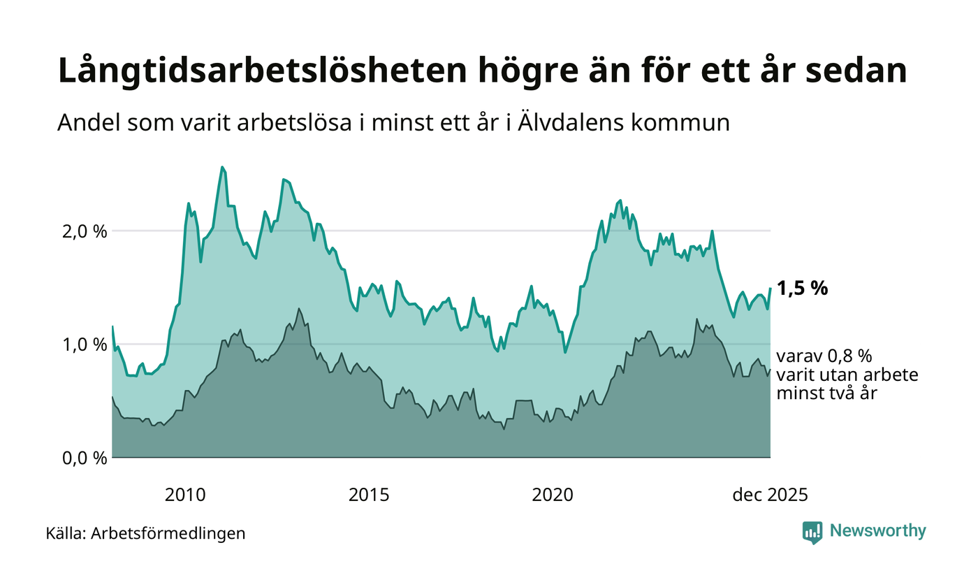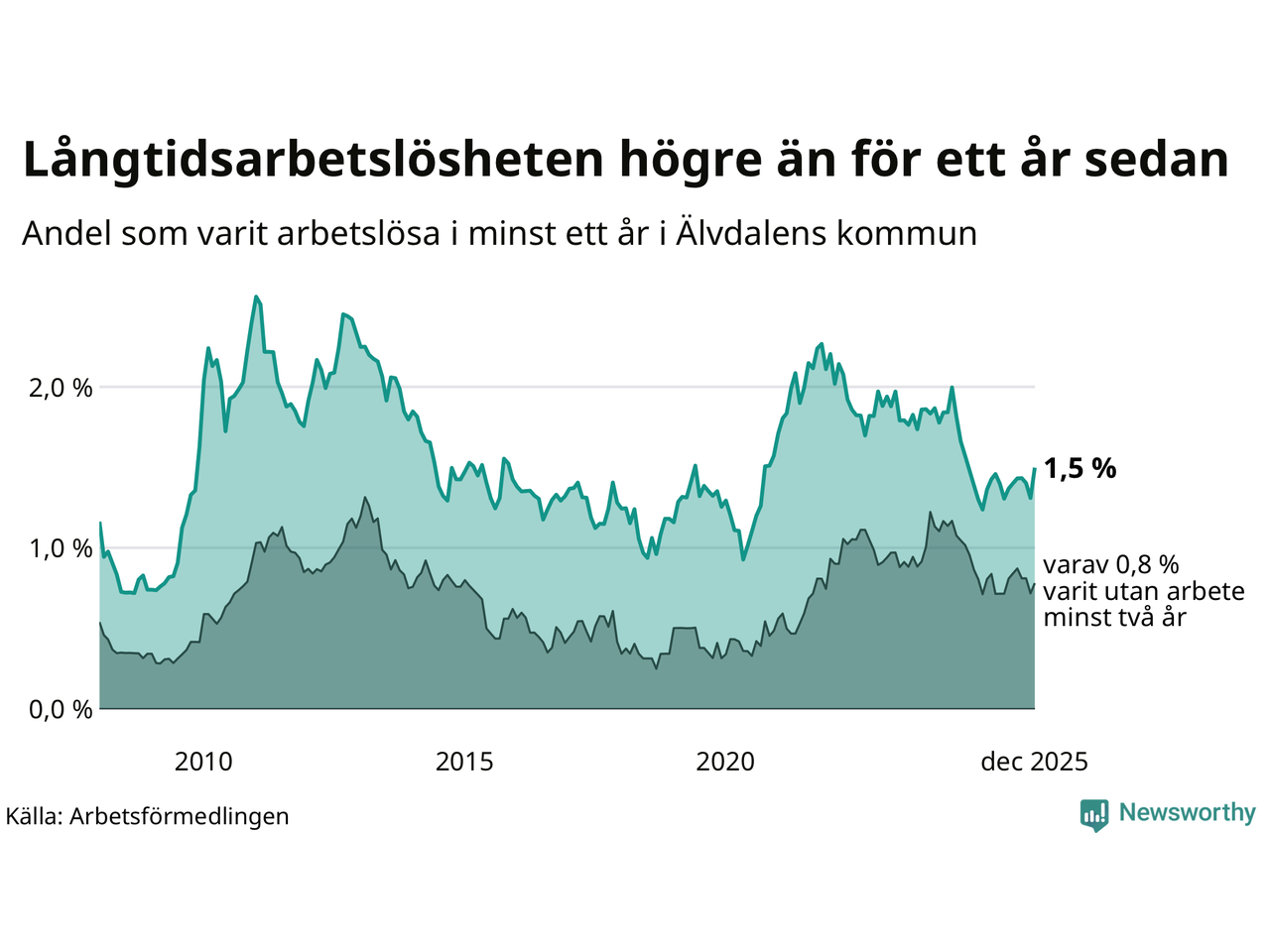 I december hade 48 Älvdalsbor varit arbetslösa i minst ett år, vilket är sex fler än månaden innan. 48 personer motsvarar 1,5 procent av arbetskraften i kommunen – andelen långtidsarbetslösa är 0,3 procentenheter högre än samma månad för ett år sedan.