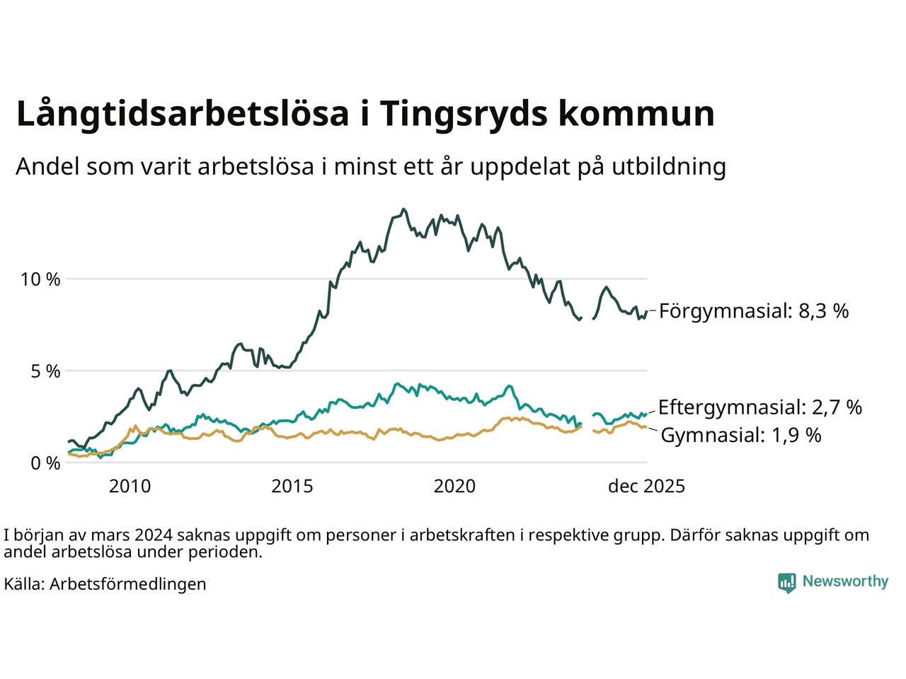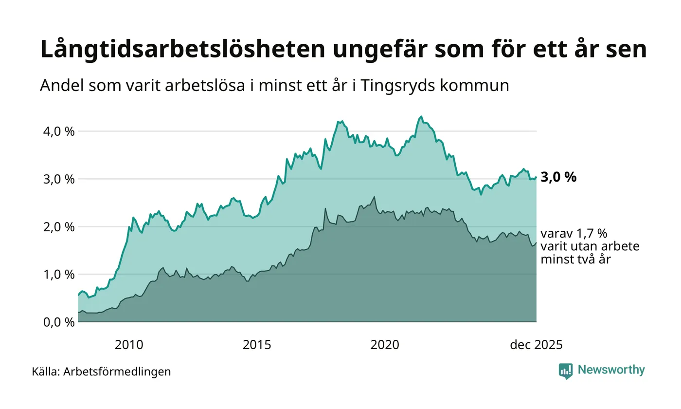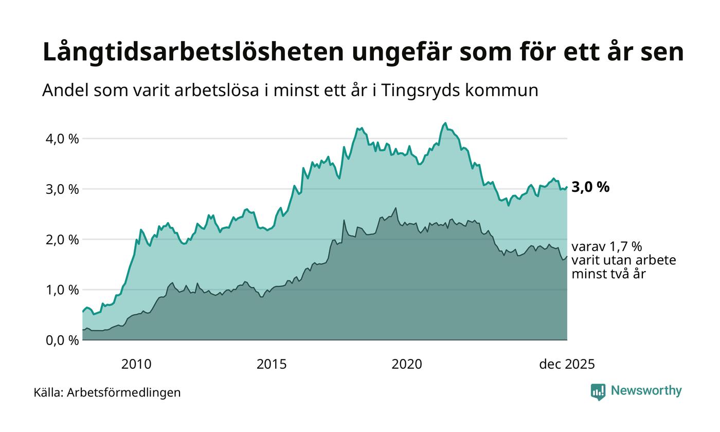 I december hade 161 Tingsrydsbor varit arbetslösa i minst ett år, vilket är tre fler än månaden innan. 161 personer motsvarar 3,0 procent av arbetskraften i kommunen – andelen långtidsarbetslösa är ungefär på samma nivå som för ett år sedan.