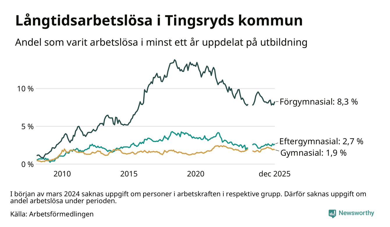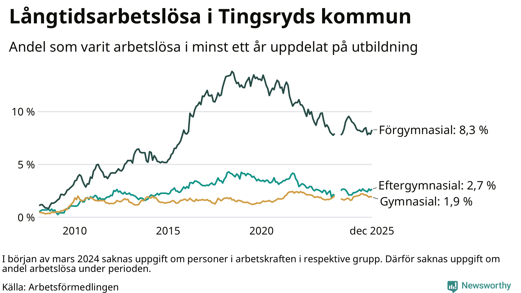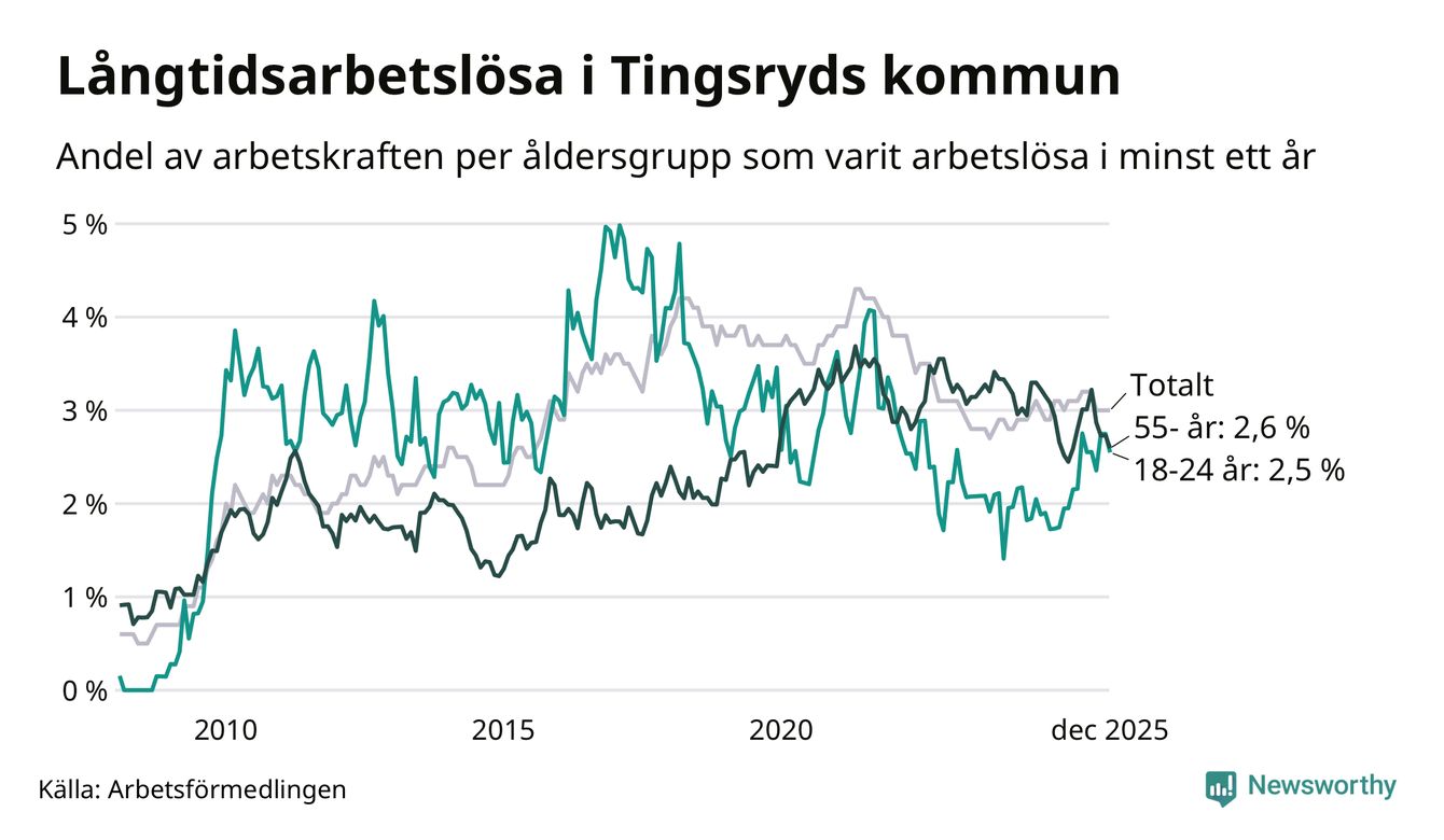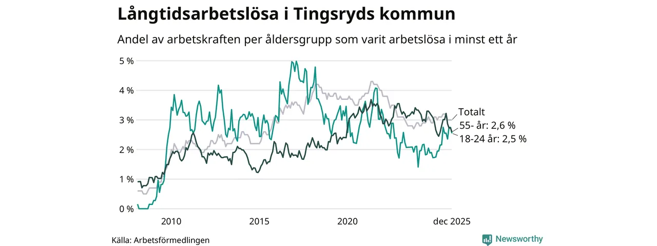 I december hade 161 Tingsrydsbor varit arbetslösa i minst ett år, vilket är tre fler än månaden innan. 161 personer motsvarar 3,0 procent av arbetskraften i kommunen – andelen långtidsarbetslösa är ungefär på samma nivå som för ett år sedan.