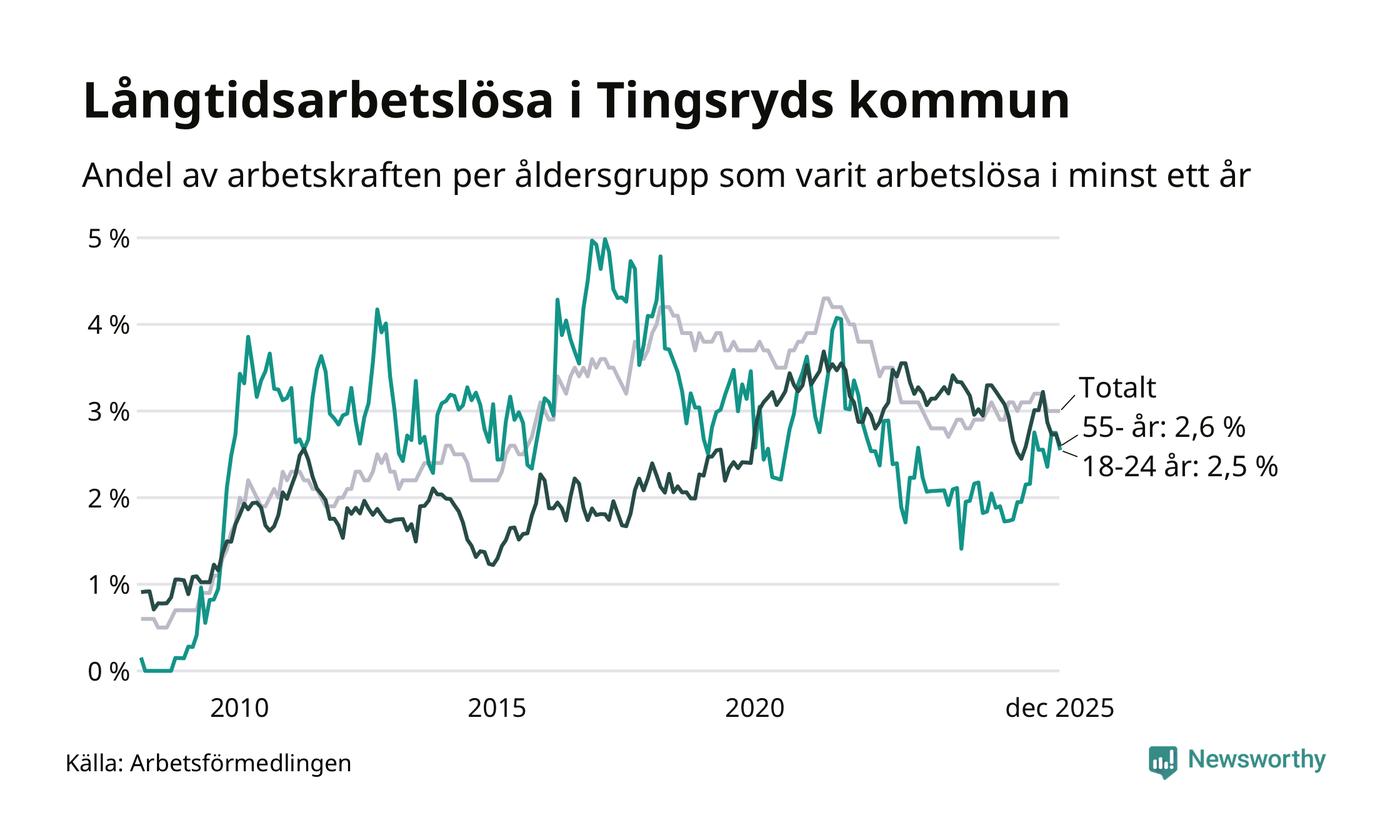 Av de 161 personerna som varit arbetslösa i mer än ett år i Tingsryds kommun är 37 personer mellan 55 och 651 år och 13 är mellan 18 och 24 år. Som andel av arbetskraften innebär det att långtidsarbetslöheten är lägre i de båda grupperna än i arbetskraften totalt. I riket som helhet är andelen långtidsarbetslösa högre i den äldre gruppen.
