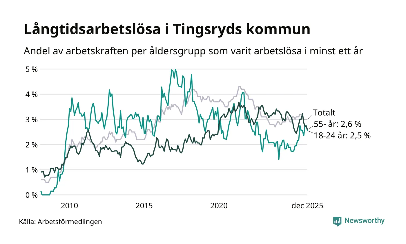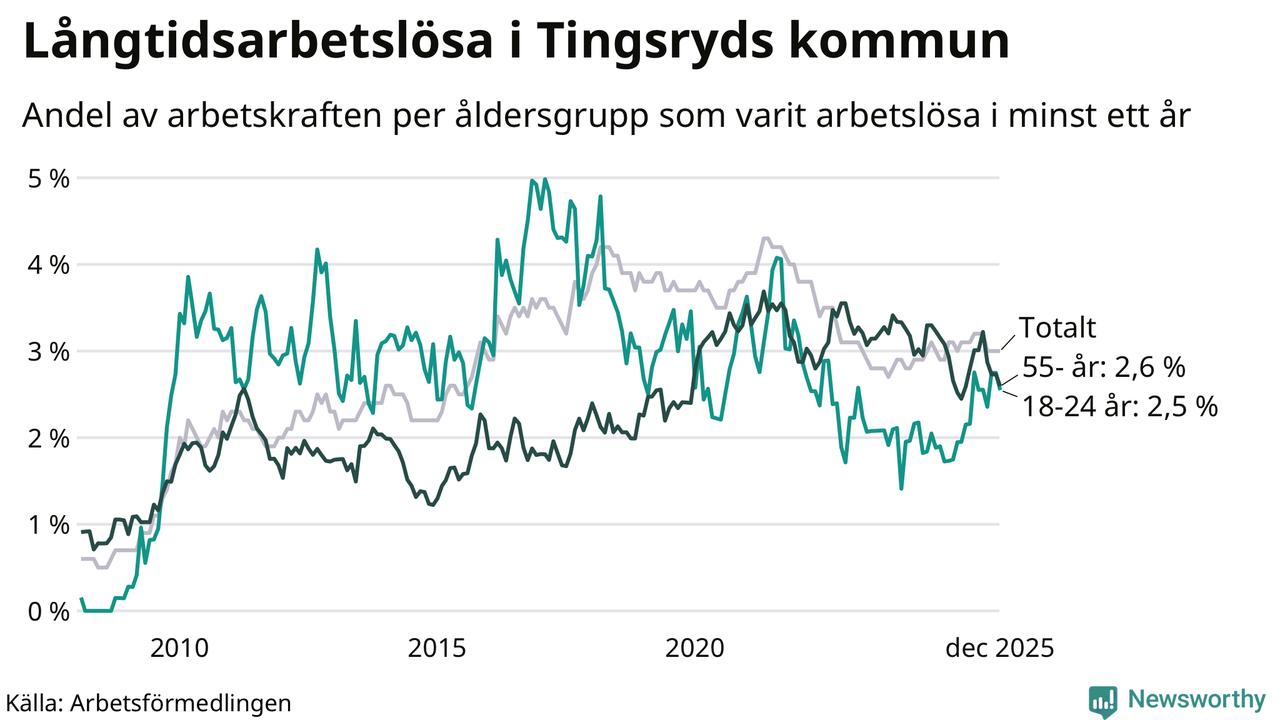 Andelen långtidsarbetslösa i Tingsryd är den näst lägsta i Kronobergs län, bara i Ljungby är andelen lägre (2,4 procent). I Lessebo finns länets högsta långtidsarbetslöshet, 4,8 procent. I Kronoberg som helhet hade 3 332 personer (3,3 procent) varit arbetslösa i minst ett år i december. Det är 14 personer fler än månaden innan.