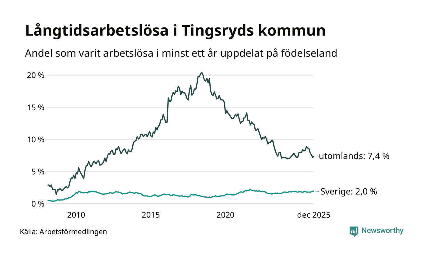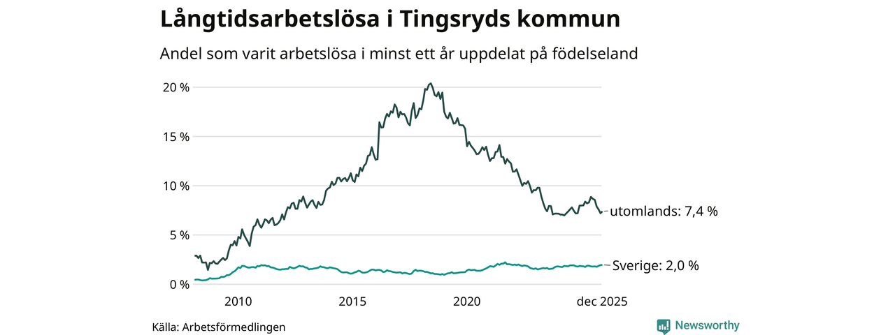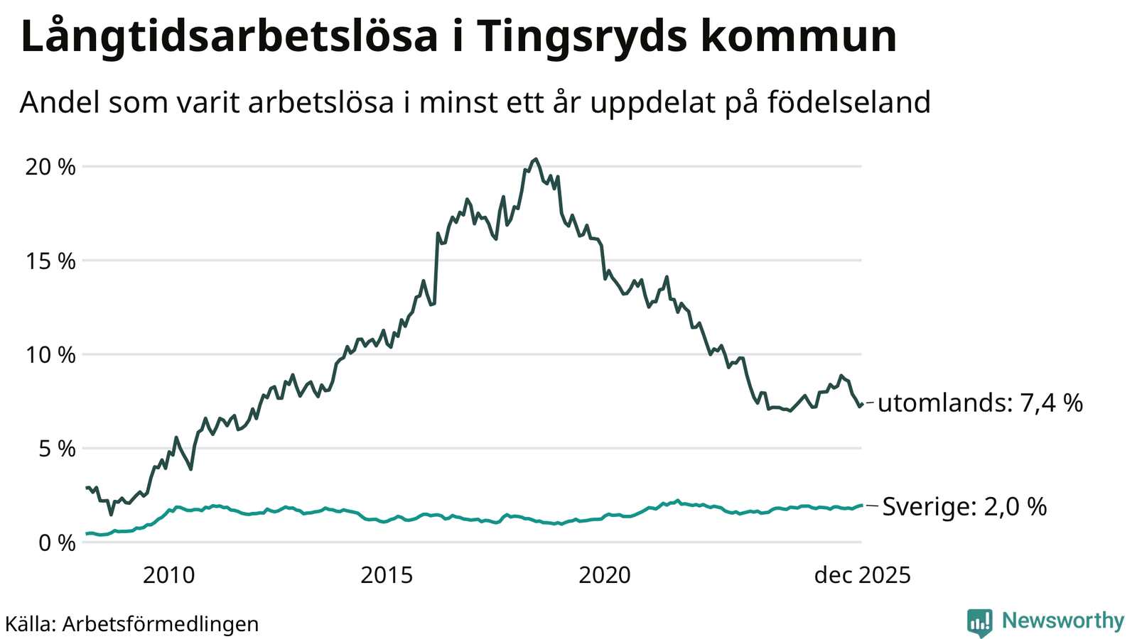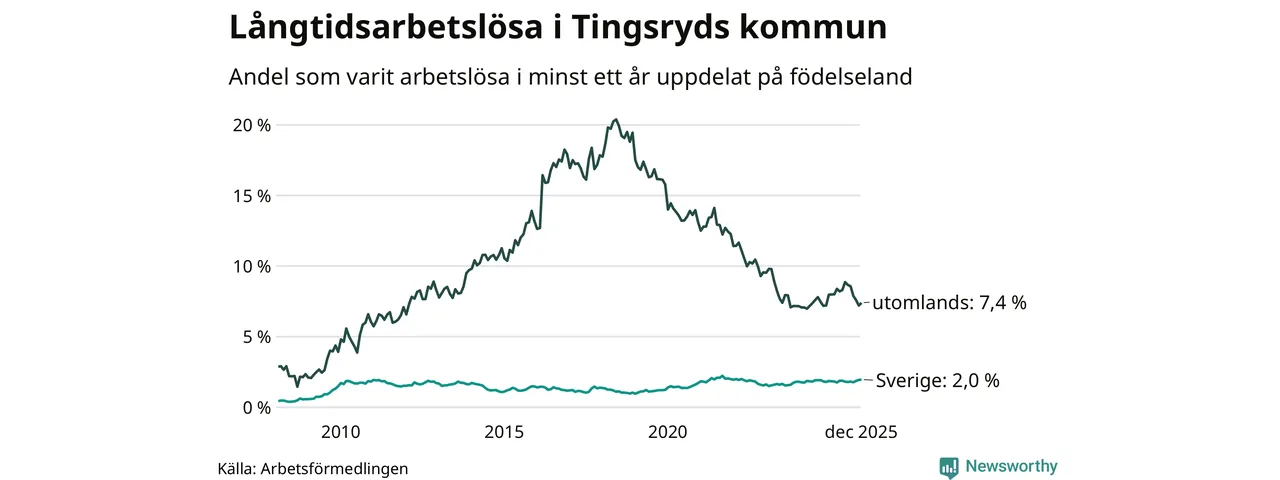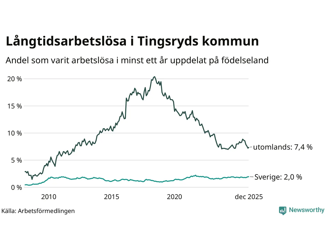 83 av de långtidsarbetslösa i Tingsryd är födda i Sverige, medan 78 är födda utomlands. Det innebär att långtidsarbetslösheten bland Sverigefödda är 2,0 procent, medan den är fyra gånger så hög – 7,4 procent – bland födda utomlands. Även i riket som helhet är arbetslösheten högre bland utrikesfödda.