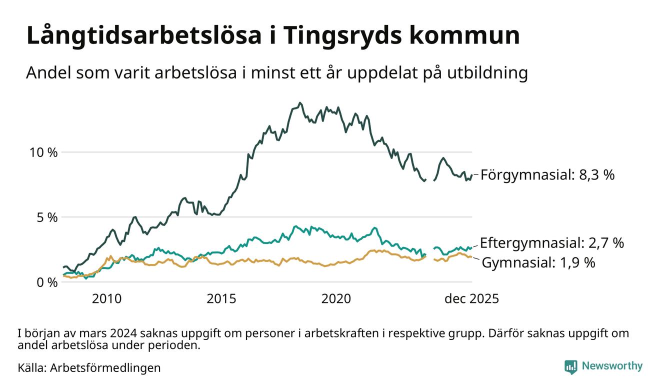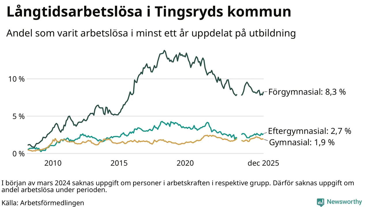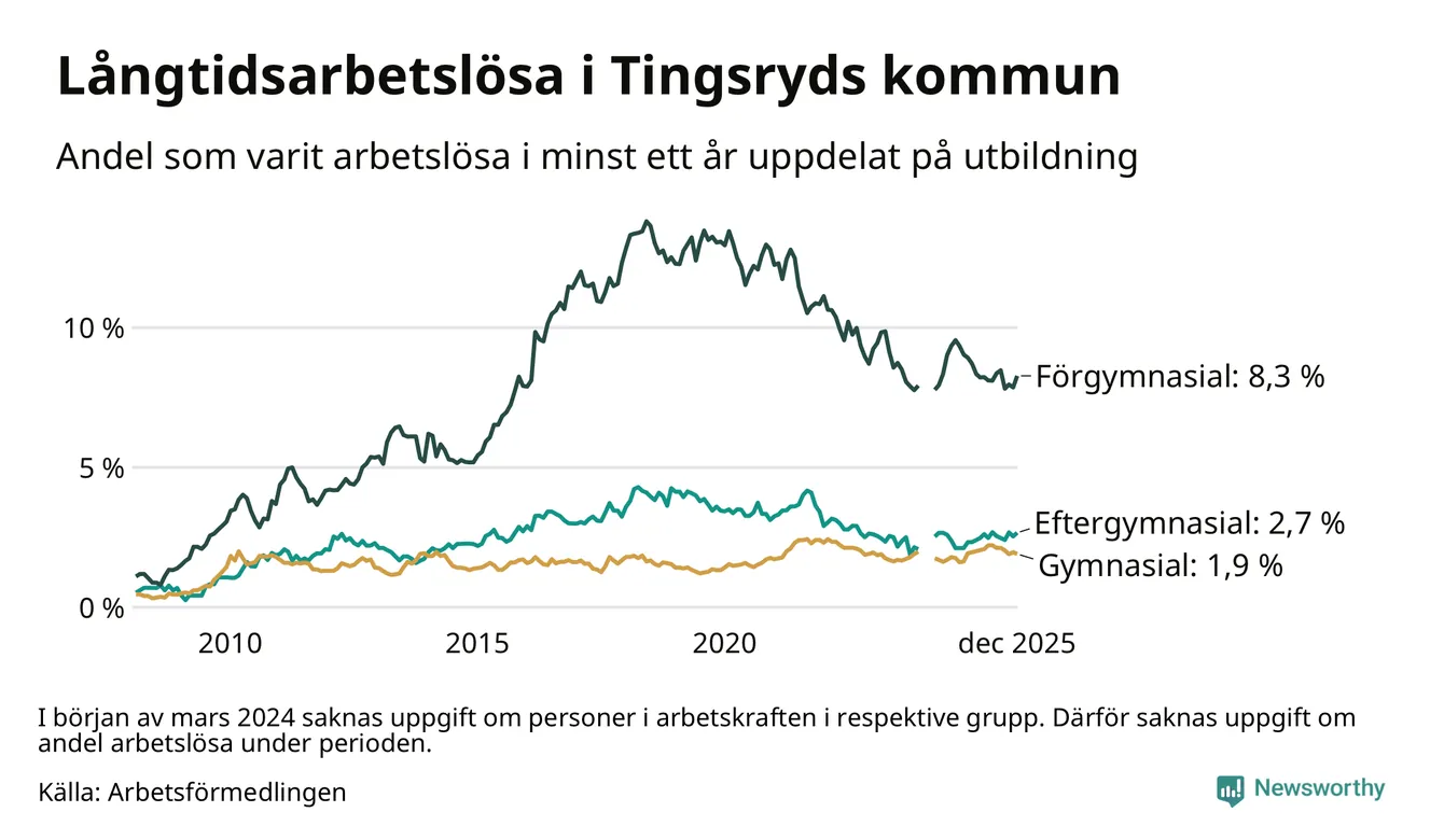 Andelen som varit utan arbete i minst ett år i Tingsryd var ungefär lika stor i december jämfört med samma månad för ett år sedan. Det visar Arbetsfömedlingens senaste månadsstatistik.