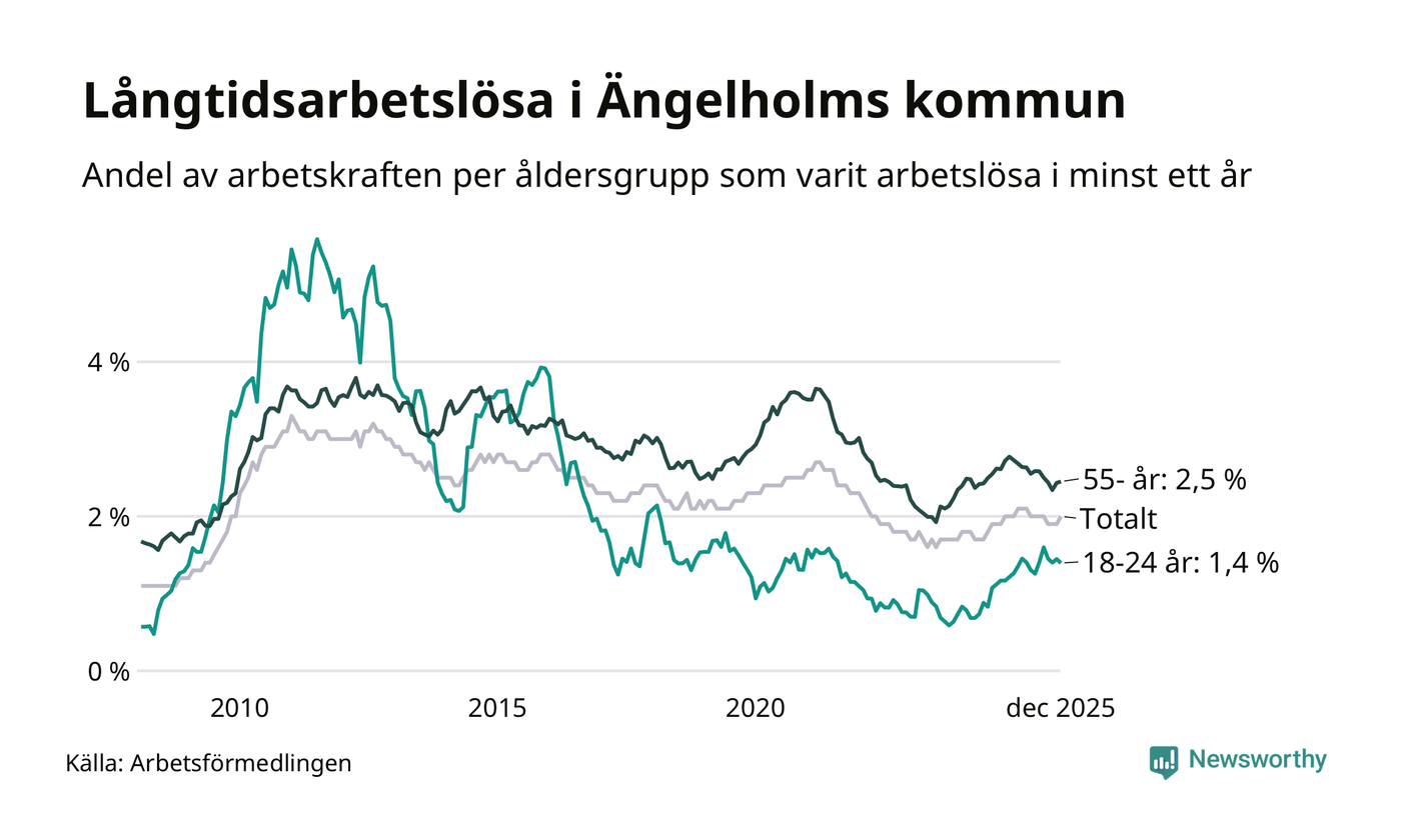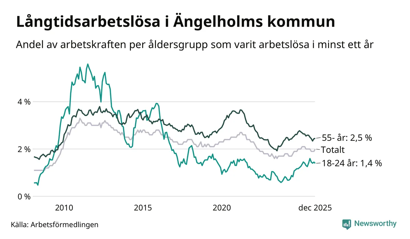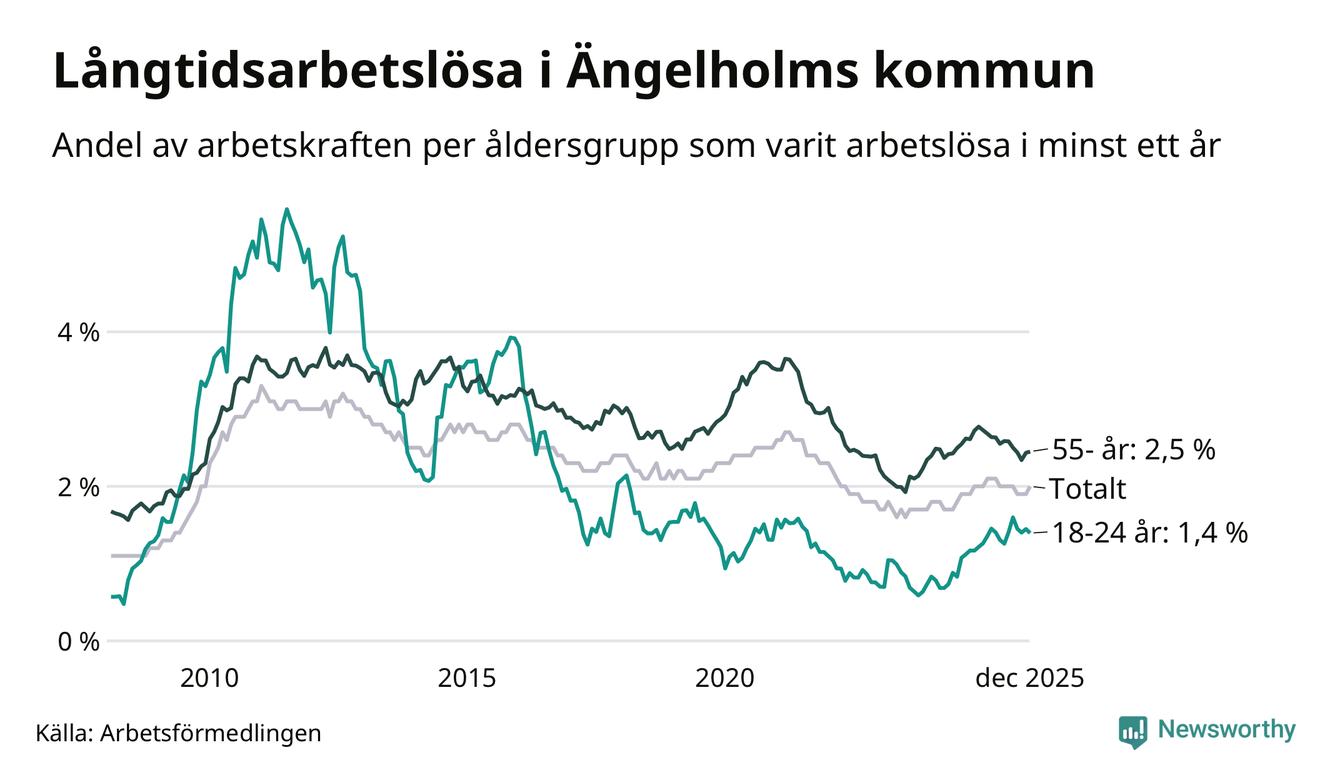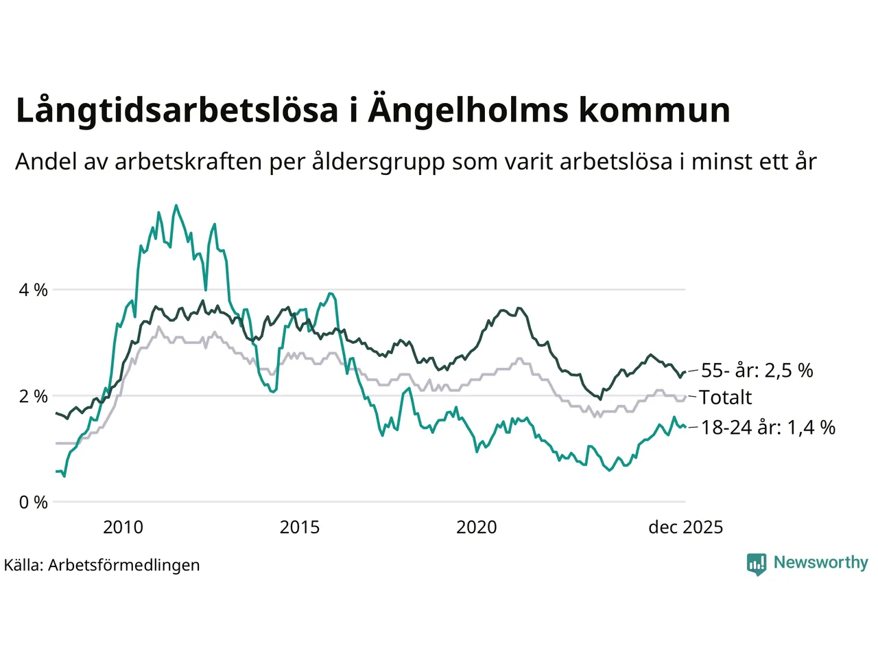 Av de 428 personerna som varit arbetslösa i mer än ett år i Ängelholms kommun är 128 personer mellan 55 och 651 år och 29 är mellan 18 och 24 år. För den äldre gruppen är andelen arbetslösa 2,5 procent medan den i den yngre gruppen är 1,4 procent. Även i riket som helhet är långtidsarbetslösheten högre i gruppen äldre.