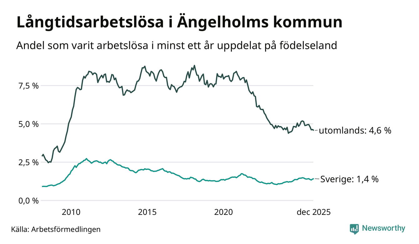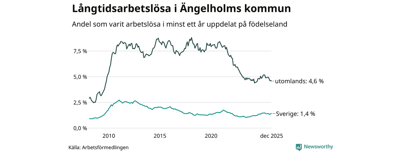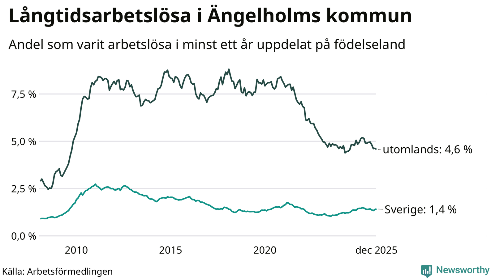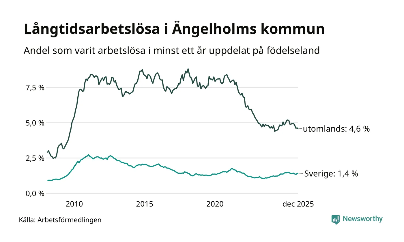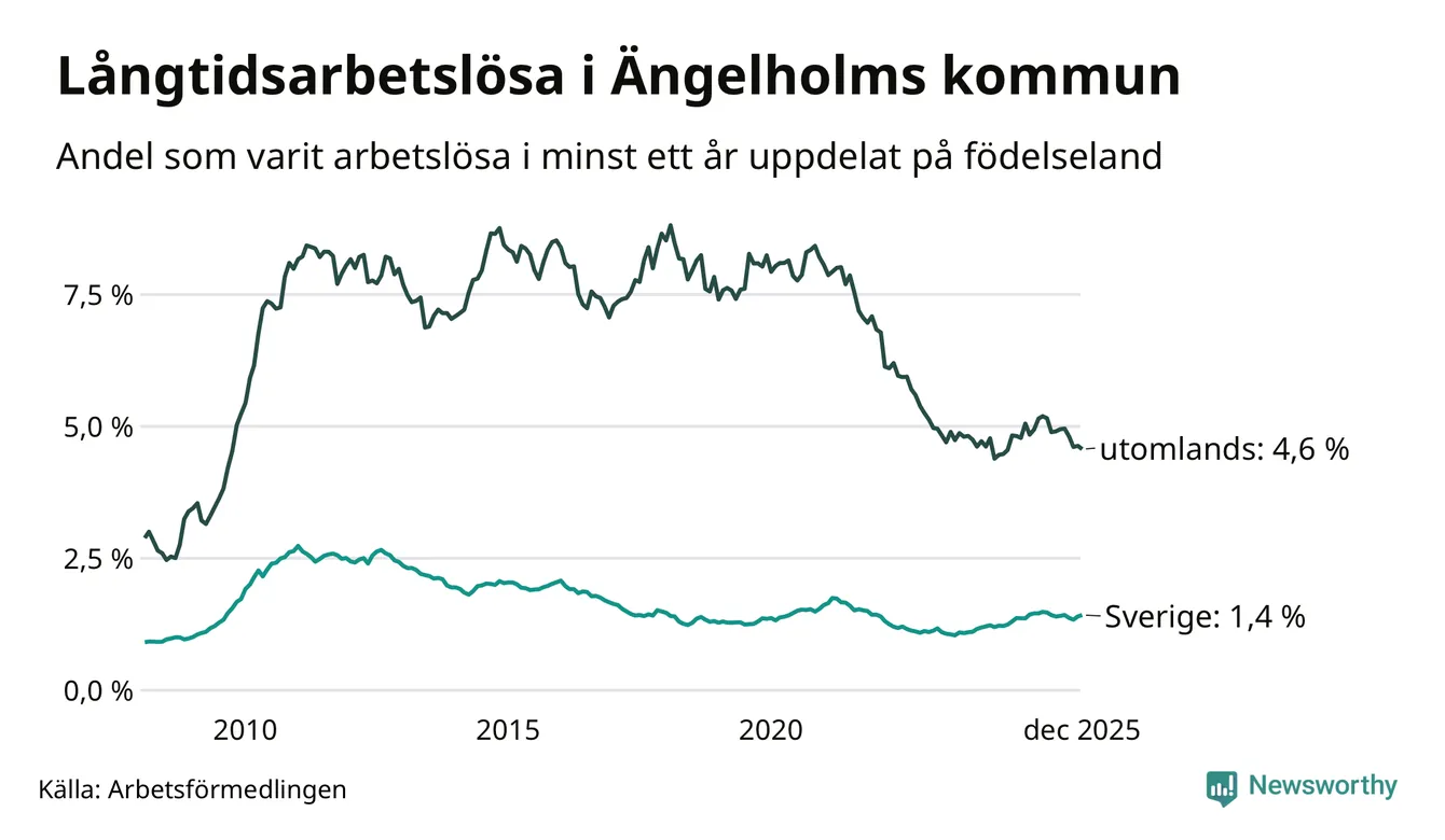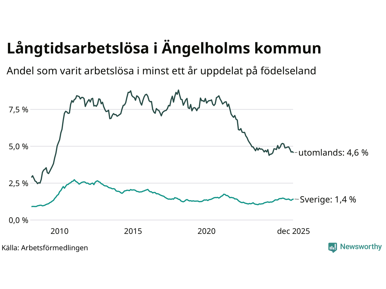260 av de långtidsarbetslösa i Ängelholm är födda i Sverige, medan 168 är födda utomlands. Det innebär att långtidsarbetslösheten bland Sverigefödda är 1,4 procent, medan den är tre gånger så hög – 4,6 procent – bland födda utomlands. Även i riket som helhet är arbetslösheten högre bland utrikesfödda.