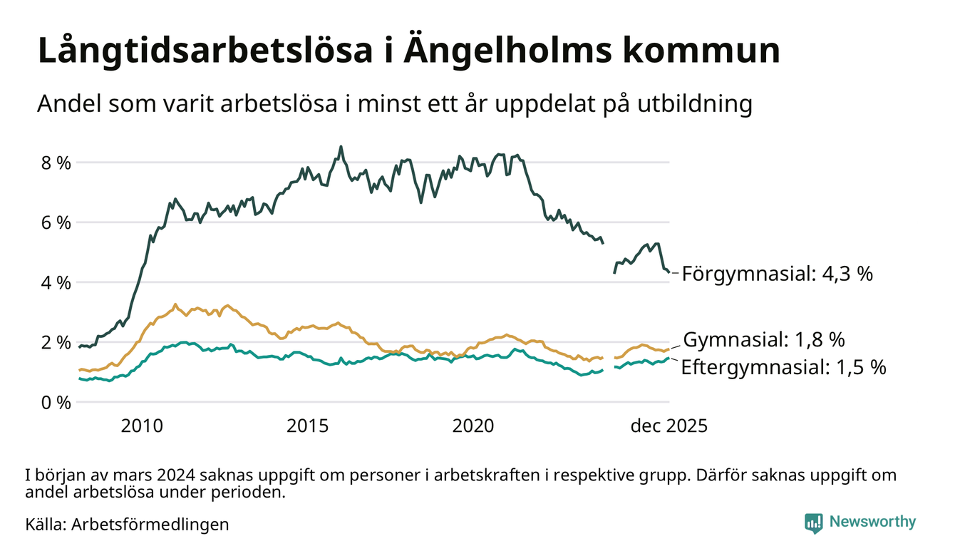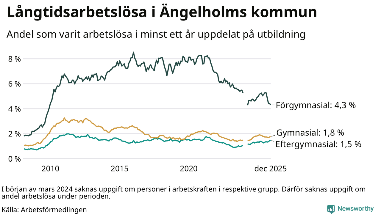 | Andel arbetslösa i minst ett år | 2,0 % | 4,0 % | 2,9 % |
