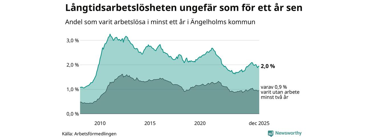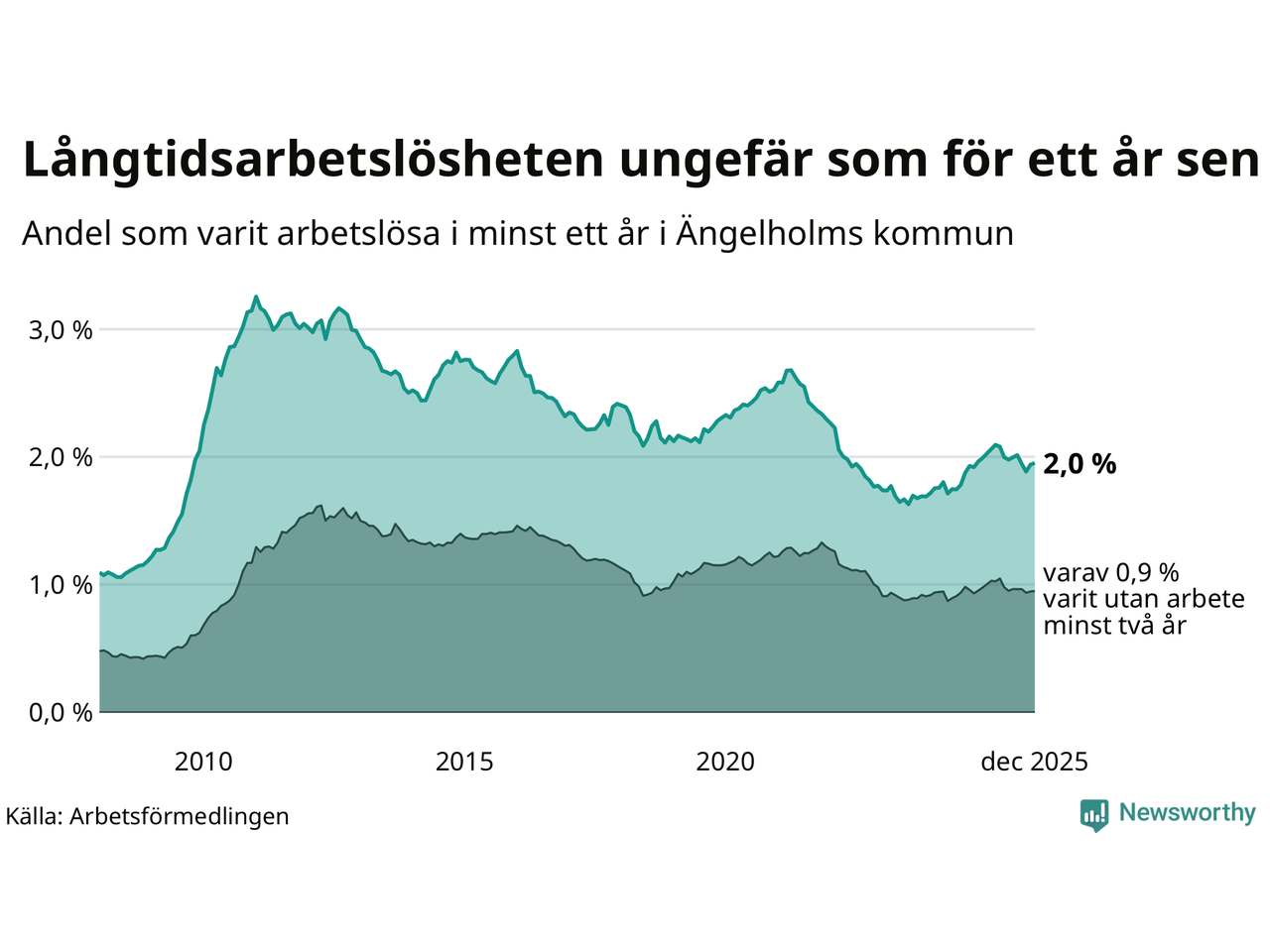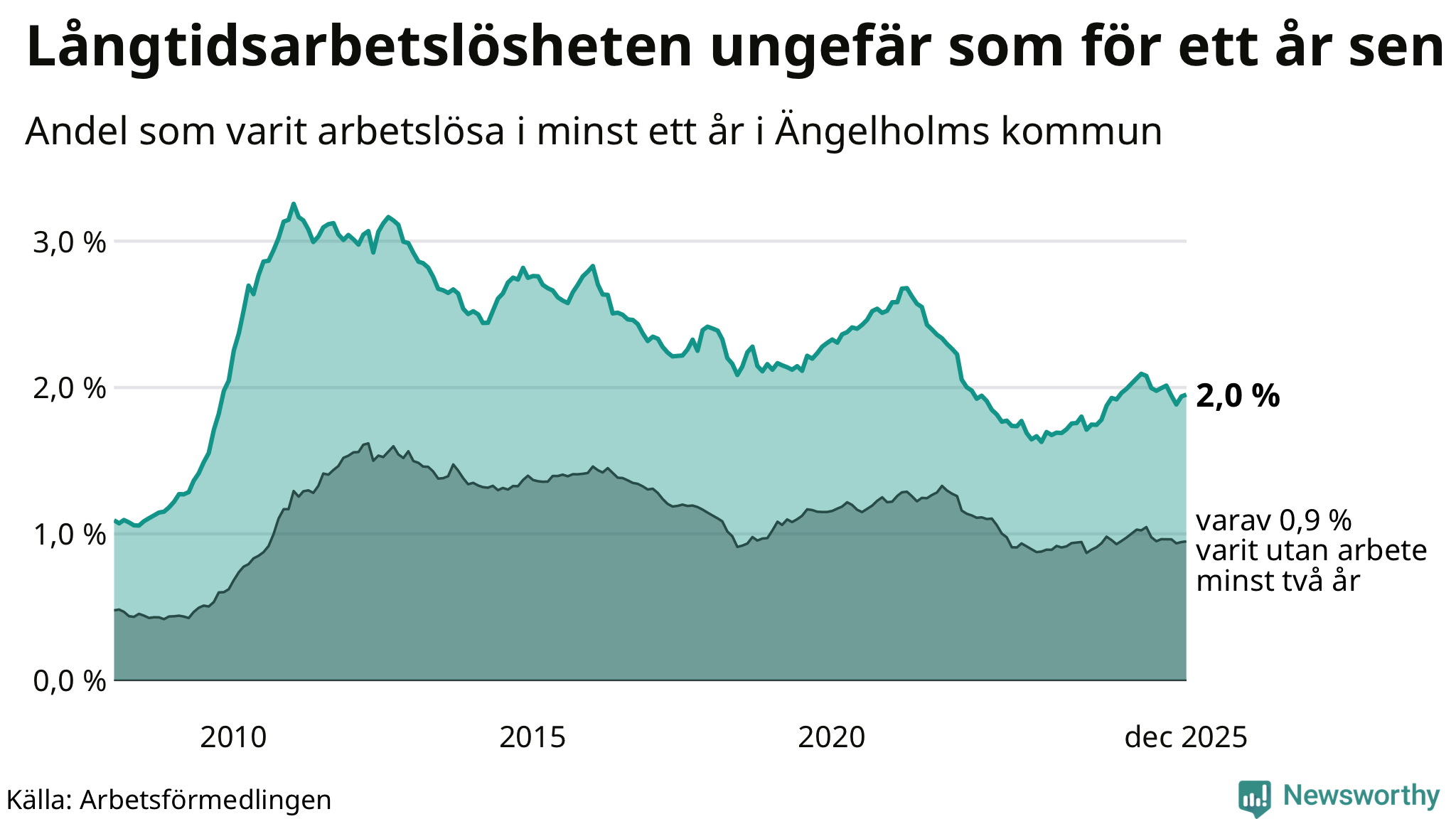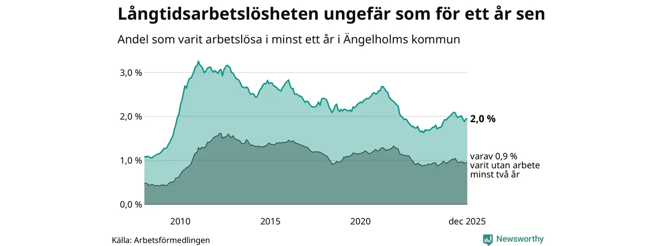I december hade 428 Ängelholmsbor varit arbetslösa i minst ett år, vilket är tre fler än månaden innan. 428 personer motsvarar 2,0 procent av arbetskraften i kommunen – andelen långtidsarbetslösa är ungefär på samma nivå som för ett år sedan.
