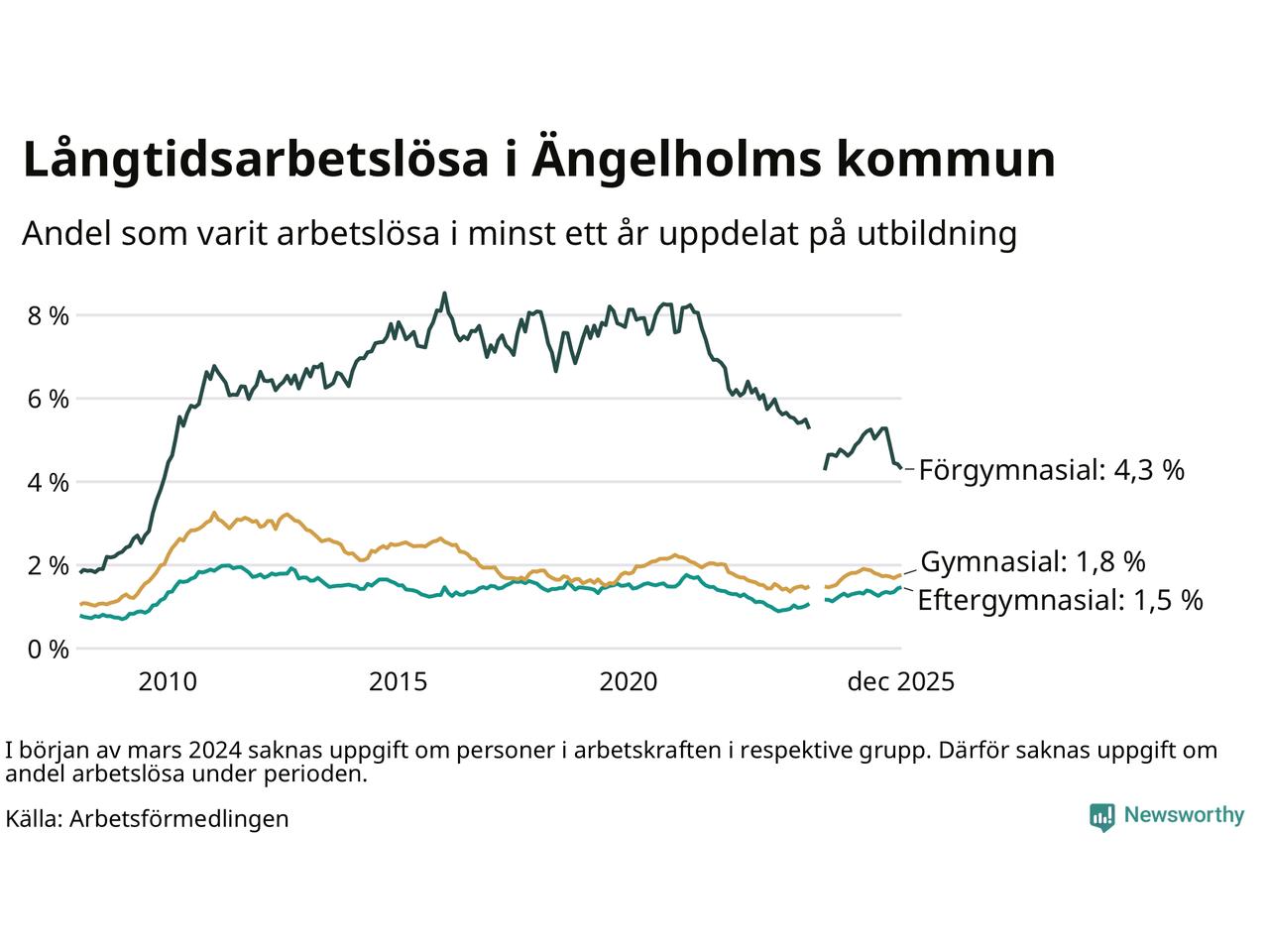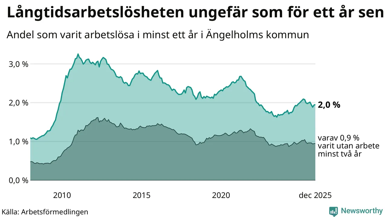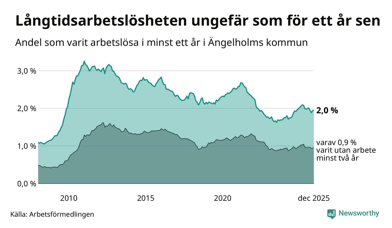 I december hade 428 Ängelholmsbor varit arbetslösa i minst ett år, vilket är tre fler än månaden innan. 428 personer motsvarar 2,0 procent av arbetskraften i kommunen – andelen långtidsarbetslösa är ungefär på samma nivå som för ett år sedan.