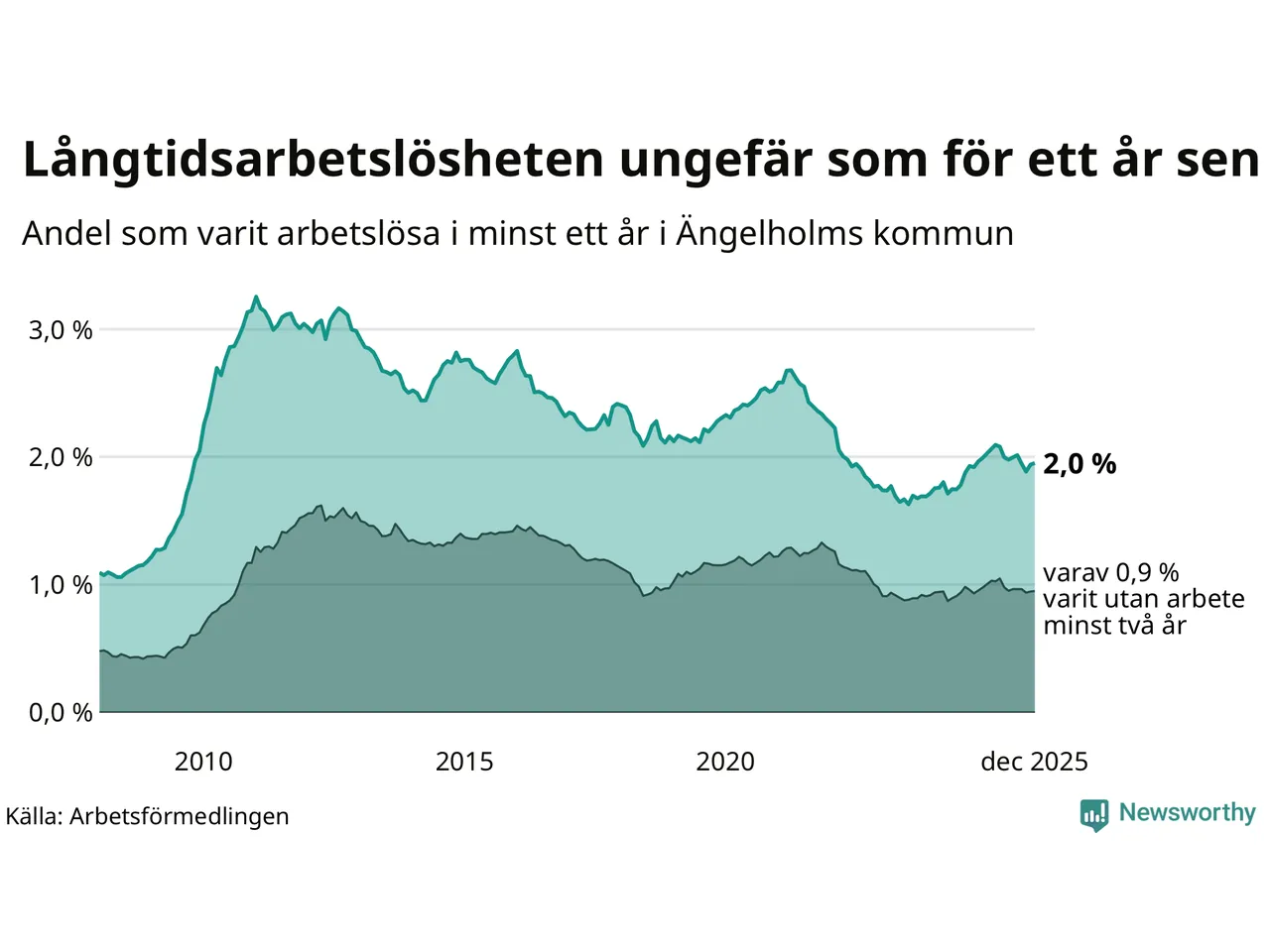 Andelen som varit utan arbete i minst ett år i Ängelholm var ungefär lika stor i december jämfört med samma månad för ett år sedan. Det visar Arbetsfömedlingens senaste månadsstatistik.