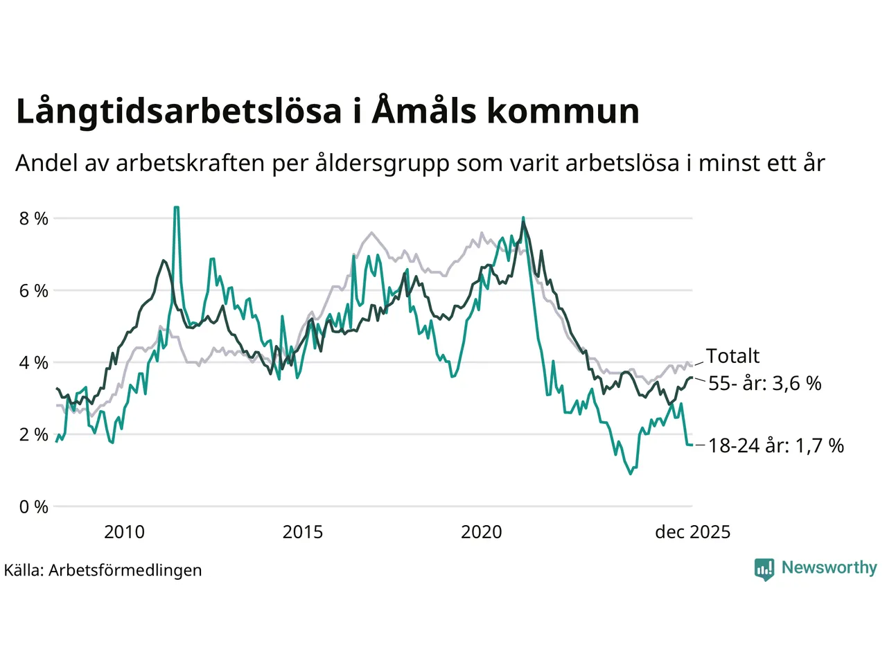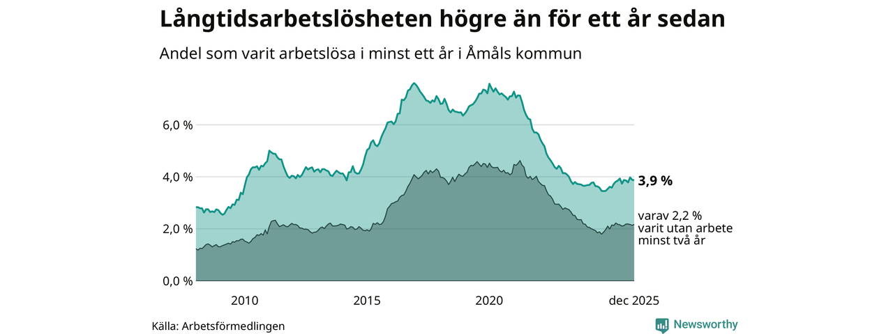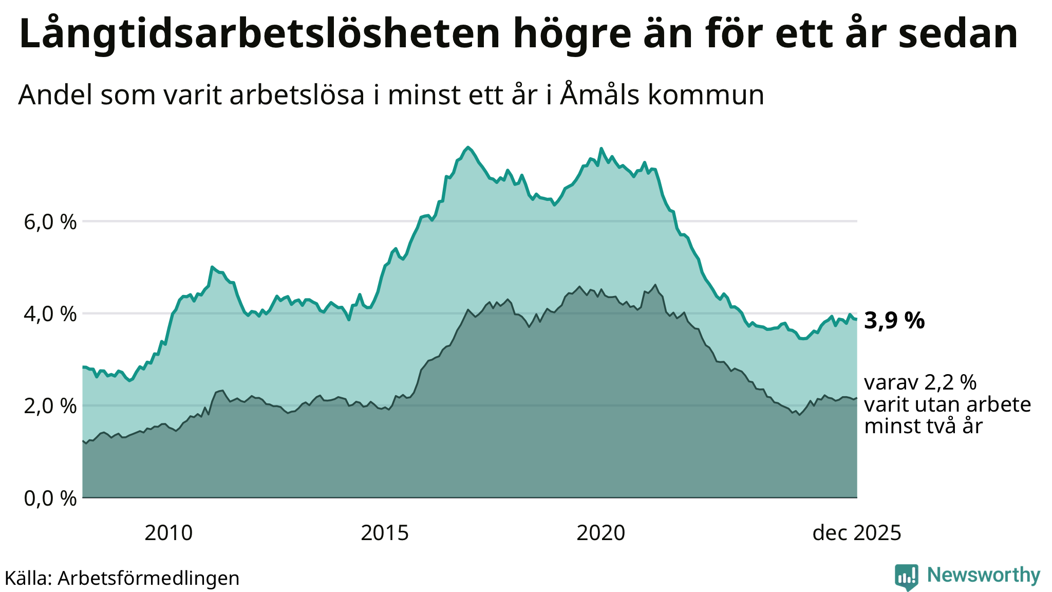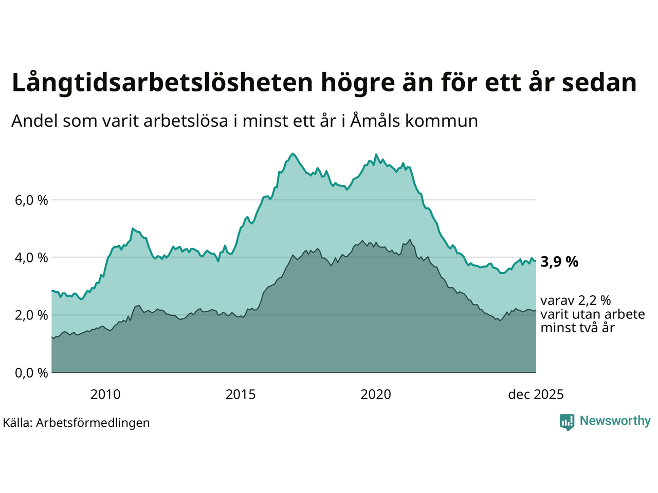 I december hade 205 Åmålsbor varit arbetslösa i minst ett år, vilket är en färre än månaden innan. 205 personer motsvarar 3,9 procent av arbetskraften i kommunen – andelen långtidsarbetslösa är 0,3 procentenheter högre än samma månad för ett år sedan.