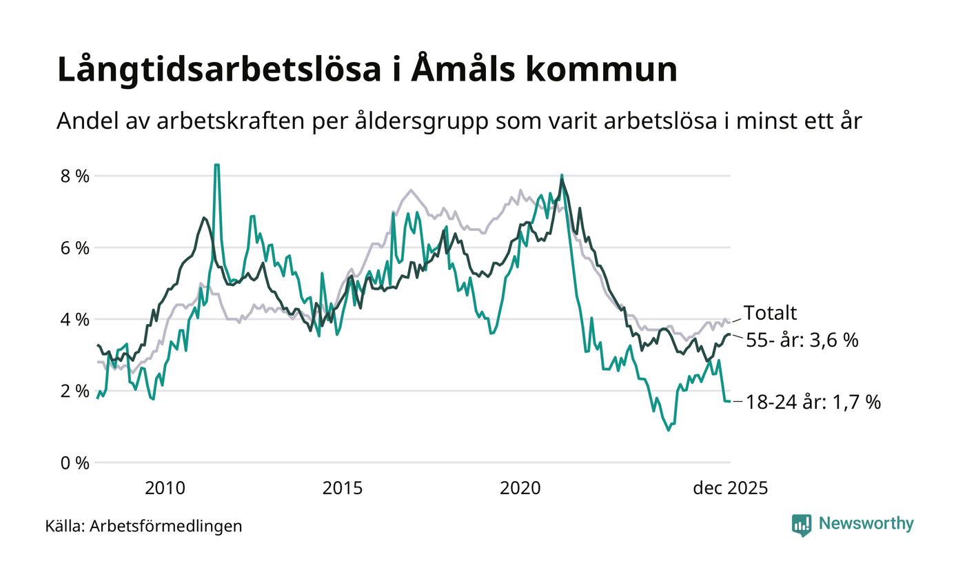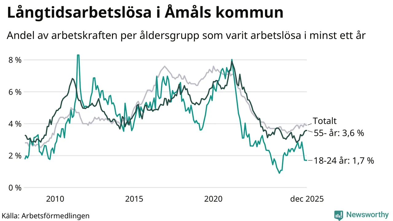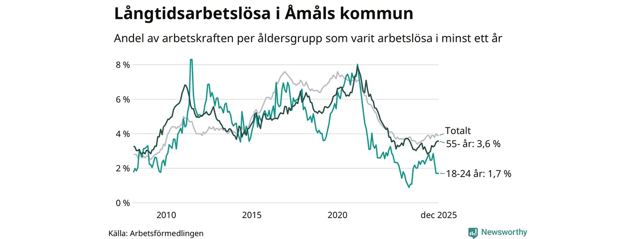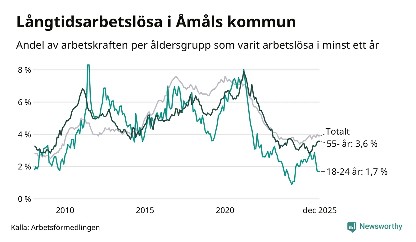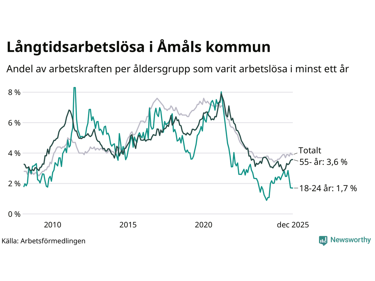 I december hade 205 Åmålsbor varit arbetslösa i minst ett år, vilket är en färre än månaden innan. 205 personer motsvarar 3,9 procent av arbetskraften i kommunen – andelen långtidsarbetslösa är 0,3 procentenheter högre än samma månad för ett år sedan.