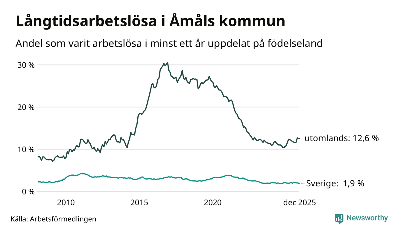 83 av de långtidsarbetslösa i Åmål är födda i Sverige, medan 122 är födda utomlands. Det innebär att långtidsarbetslösheten bland Sverigefödda är 1,9 procent, medan den är sju gånger så hög – 12,6 procent – bland födda utomlands. Även i riket som helhet är arbetslösheten högre bland utrikesfödda.