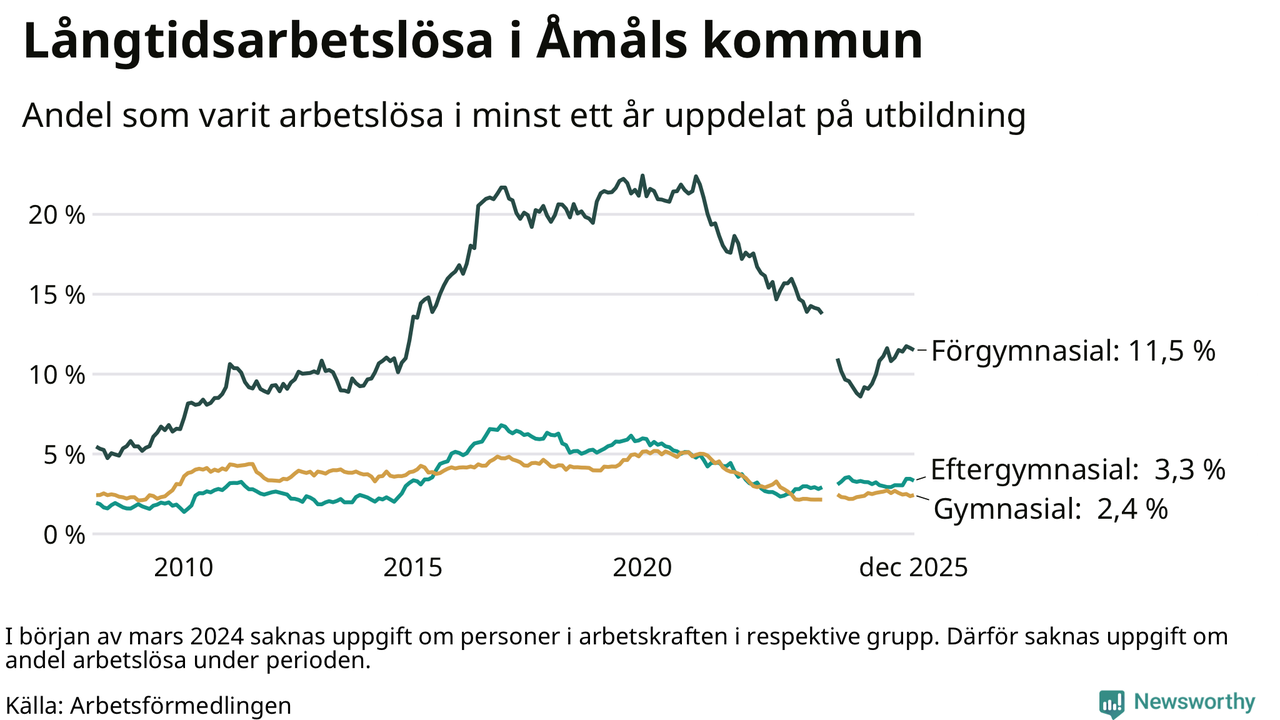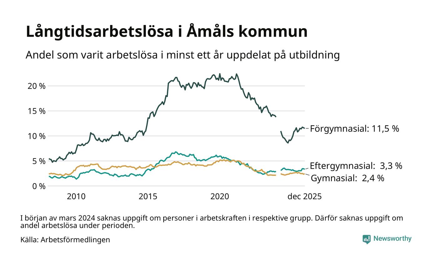 Graf: Andel arbetslösa i Åmål som varit utan arbete i minst 12 månader